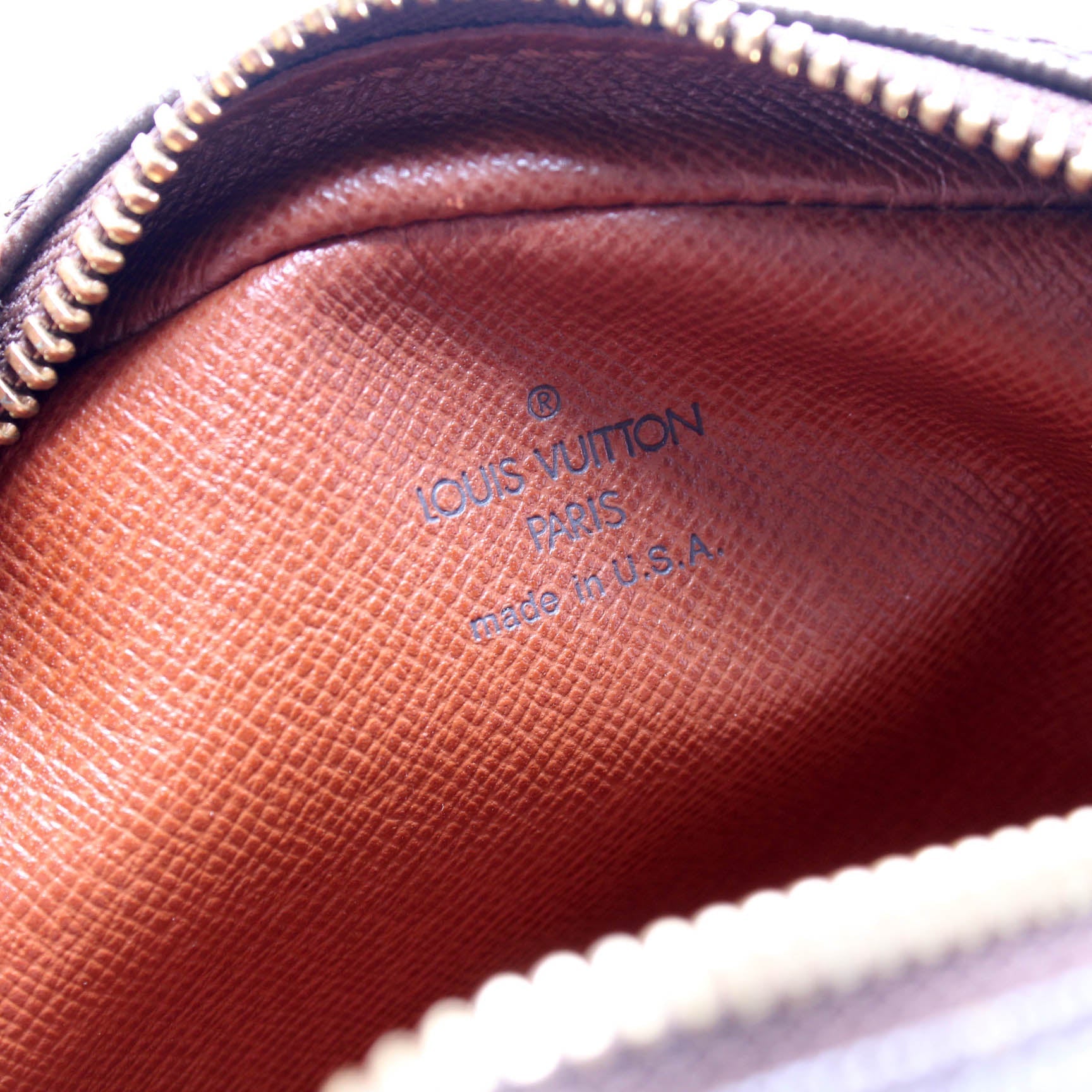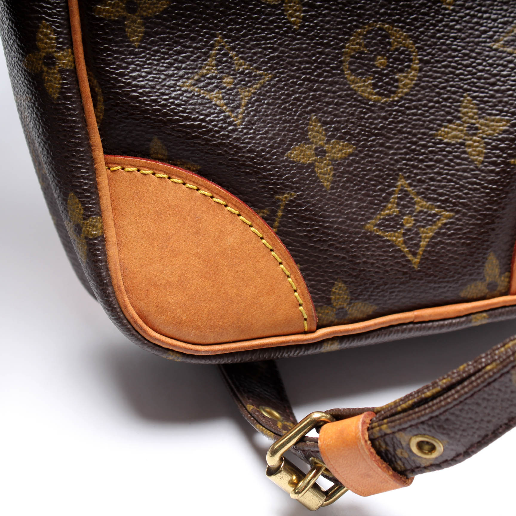 Exterior: The exterior coated canvas is free of any rips or cracks. The corners and leather details show discoloration. The exterior features one open pocket.