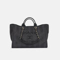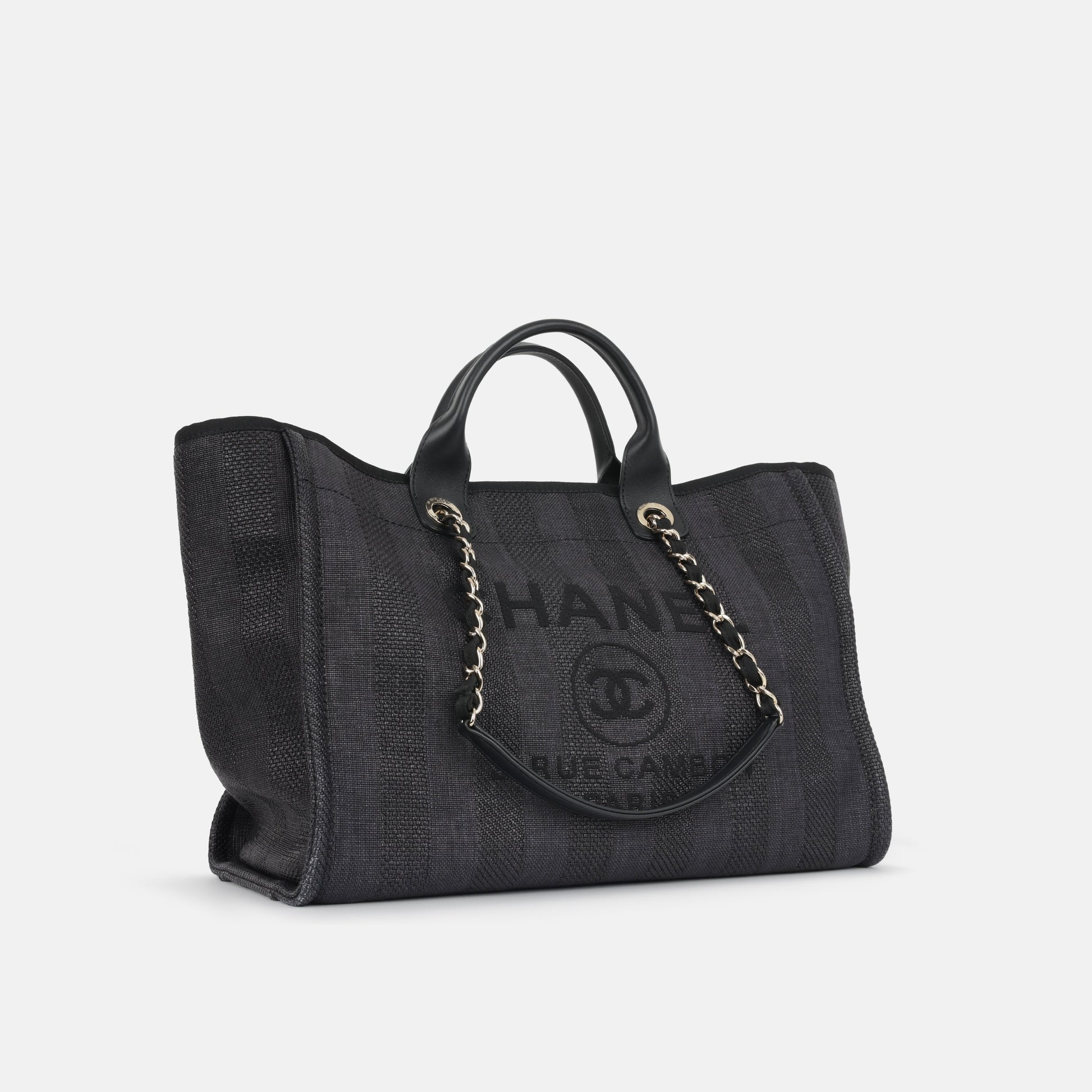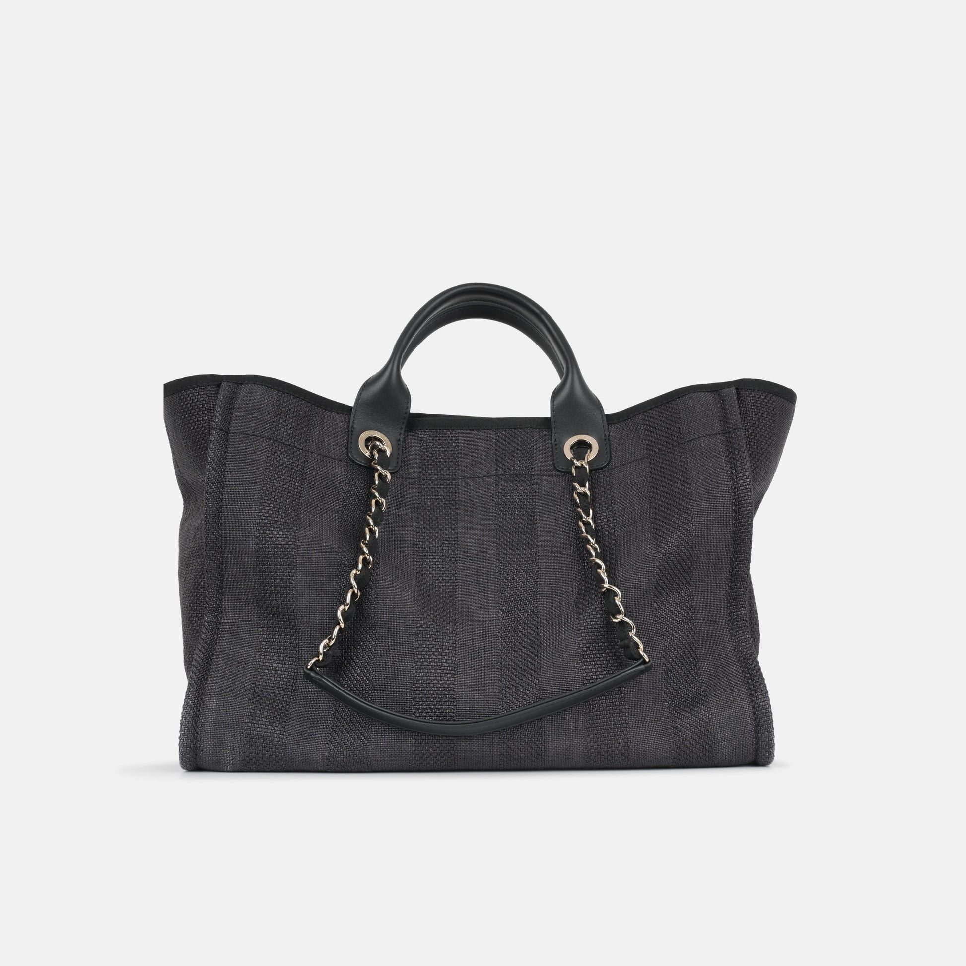 Carefully crafted from mixed striped blue raffia with navy leather trims, the Chanel Deauville handbag is beyond stunning. It's spacious enough to hold everything you would need throughout the day, the Deauville is suitable for travelling, a day at the beach or just running errands.