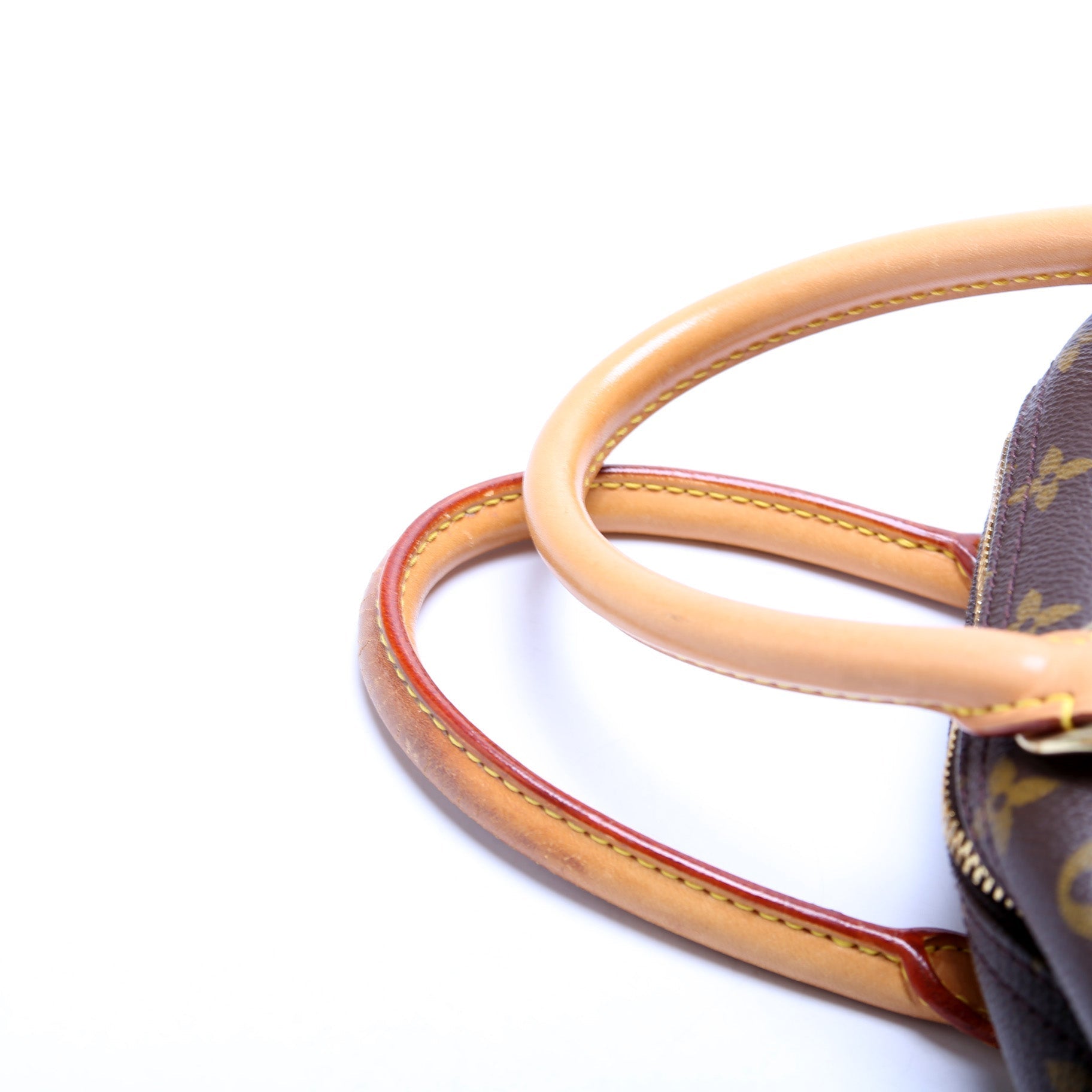 Exterior: The exterior Monogram coated canvas is free of any rips or cracks. The corners and leather details show light wear and discoloration. The exterior features one open pocket.