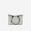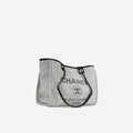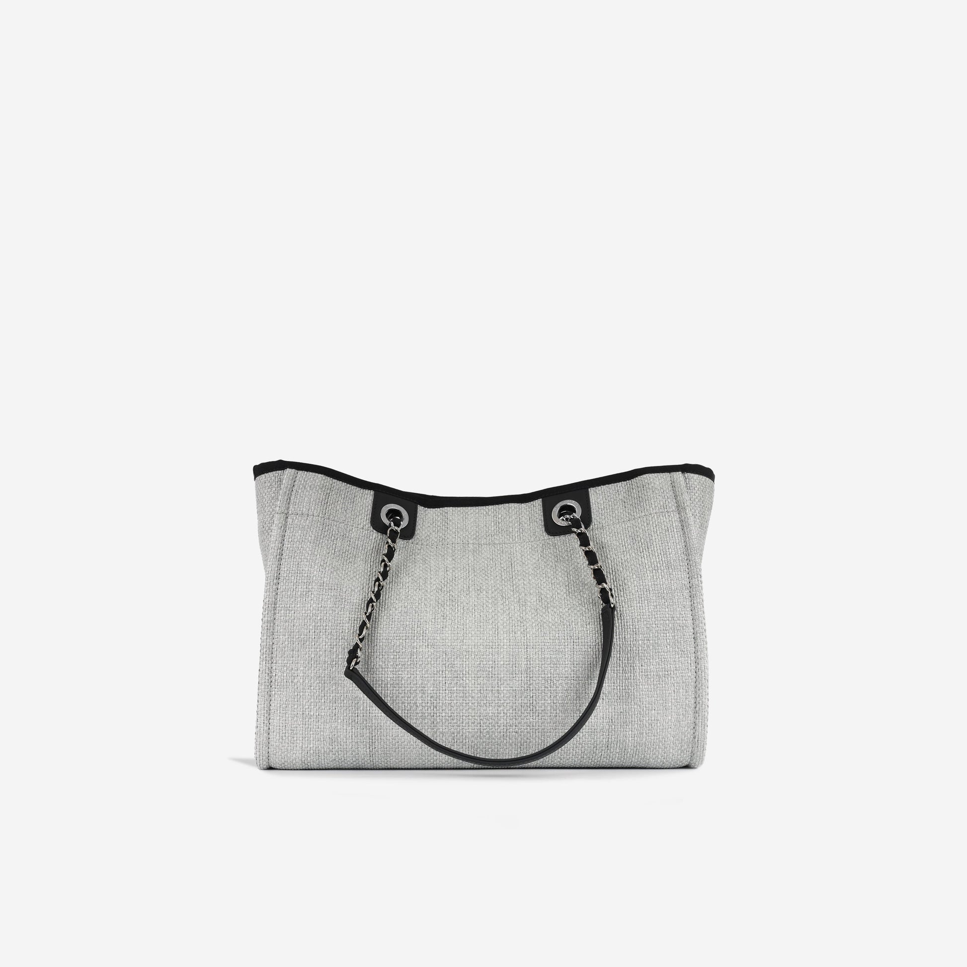 Carefully crafted from grey raffia with black fabric trims with silver hardware, this Chanel Deauville handbag is truly stunning. to say the very least. Spacious enough to hold everything one would need throughout their day, the Deauville is suitable for travelling, a day at the beach or just basic daily usage.