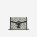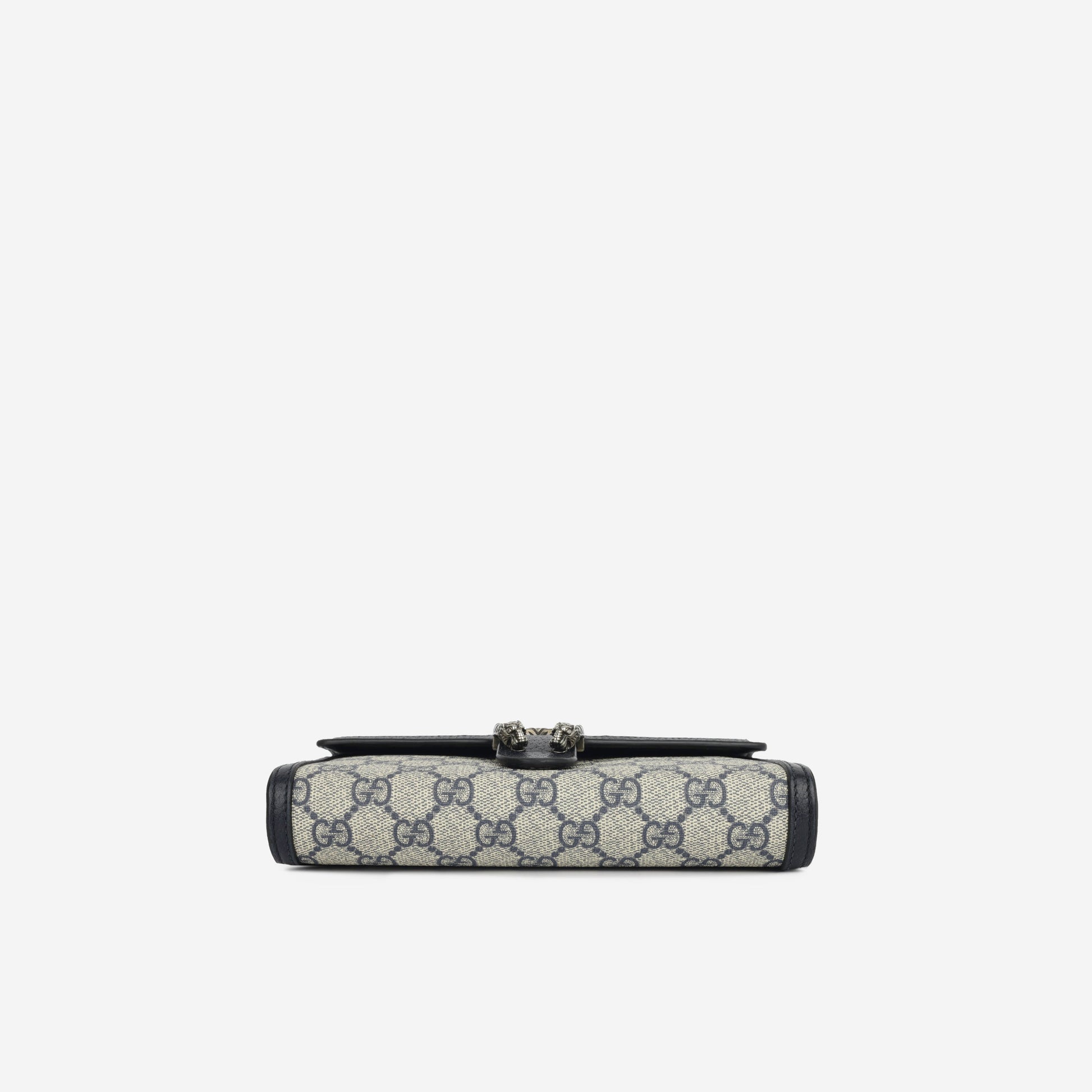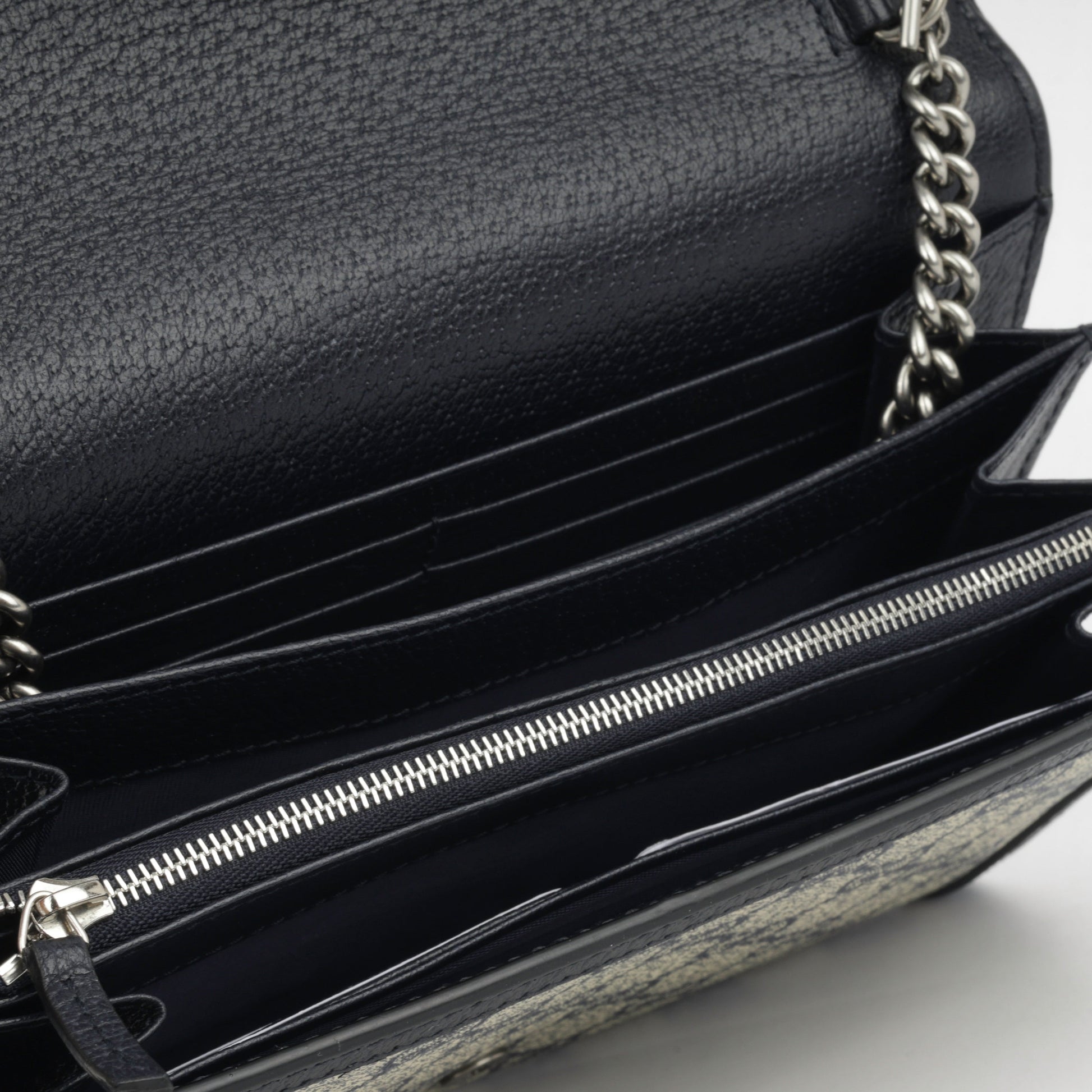 The very popular Gucci signature GG motif has been worked into the classic Dionysus Chain Wallet. Made in Italy, the Dionysus shoulder bag is suspended from a shoulder chain that can be worn multiple ways. The tiger head remains an eye catching feature on this defining silhouette. The Dionysus Chain Wallet is the perfect statement handbag to be added to any collection, and perfect classic piece for your next night out.
