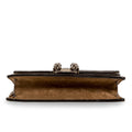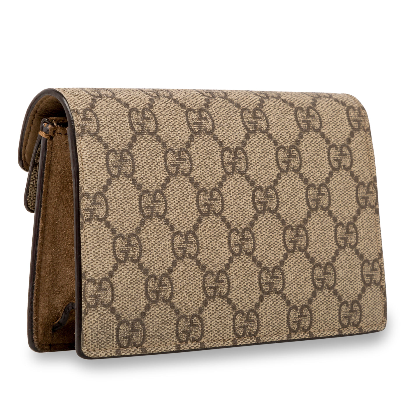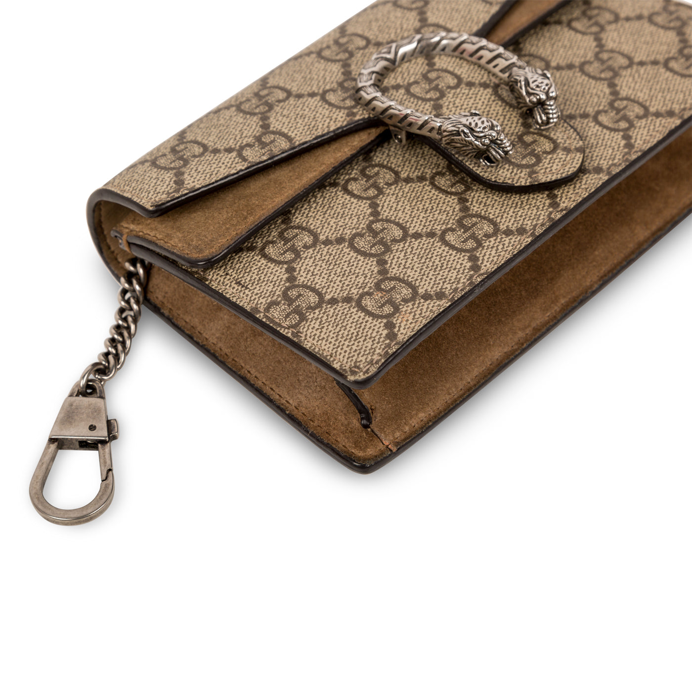 Inspired by the Greak God of wine and celebration, Dionysus. The Dionysus collection by Gucci are perfect bags to take out for special occasions. Decorated with the GG Supreme print and the unique tiger head spur closure – exclusive to the Dionysus collection. This mini bag comes with a key chain to attach any accessory or any bag. The shoulder chain has a drop of 60 cm, perfect for cross body and over the shoulder use. Style this bag with a Gucci T shirt and jeans for a casual look, or a dark shaded dress and heels for evening wear and partying.