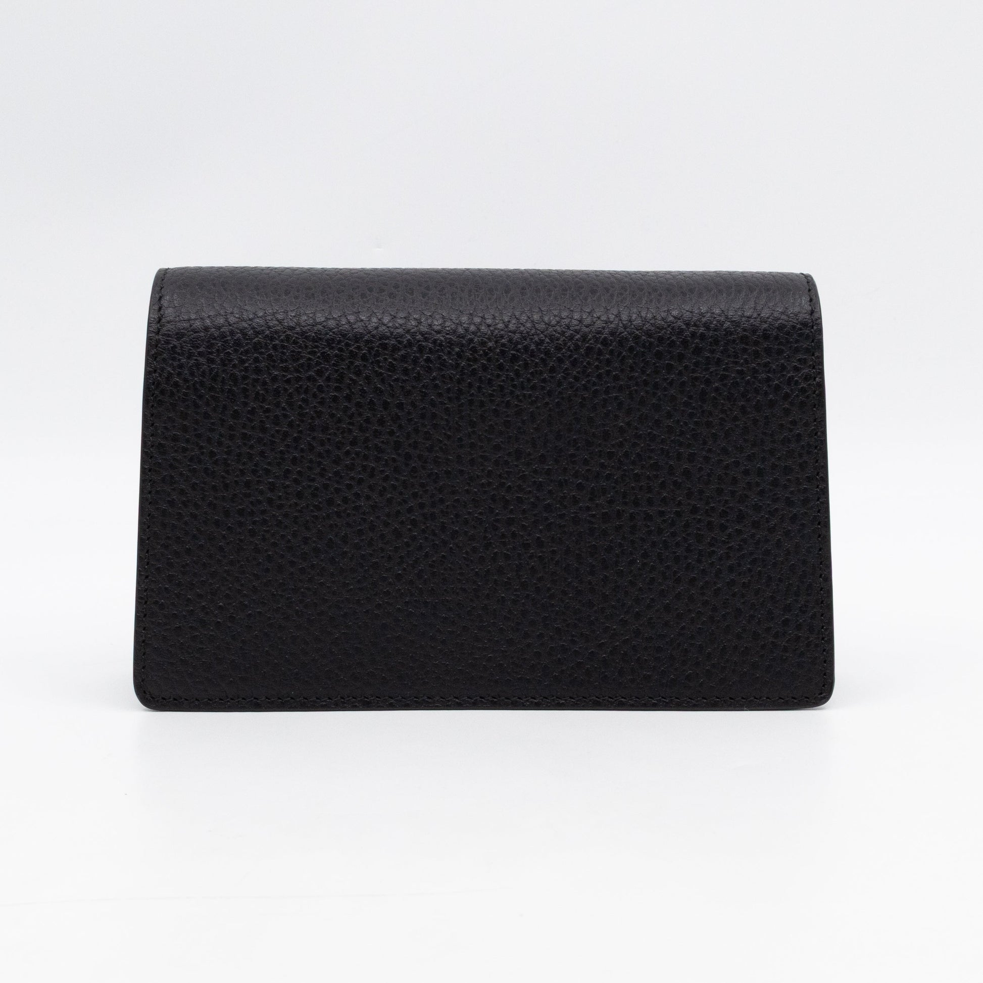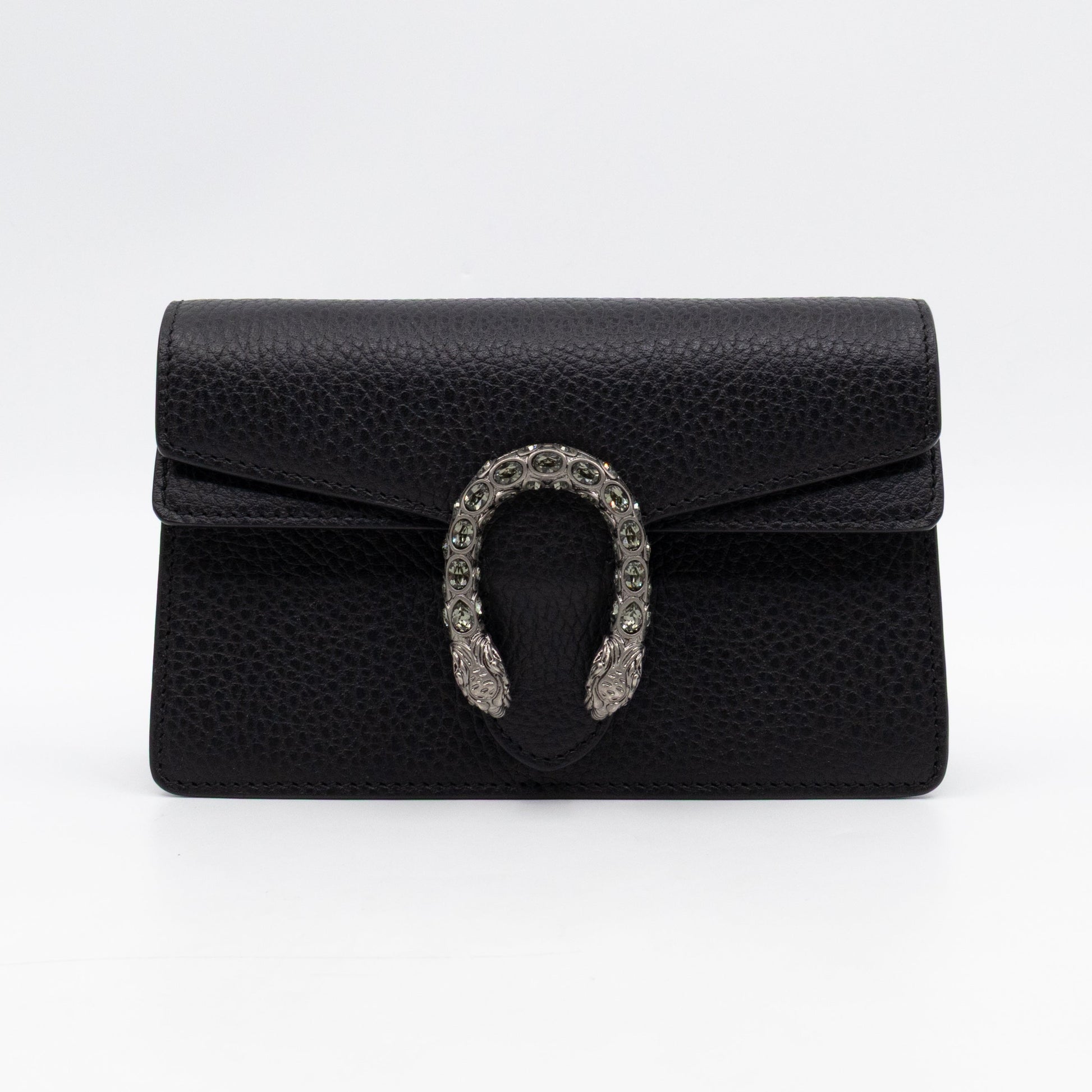 Dionysus is one of Gucci's modern classics. This super mini is made with black leather, combined with beige inside lining and silver-tone hardware. On the front a textured tiger head closure with silver-tone and crystals, a unique detail referencing the Greek god Dionysus. Inside fits your phone and card case, phone max size about iPhone 14. Carry it crossbody with the long chain. Current retail price is €980.