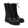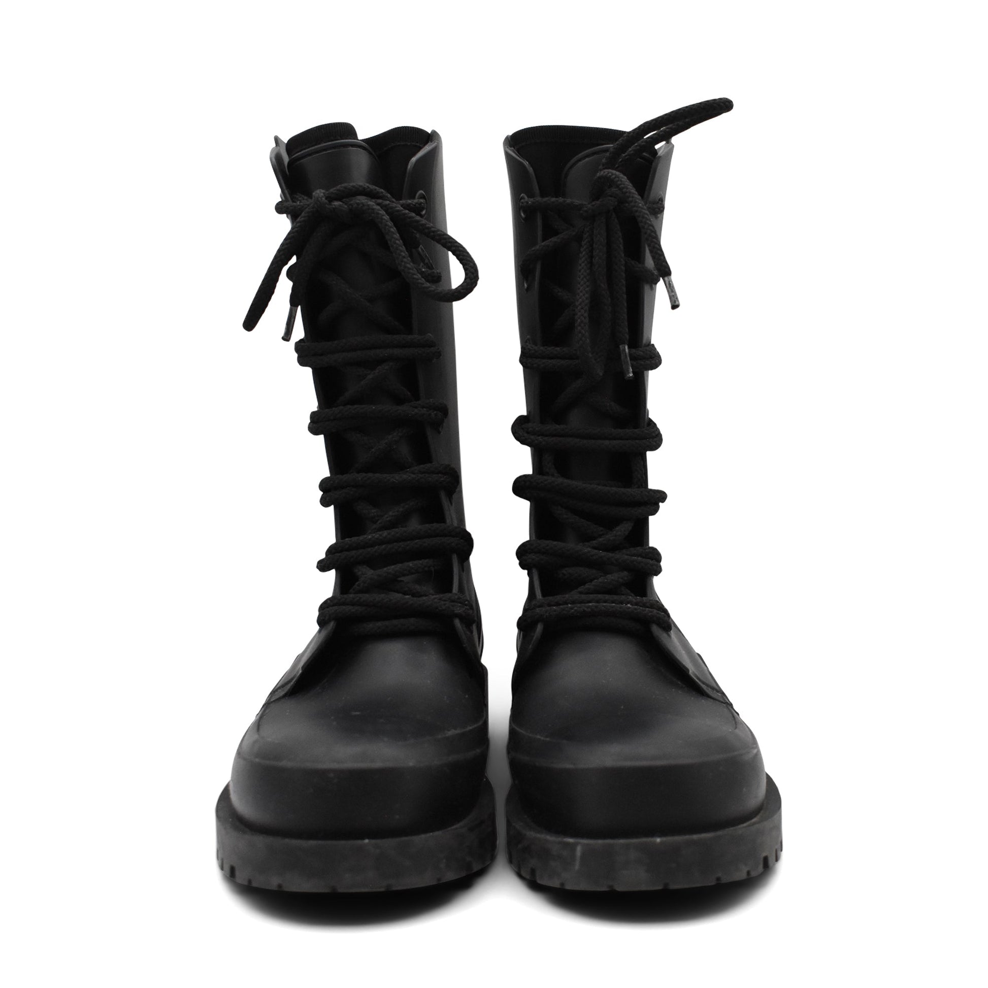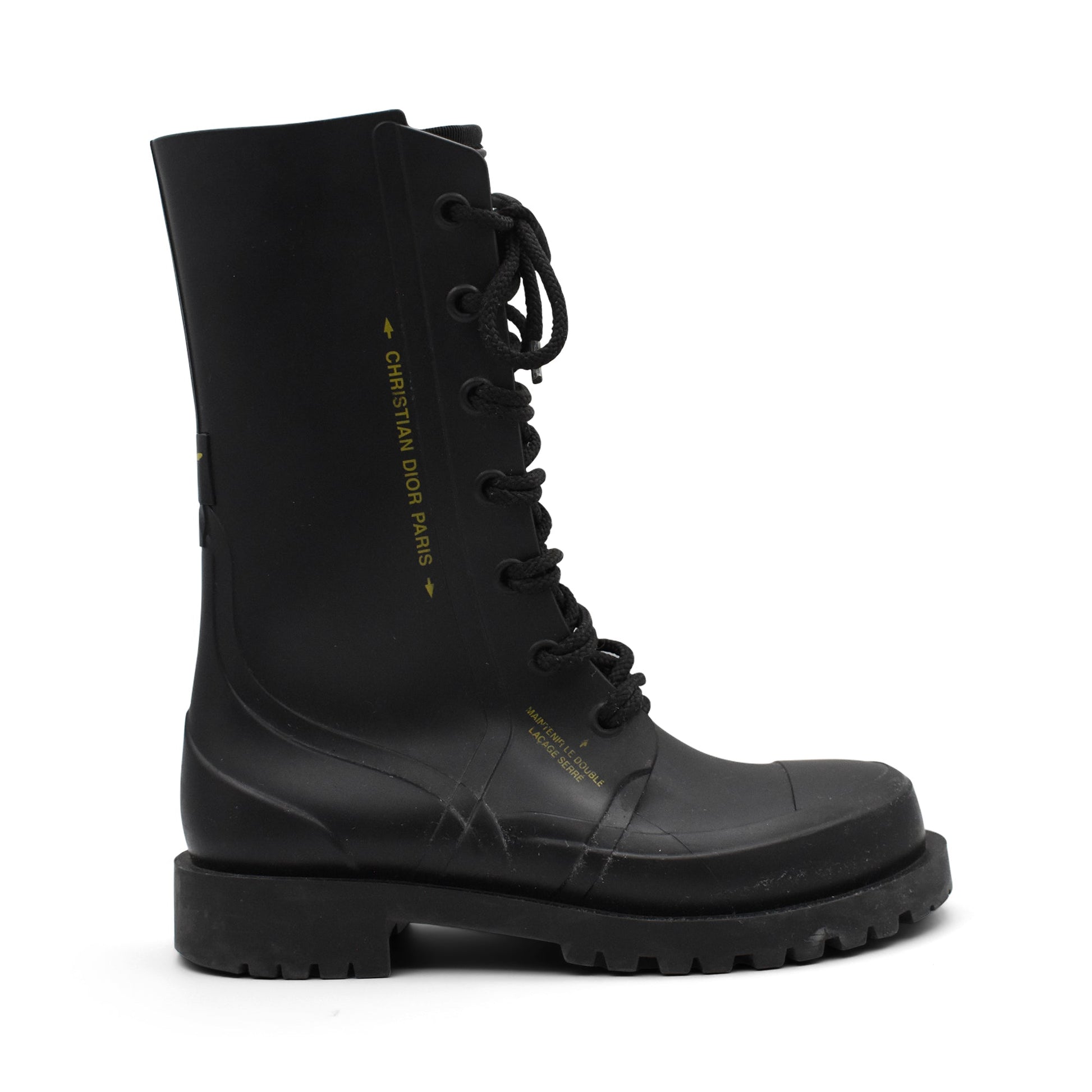 Christian Dior 'Dior Camp' mid-calf black rubber combat boots with a lace-up closure, a stretch inner lining, and small gold writing on the sides.