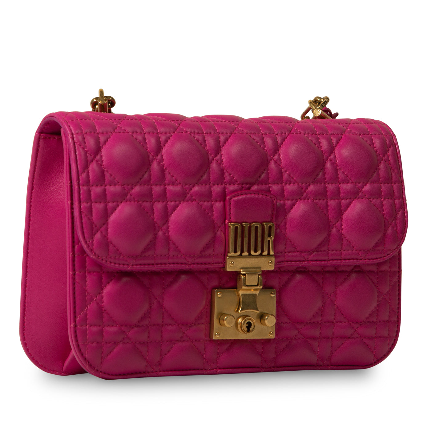 Carefully crafted from smooth pink leather featuring gold tone hardware and studs and prominent Dior logo, is made for the modern young woman with a fashion forward sense of style. This Dioraddict is edgy, playful and effortlessly chic, this bag is the ideal compliment to any casual look. Whether you're running errands or grabbing coffee with your girlfriends, the DiorAddict is the perfect companion.