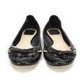 Dior flats in quilted black patent leather with gold chain hardware and a bow on the toe.