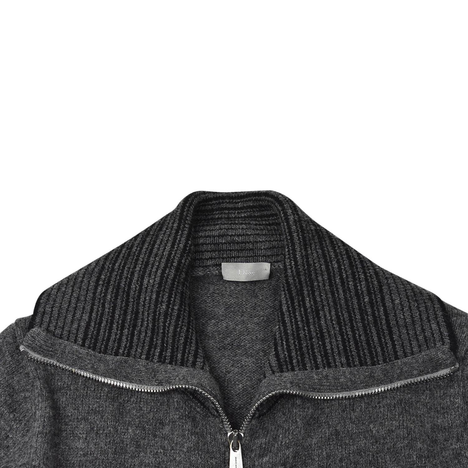 Dior Homme zip-up sweater in grey wool with a striped collar and silver hardware.