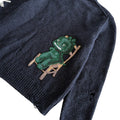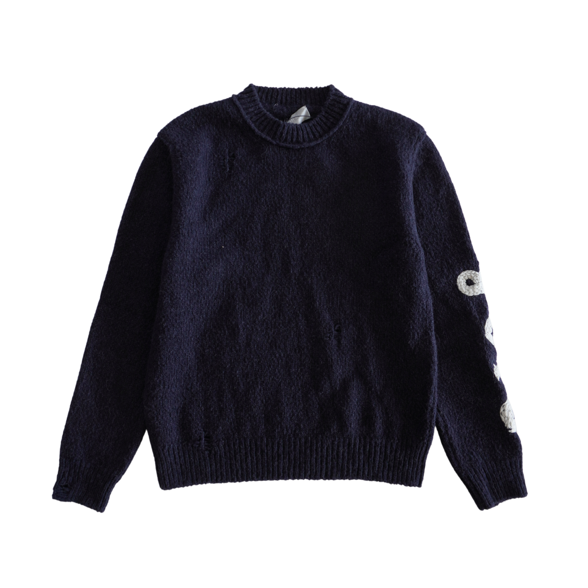 Dior Homme x Otoni Workshop knit sweater in navy fuzzy wool with distressing rips throughout, a white logo embroidered on the sleeve, and an embroidered green monster patch on the back.