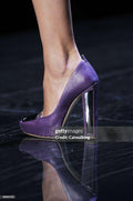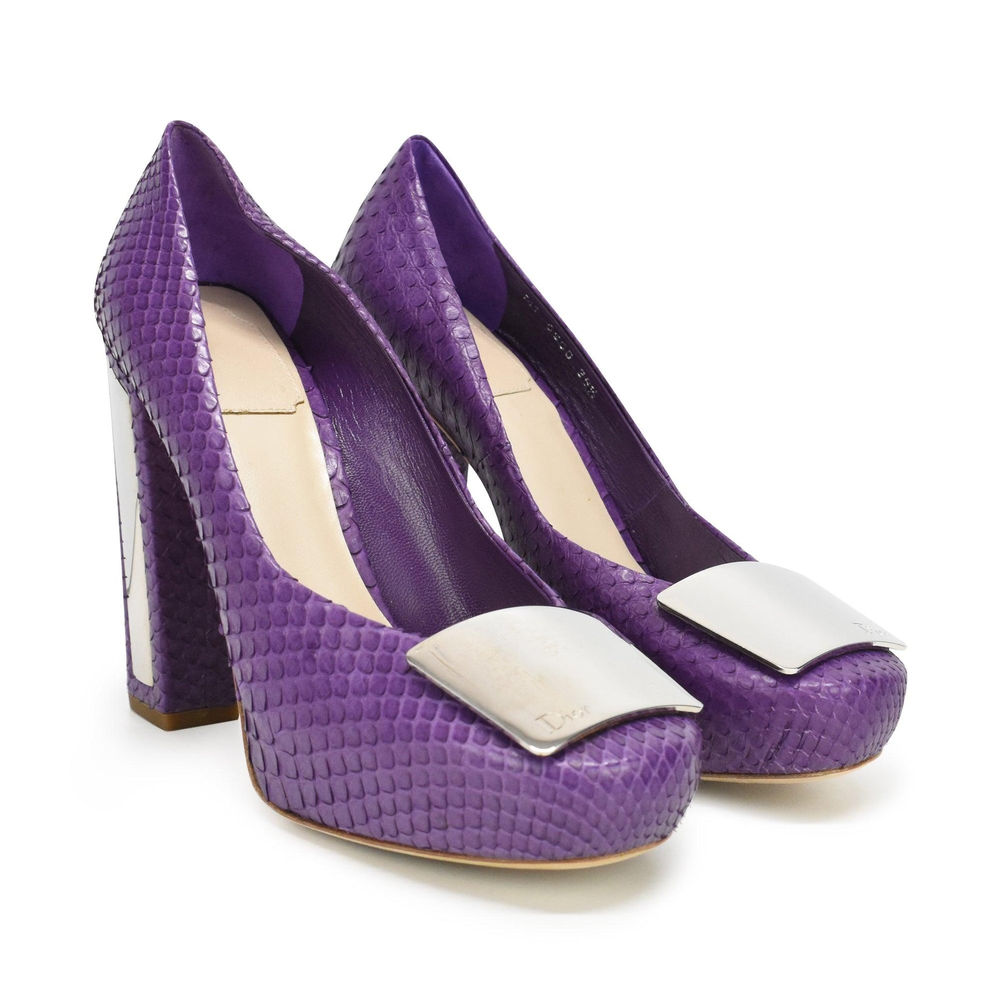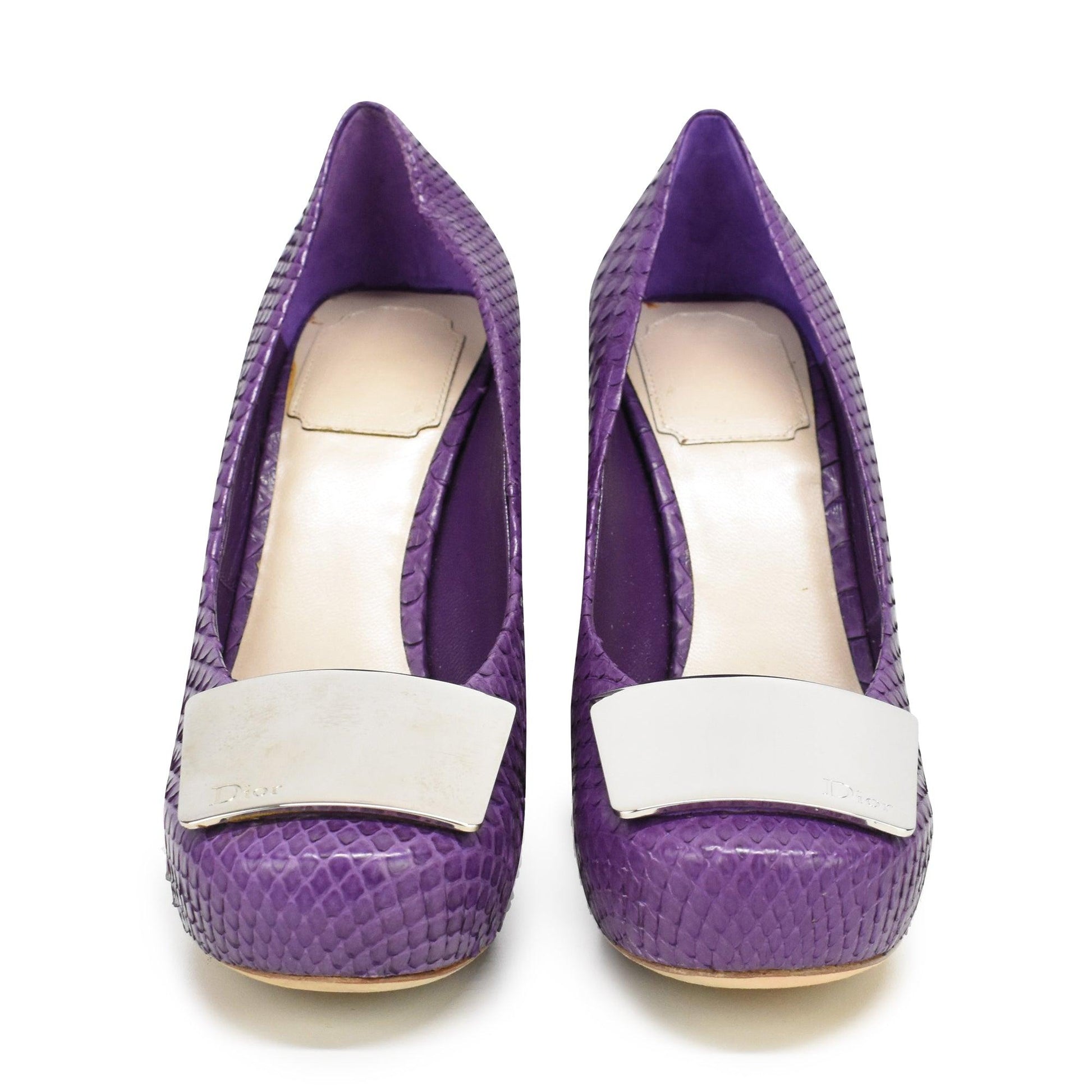 Christian Dior purple snakeskin pumps from their fall 2008 ready-to-wear collection by John Galliano. Feature block heels with a silver metal detail panels and silver logo plaques on the toe box.