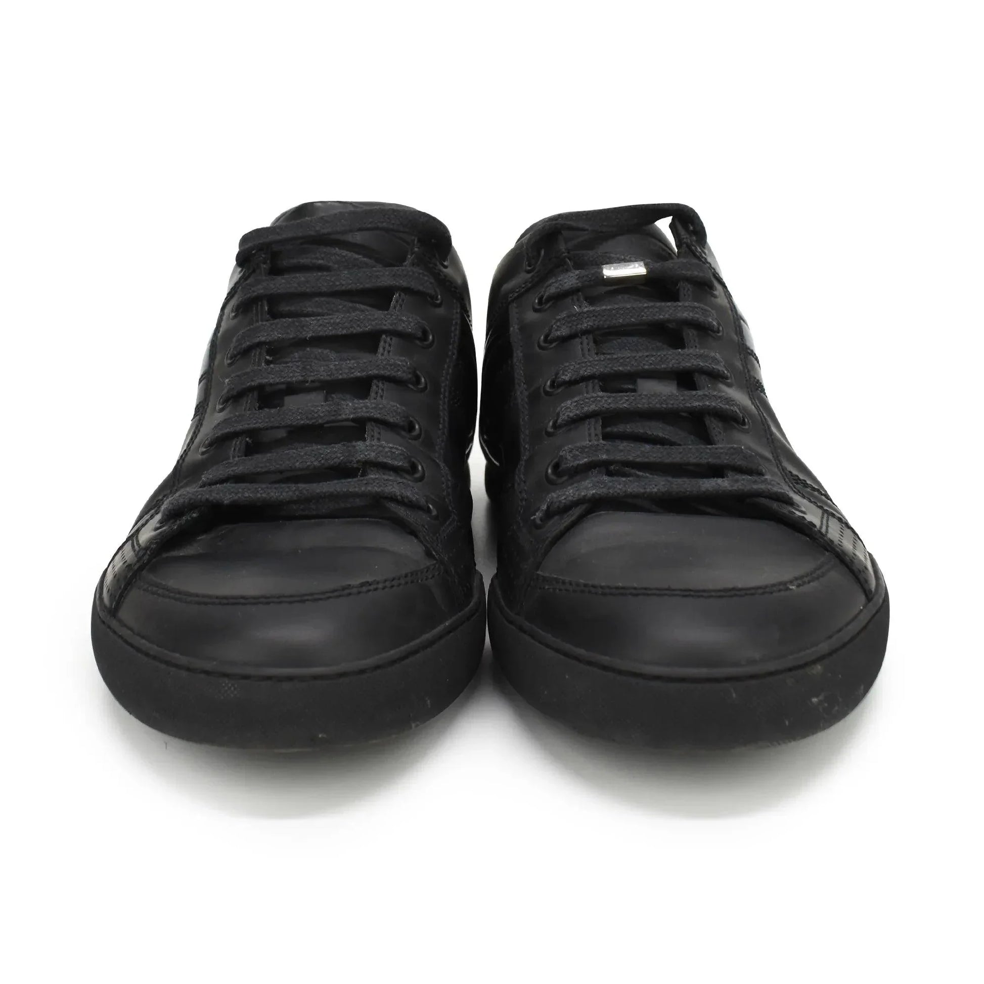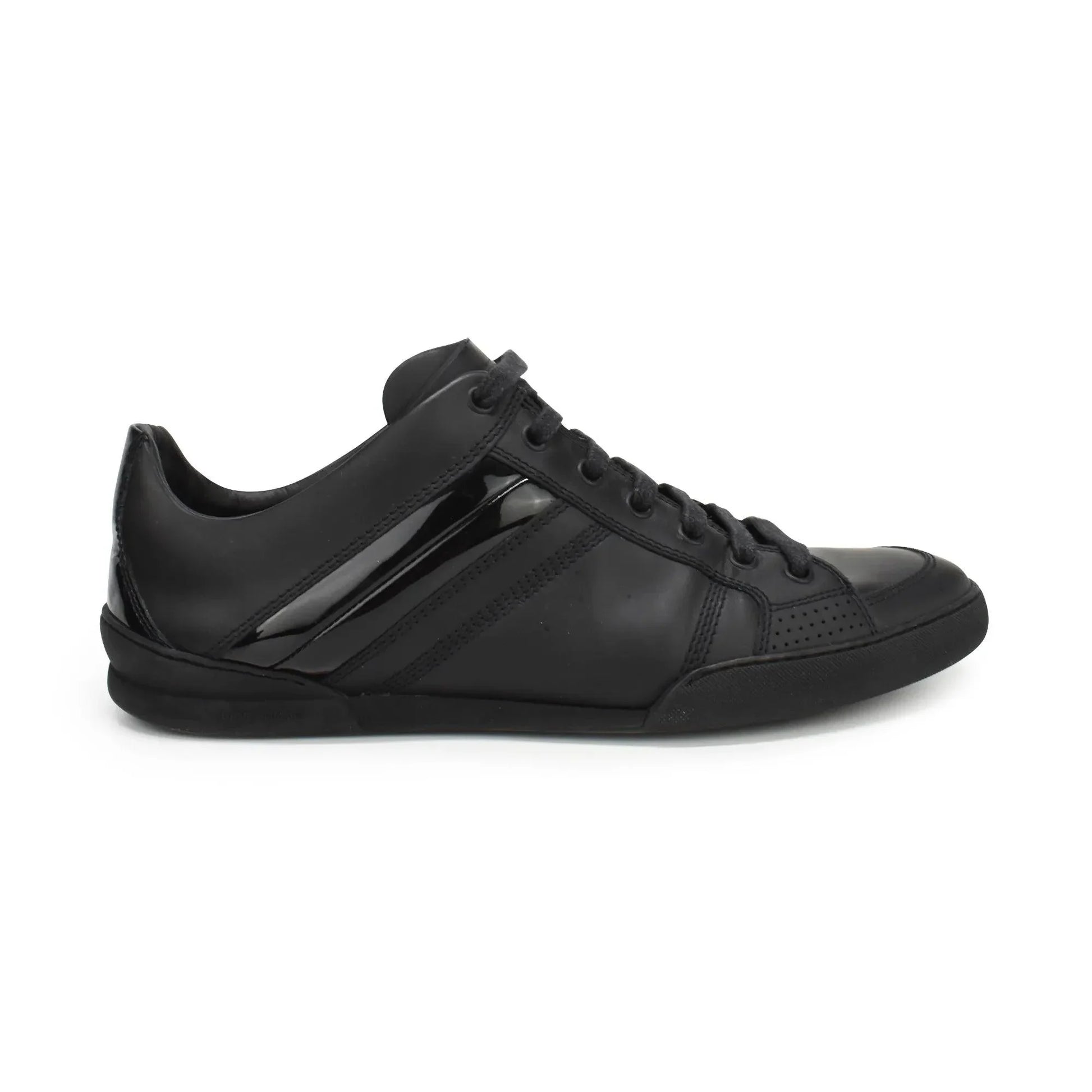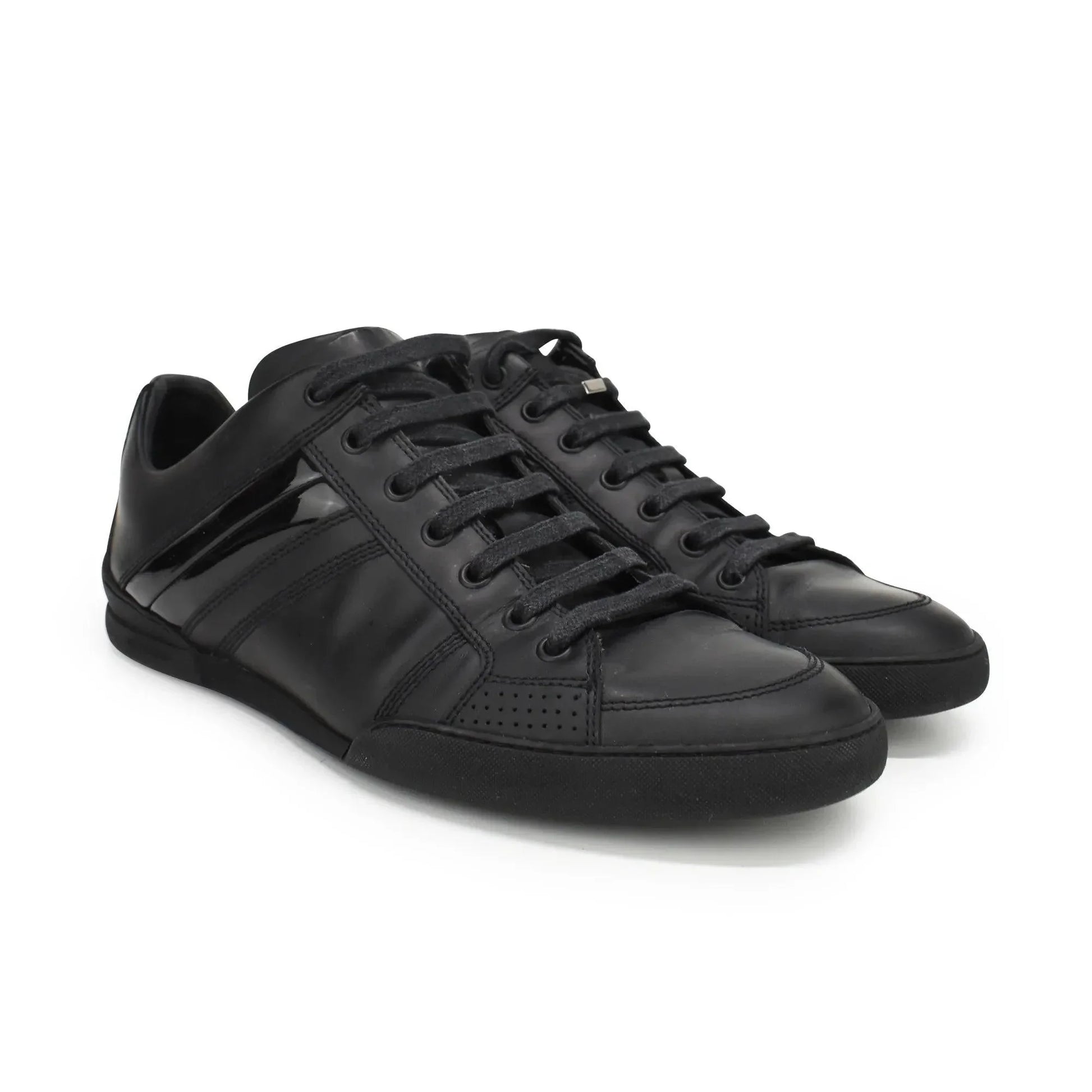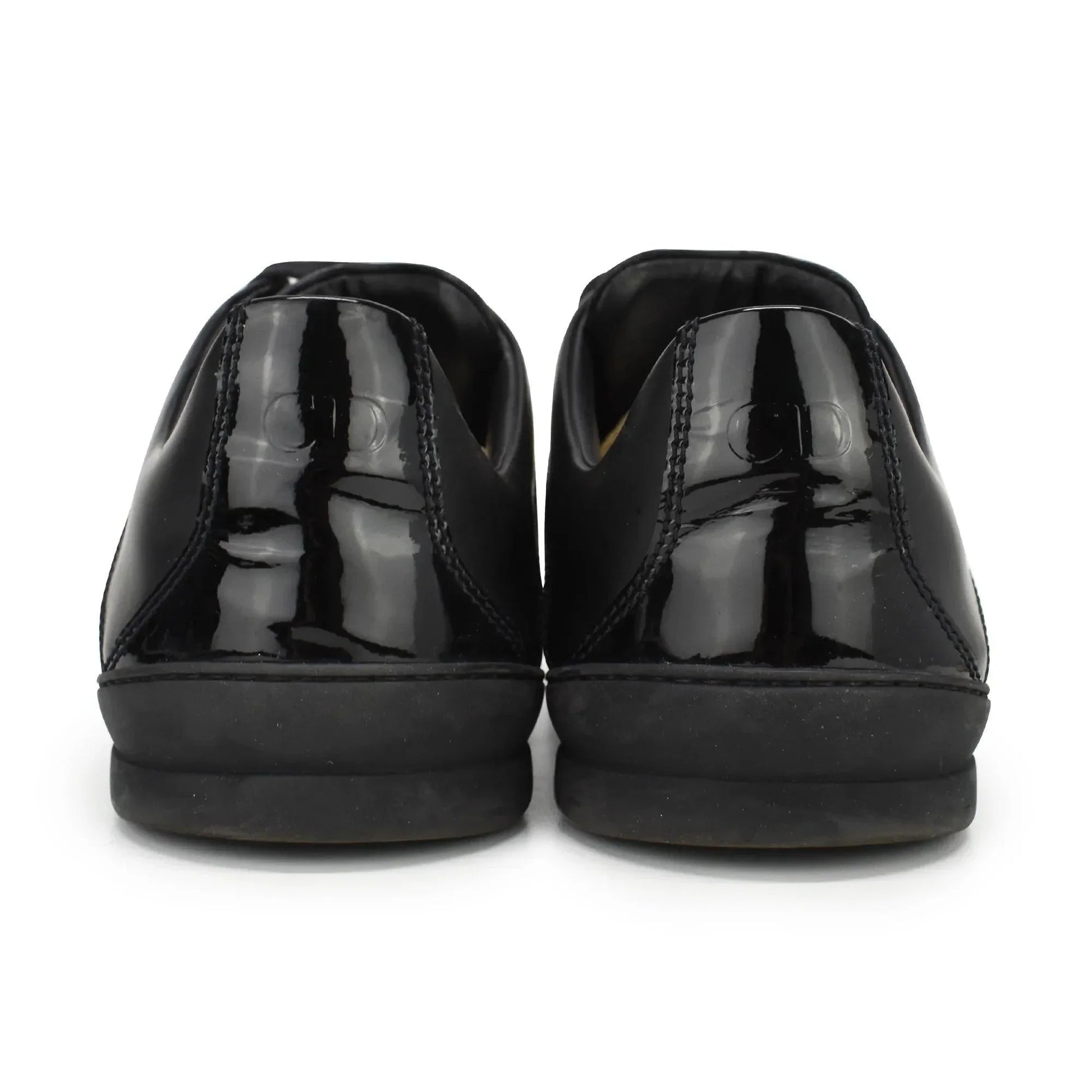 Dior low-top sneakers in black smooth leather with patent leather detailing. Features embossed logo on the tongue and heel cap and black flat laces.