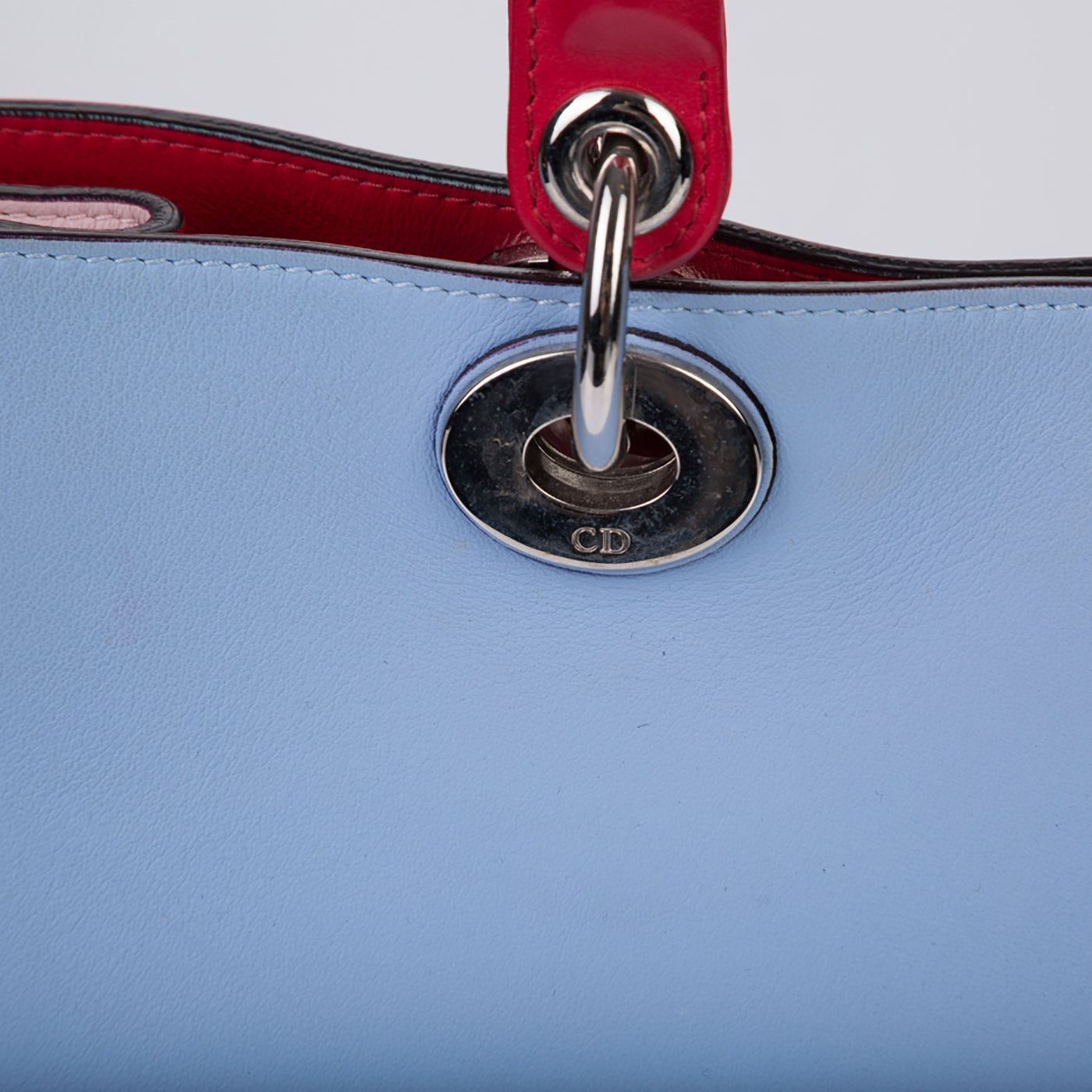 Dior presents their stunning tricolour Diorissimo in a striking colour palette of pale blue, red, and baby pink. Carefully crafted from smooth leather featuring the delicate, silver tone Dior charm, this bag is the ideal accessory for any woman who wants to put some colour in her wardrobe! Hold all your every day essentials inside the spacious interior while carrying the Diorissimo over your arm, or clip the additional shoulder strap on and throw this bag over your shoulder for handsfree usage. The perfect every day bag and compliment to any neutral-toned outfit, the tricolour Diorissimo offers the best of both worlds by combing luxury fashion and practical function.
