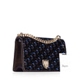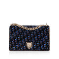 This Diorama bag is from the Fall/Winter 2016 collection and is a unique and stunning piece. The exterior is canvas and covered in a velvet monogram. The striking blue stitching stands out behind the black velvet and is perfectly complimented by the gold chain strap and gold closure. This bag is glamorous and perfect to wear for a formal evening or dinner with friends. As this bag is no longer available, don’t miss your chance to own it!