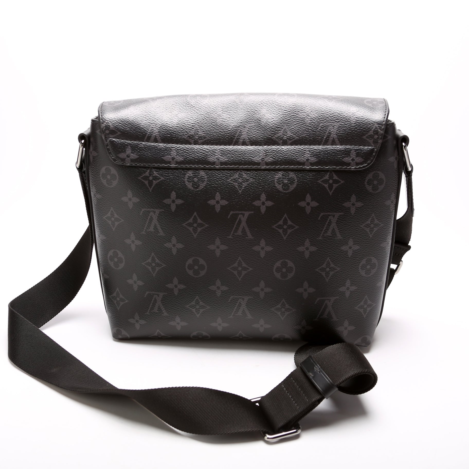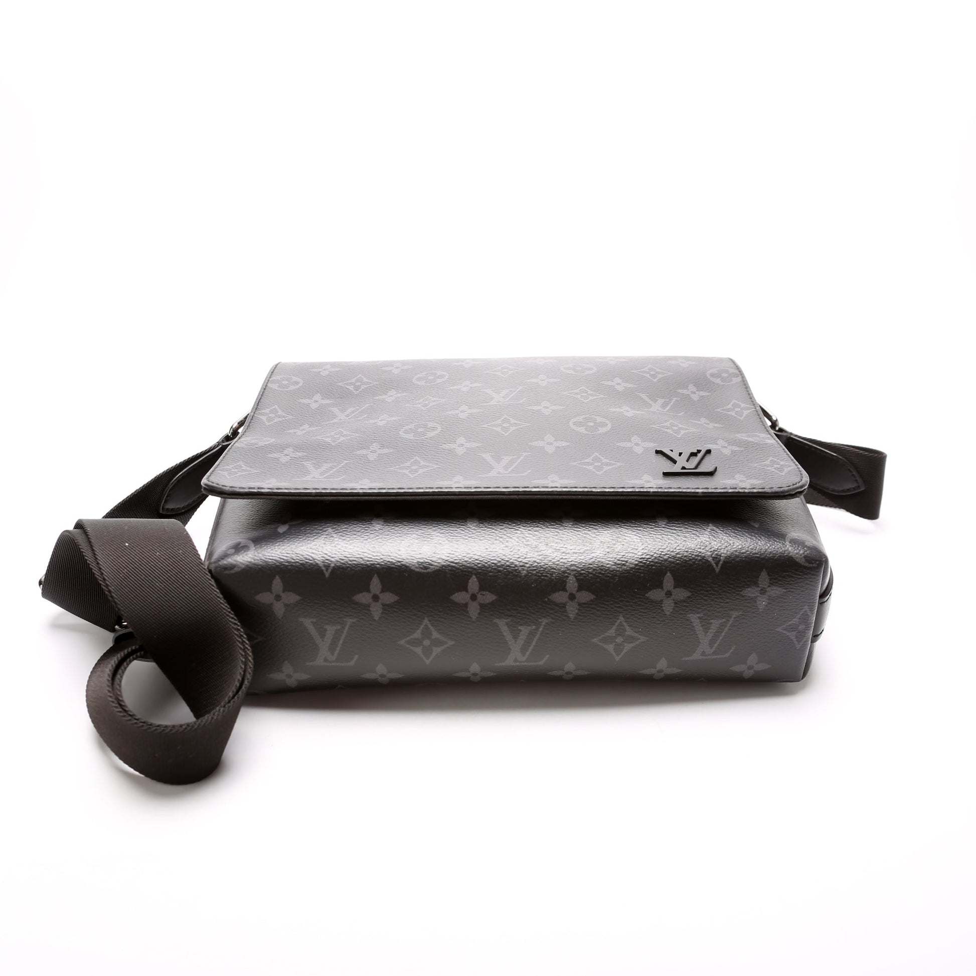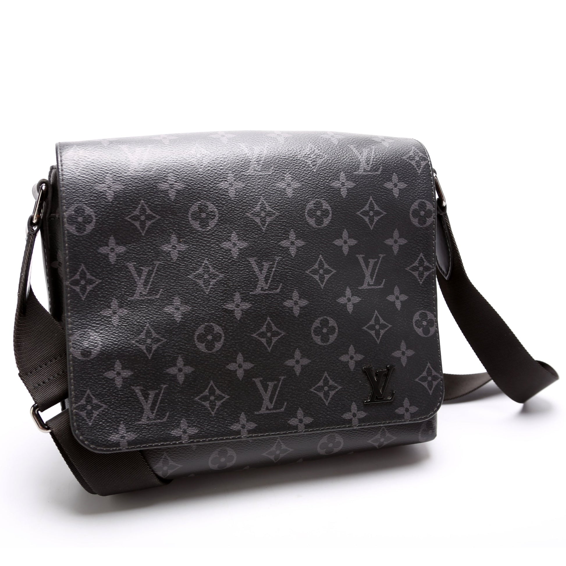 This Louis Vuitton District PMis eye catching bag. The exterior is in the classic Louis Vuitton Monogram Eclipse coated canvas.