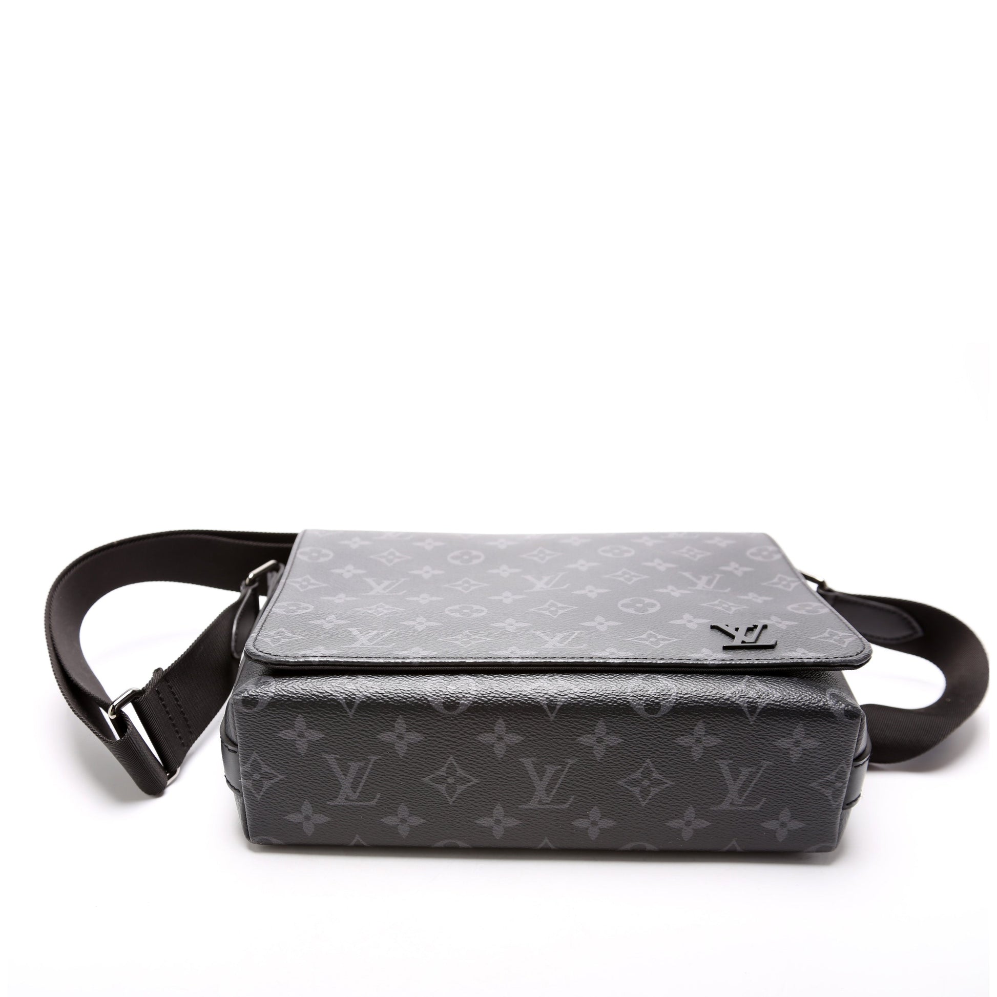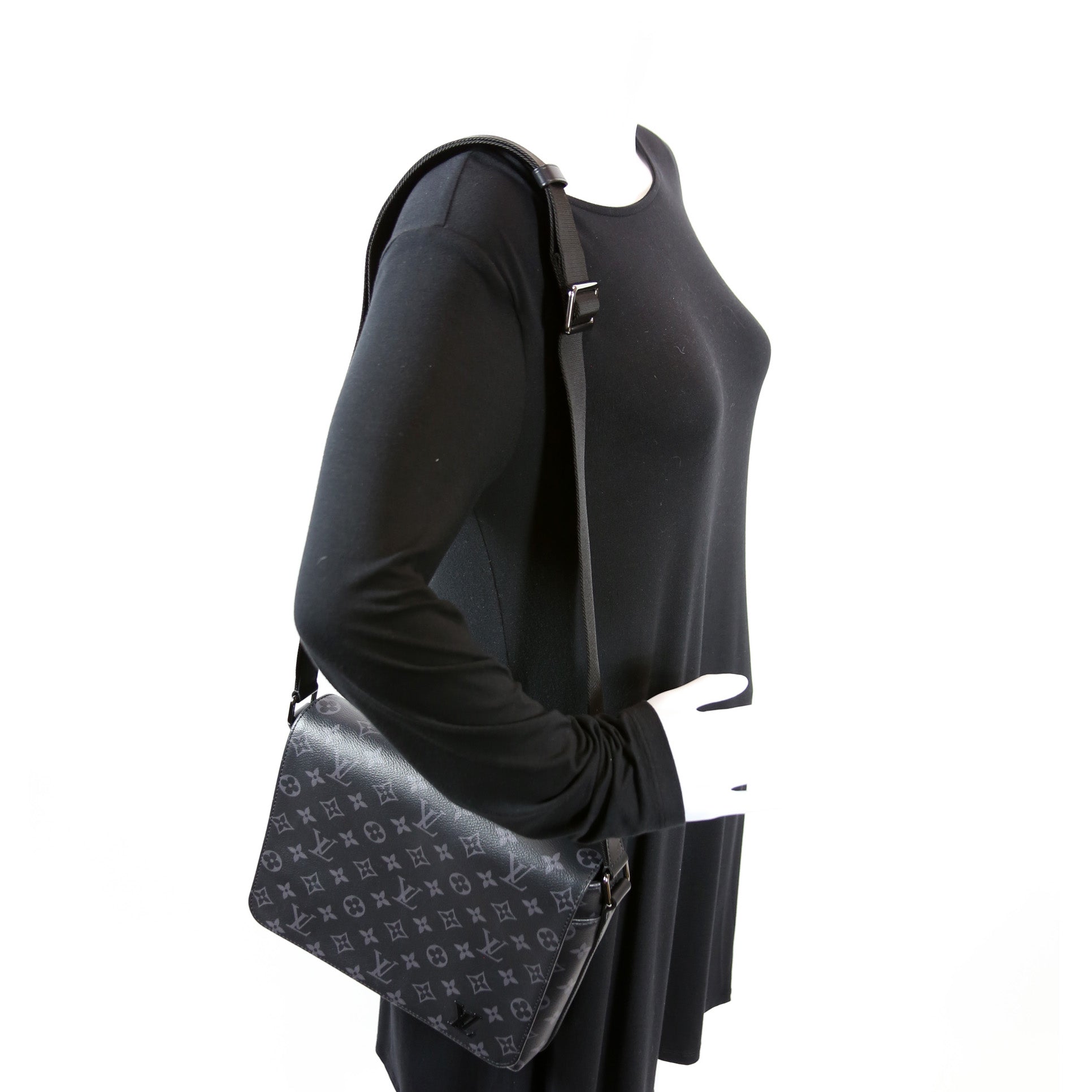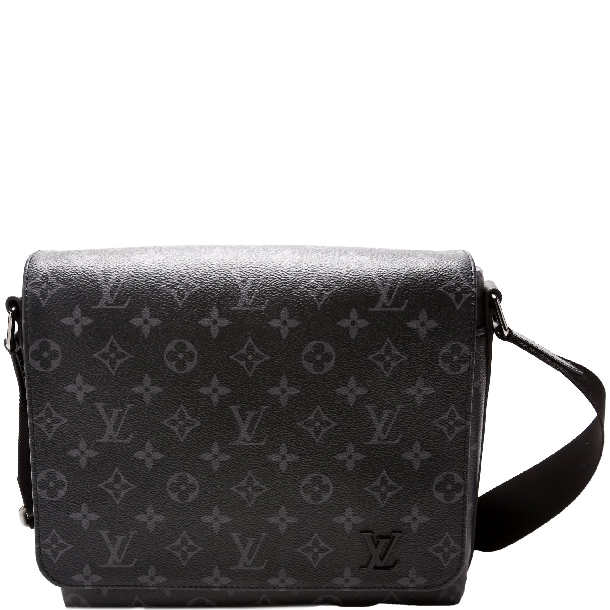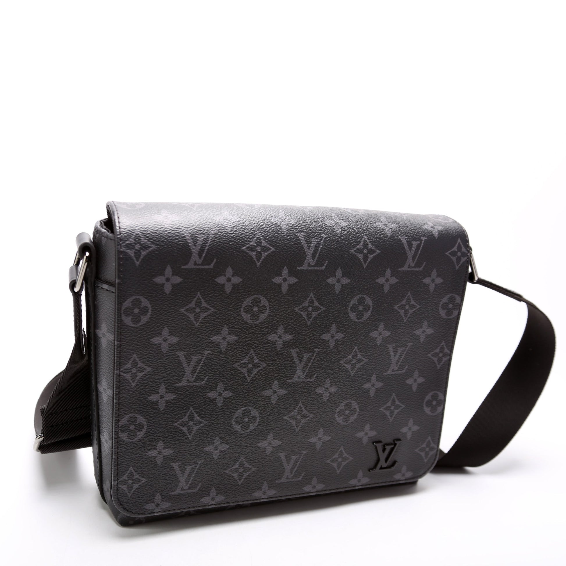 This Louis Vuitton District PMis eye catching bag. The exterior is in the classic Louis Vuitton Monogram Eclipse coated canvas.