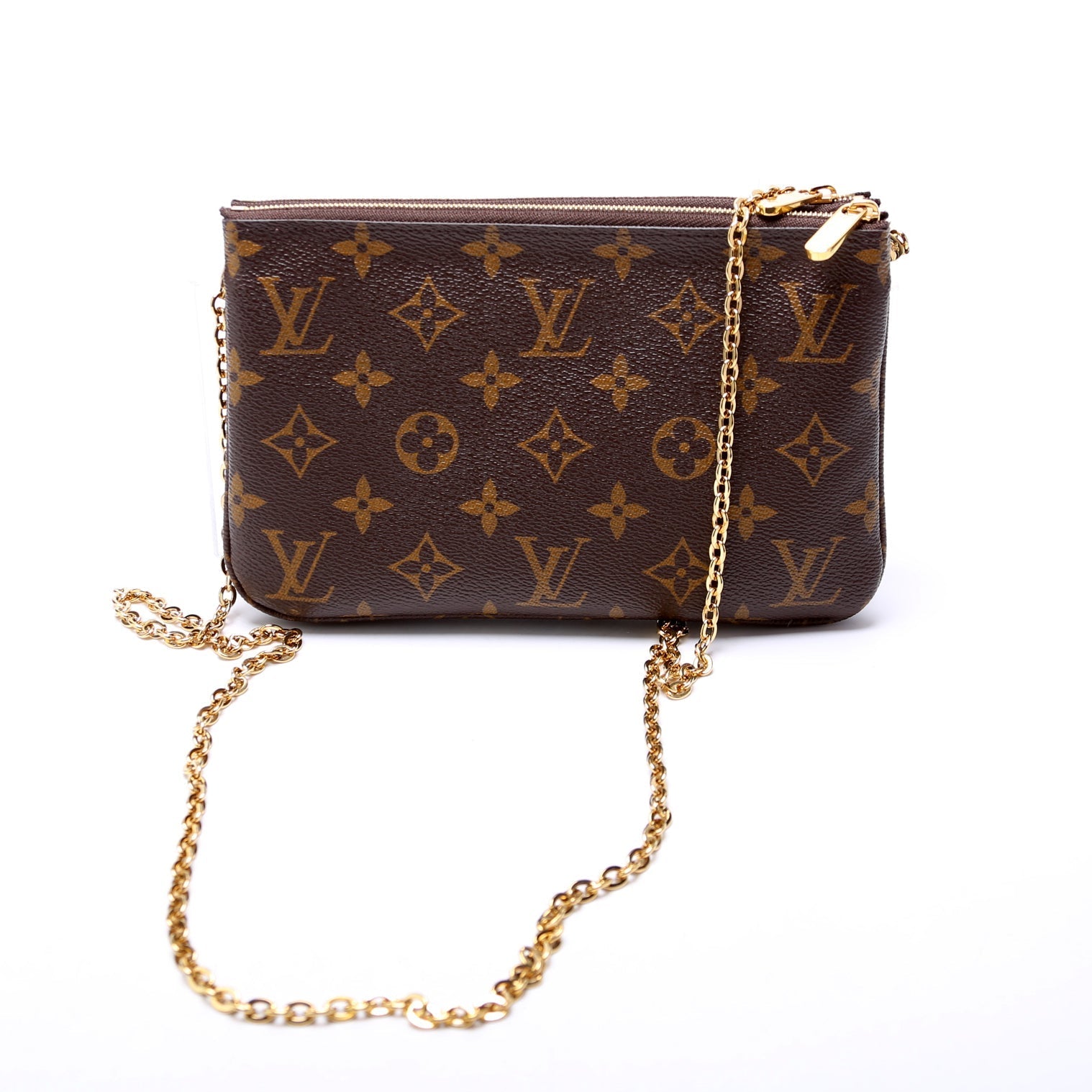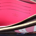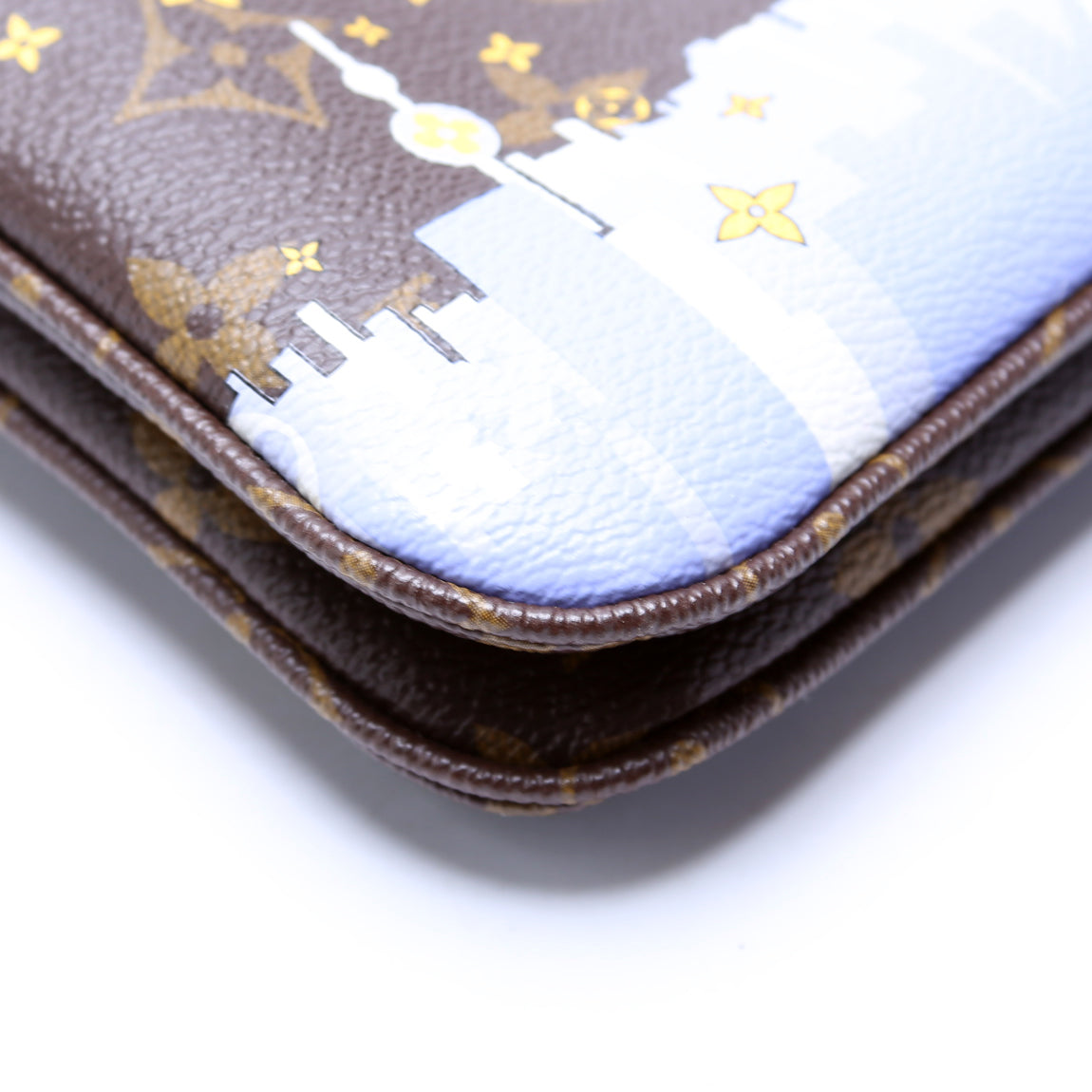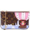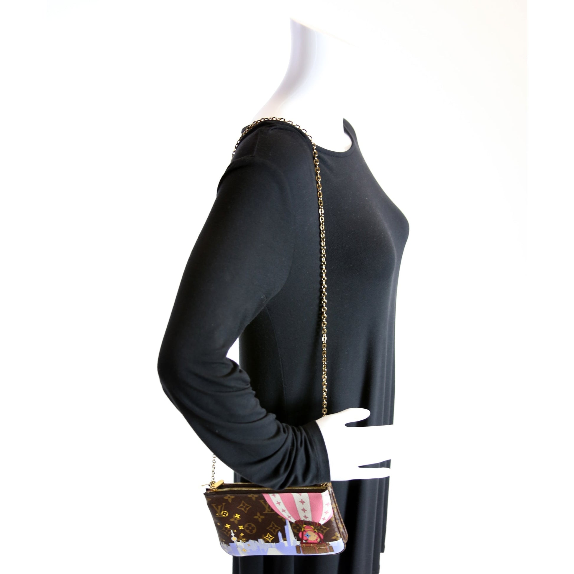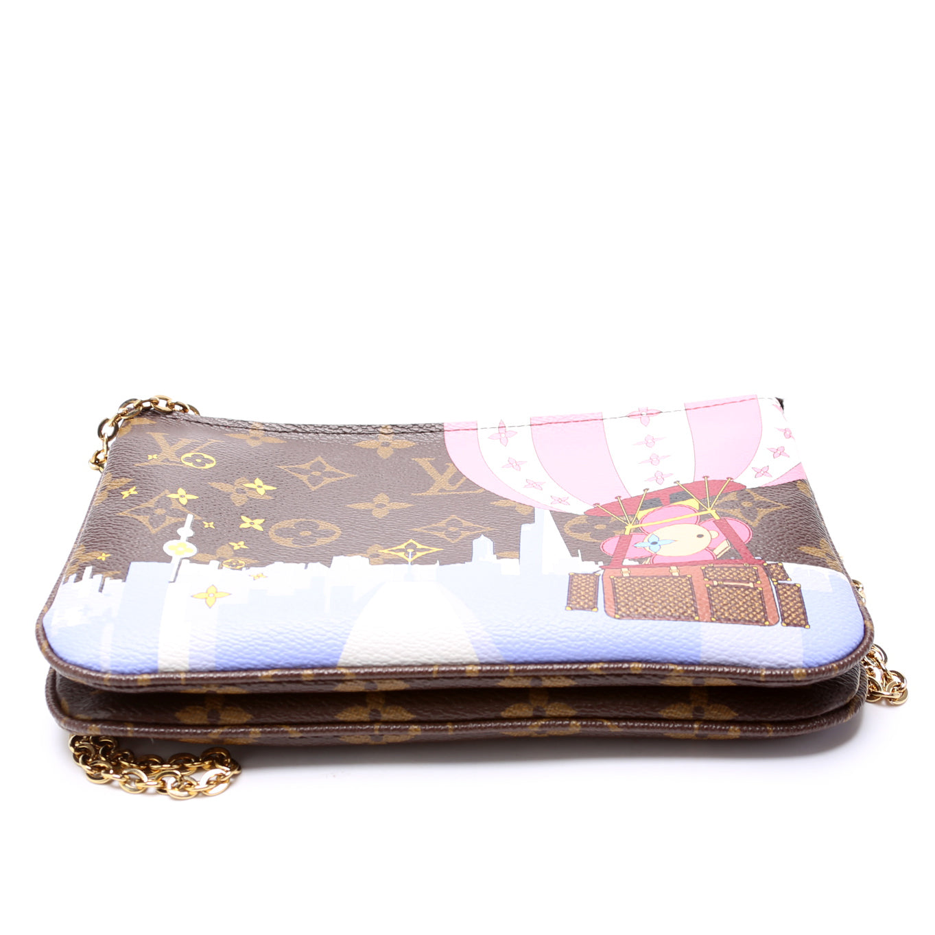 This Louis Vuitton Pochette Double Zip Christmas 2019 Animationis eye catching bag. The exterior is in the classic Louis Vuitton Monogram coated canvas.