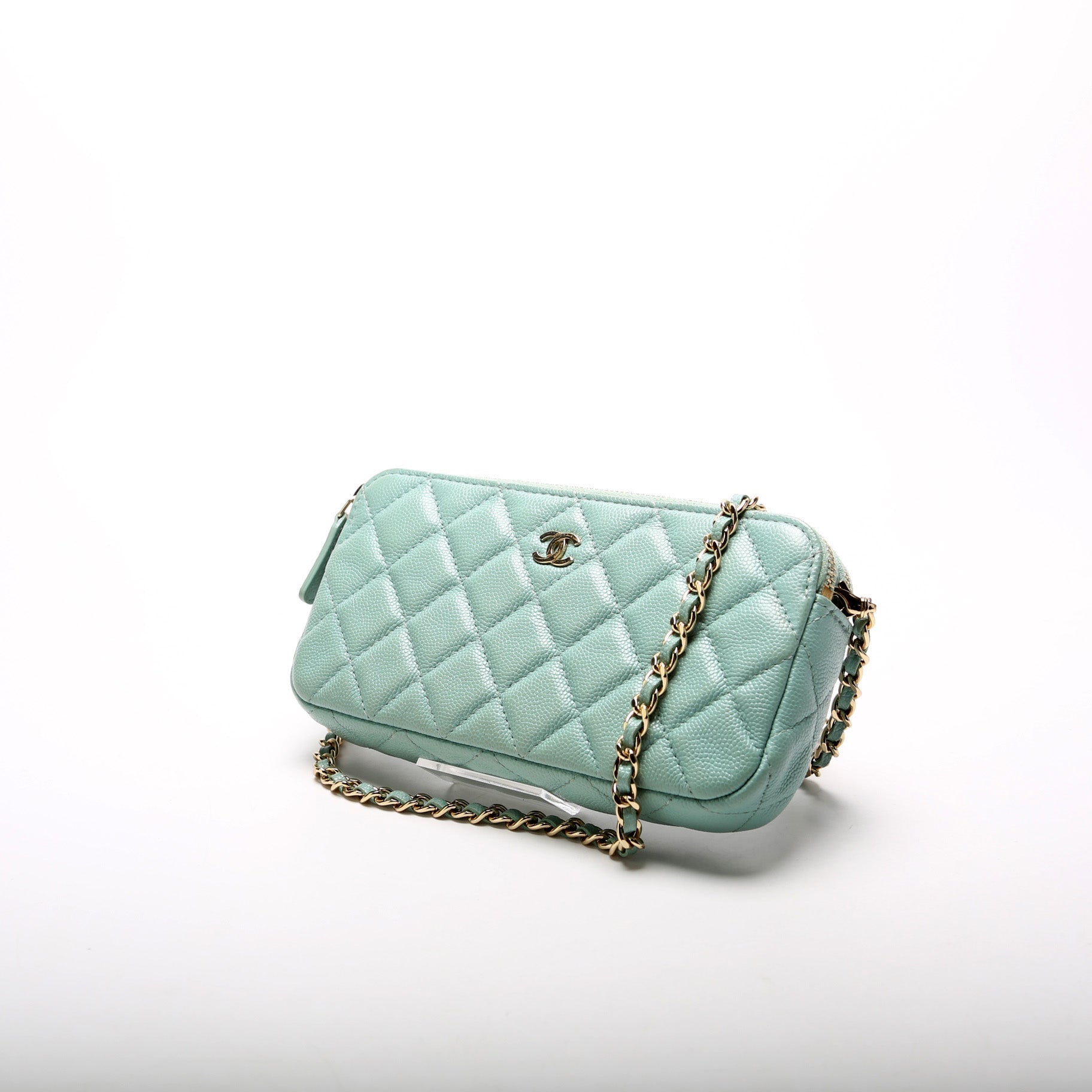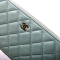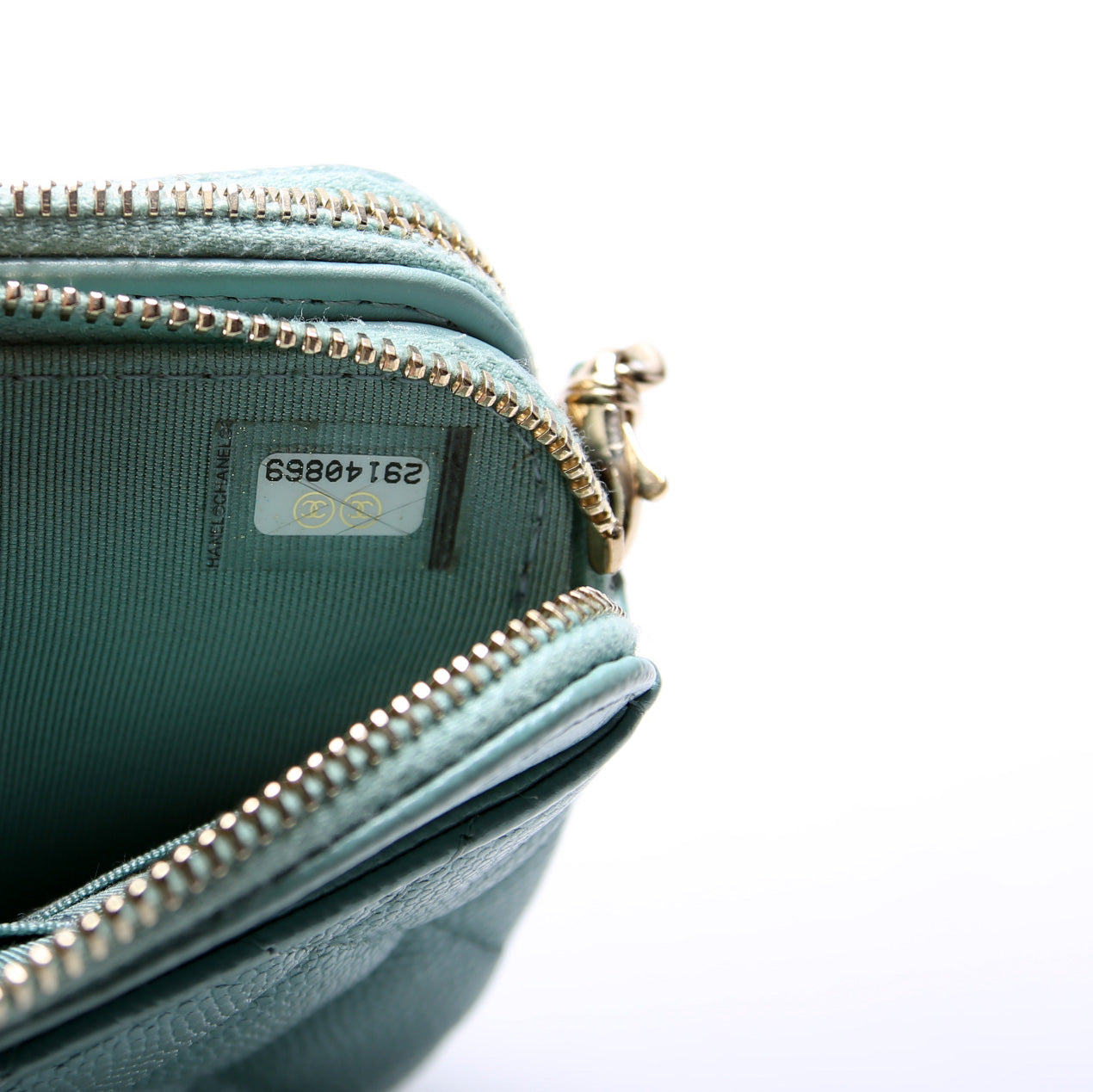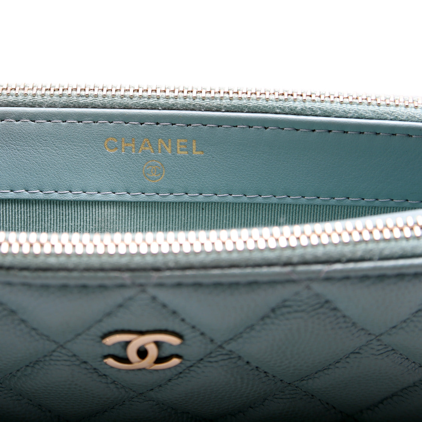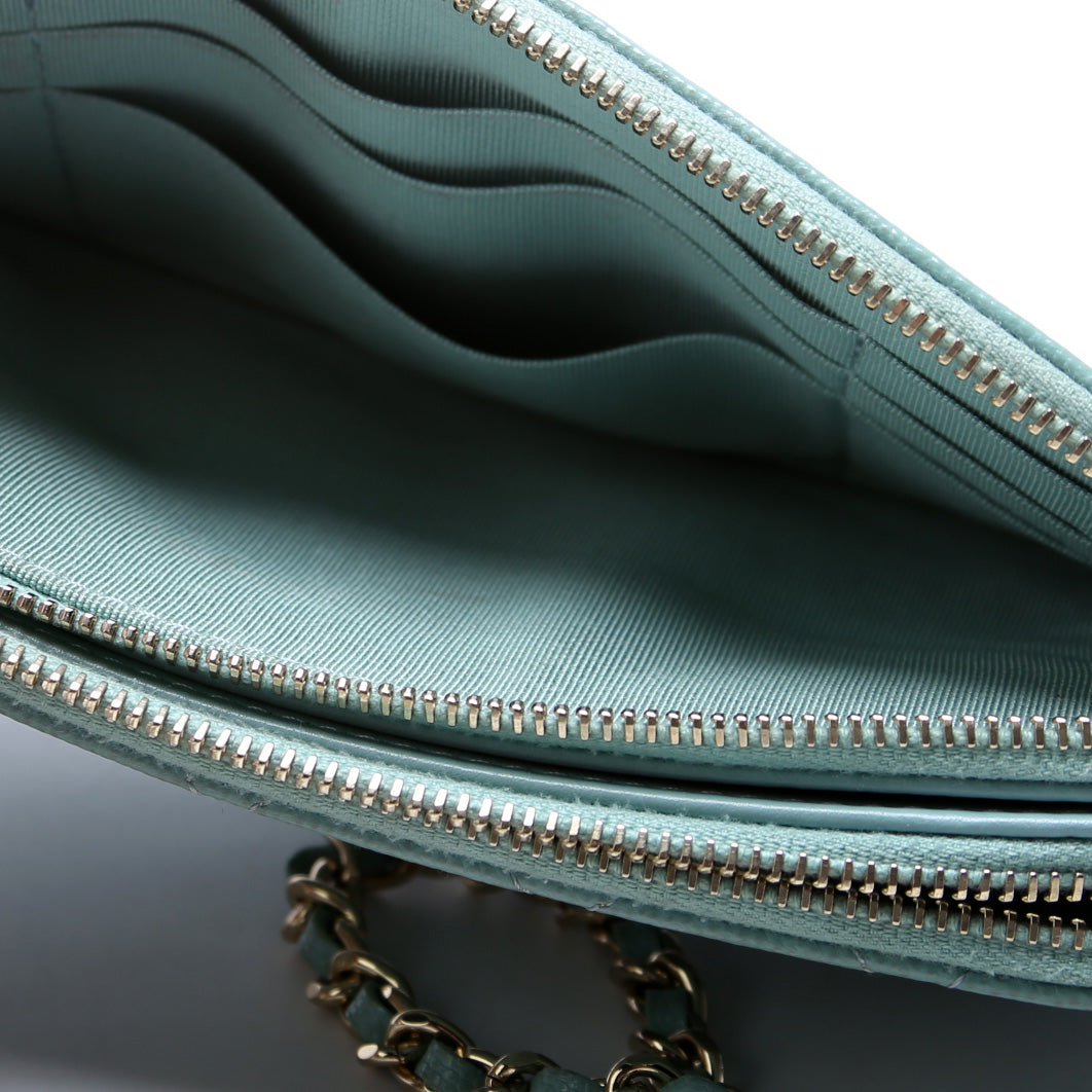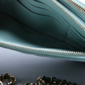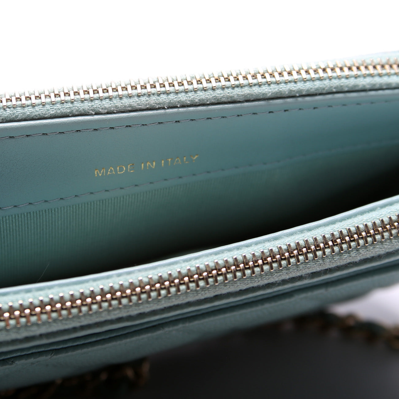 Interior: The interior is clean and free of rips or tears. The interior features one open pocket, two zip closure pockets, and six card slots.