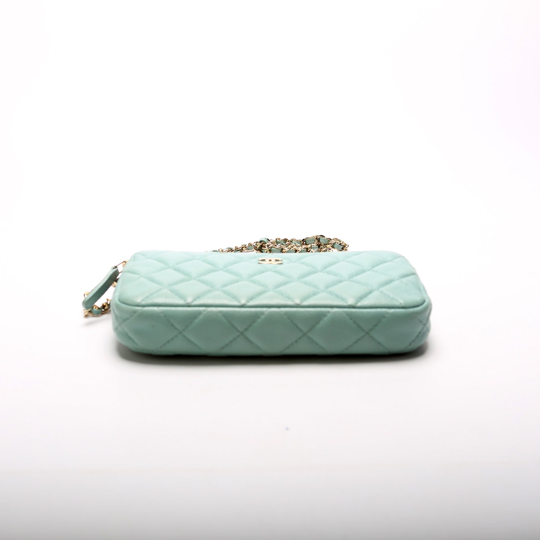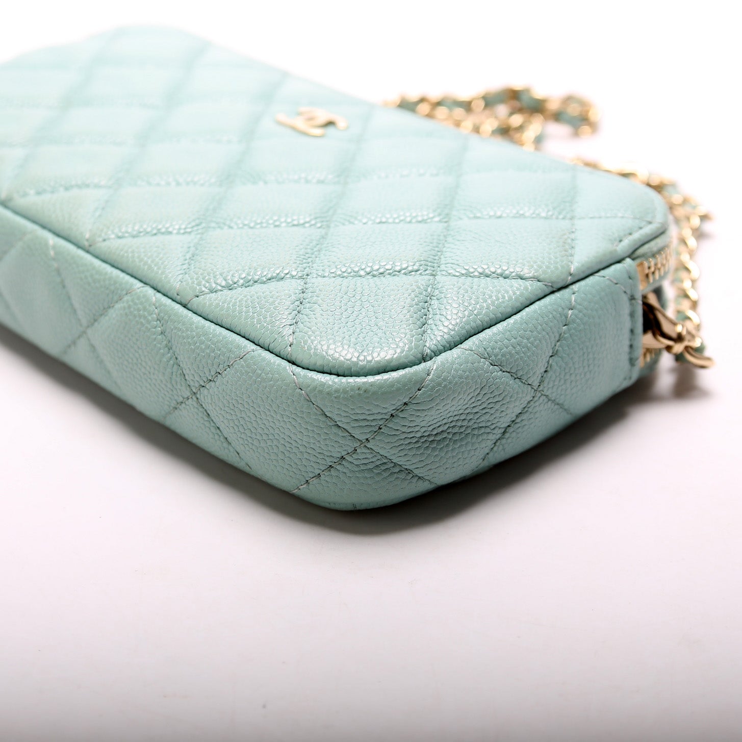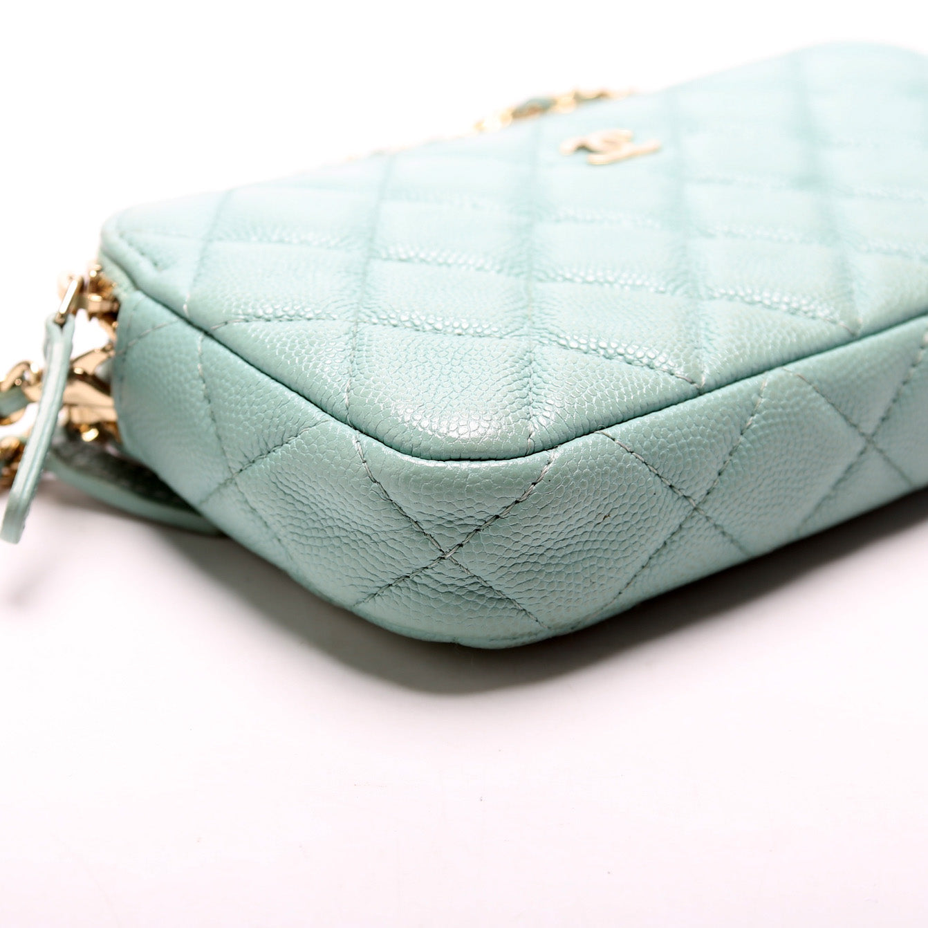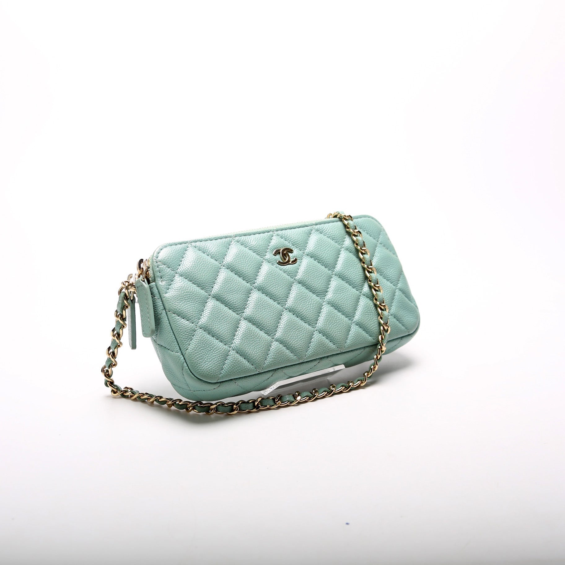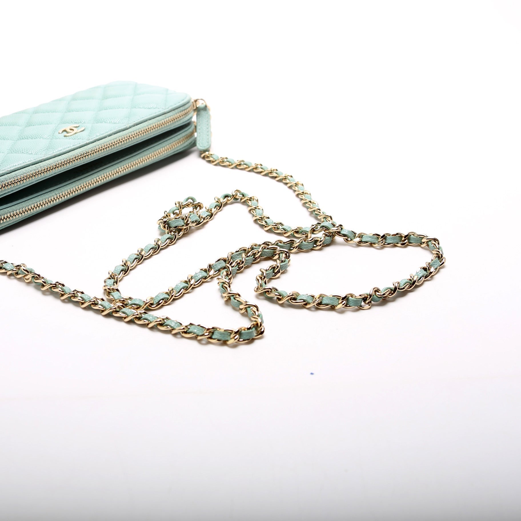 Interior: The interior is clean and free of rips or tears. The interior features one open pocket, two zip closure pockets, and six card slots.
