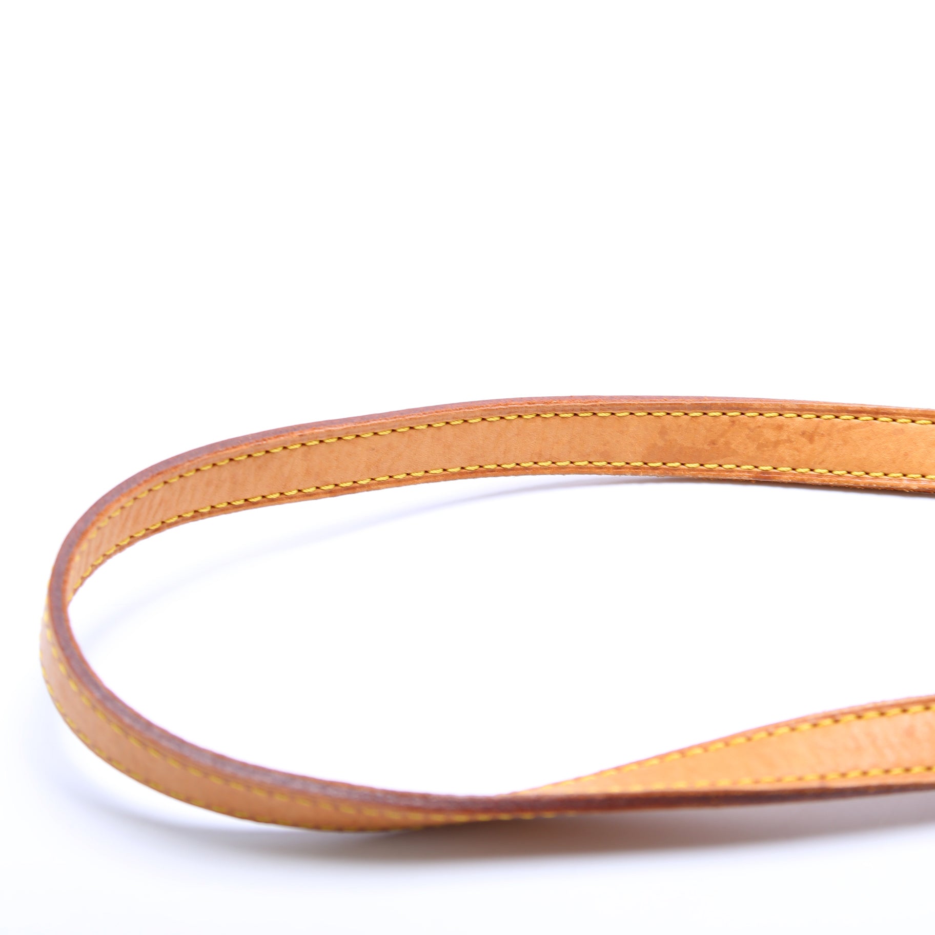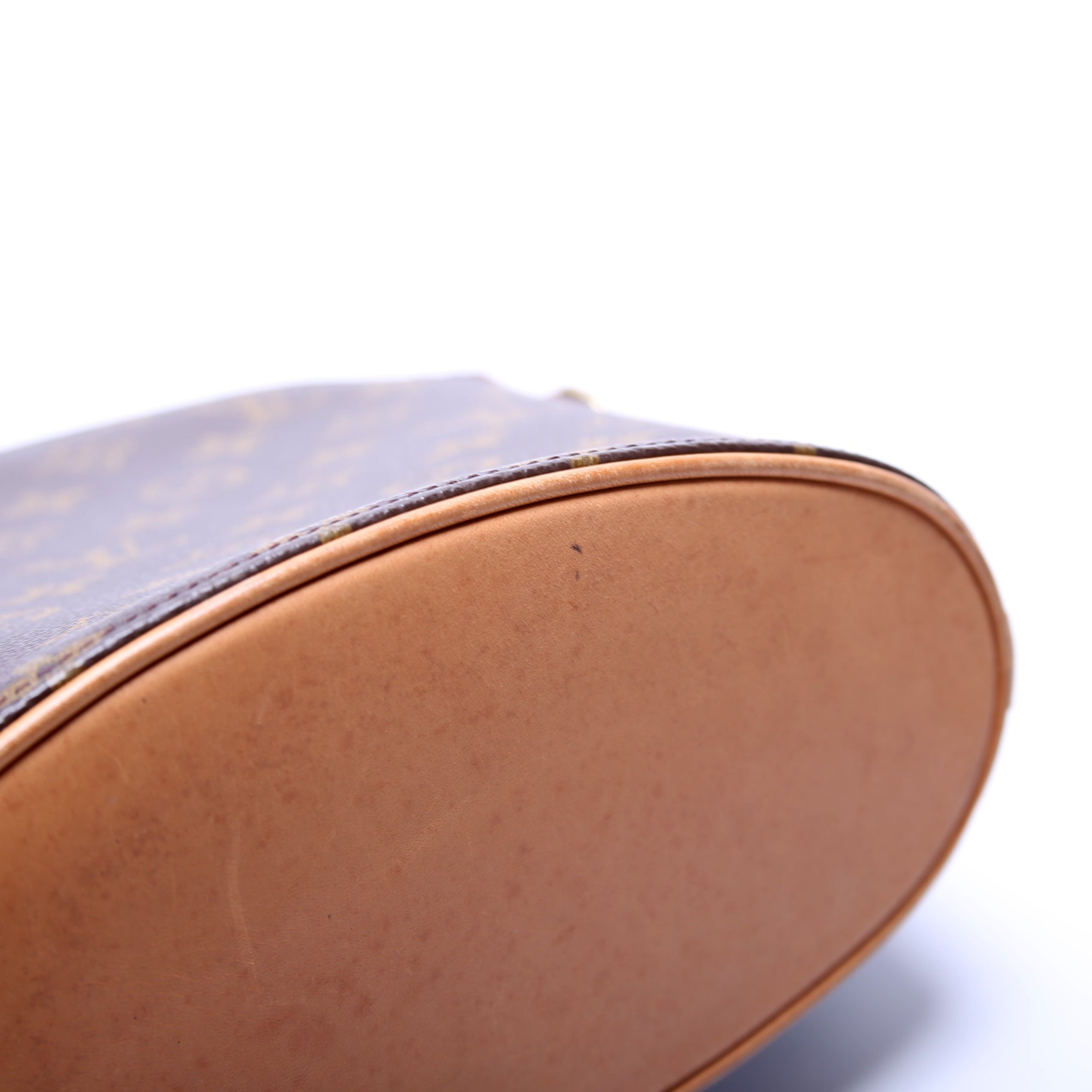 Exterior: The exterior coated canvas is free from wear. The leather base has minor water spots.