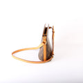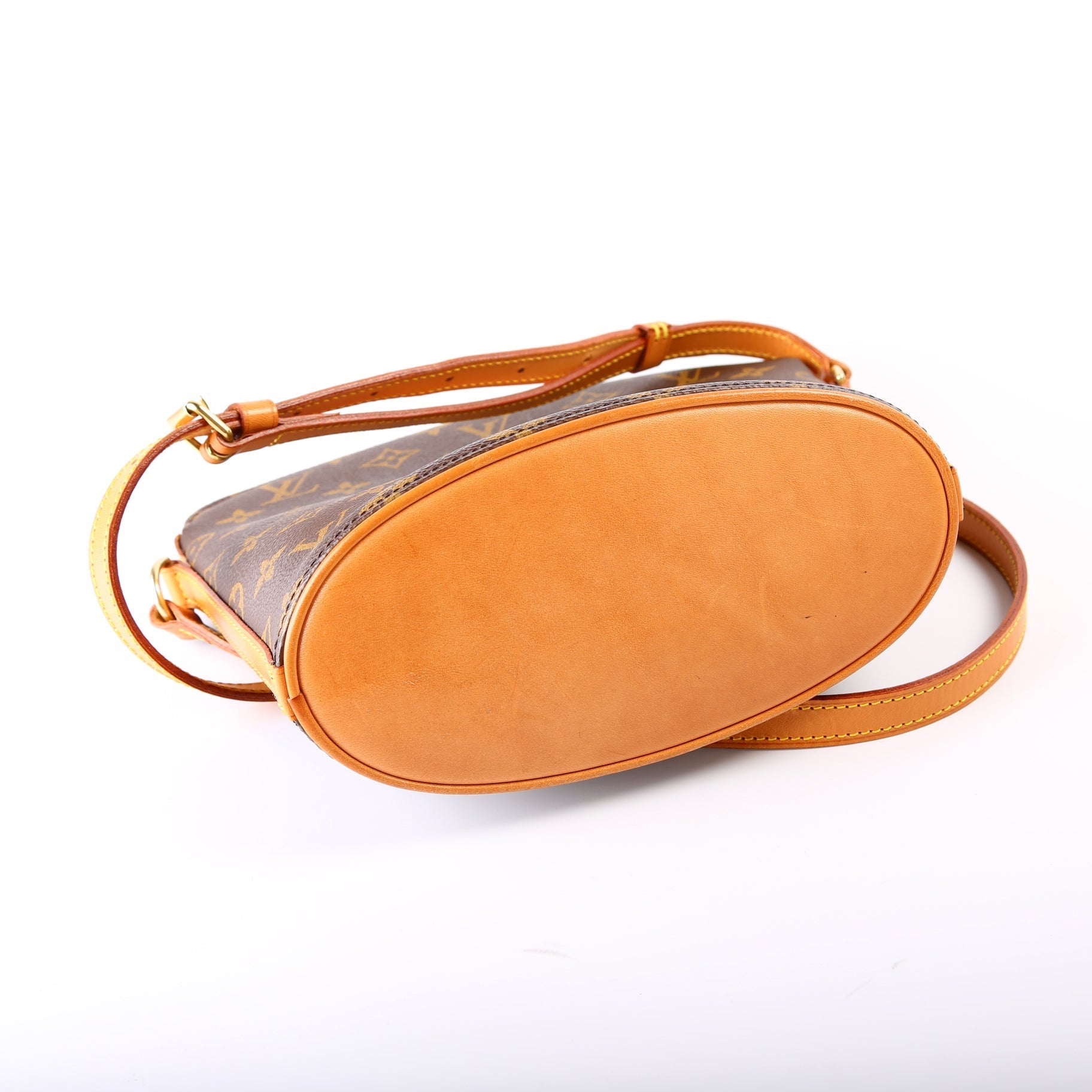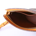Exterior: The exterior coated canvas is free from wear. The leather base has minor scuffs and discoloration.