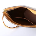 Exterior: The exterior coated canvas is free from any rips or cracks, there is light discoloration throughout. The leather base, corners, and trim show wear and discoloration throughout. The pipping shows wear.