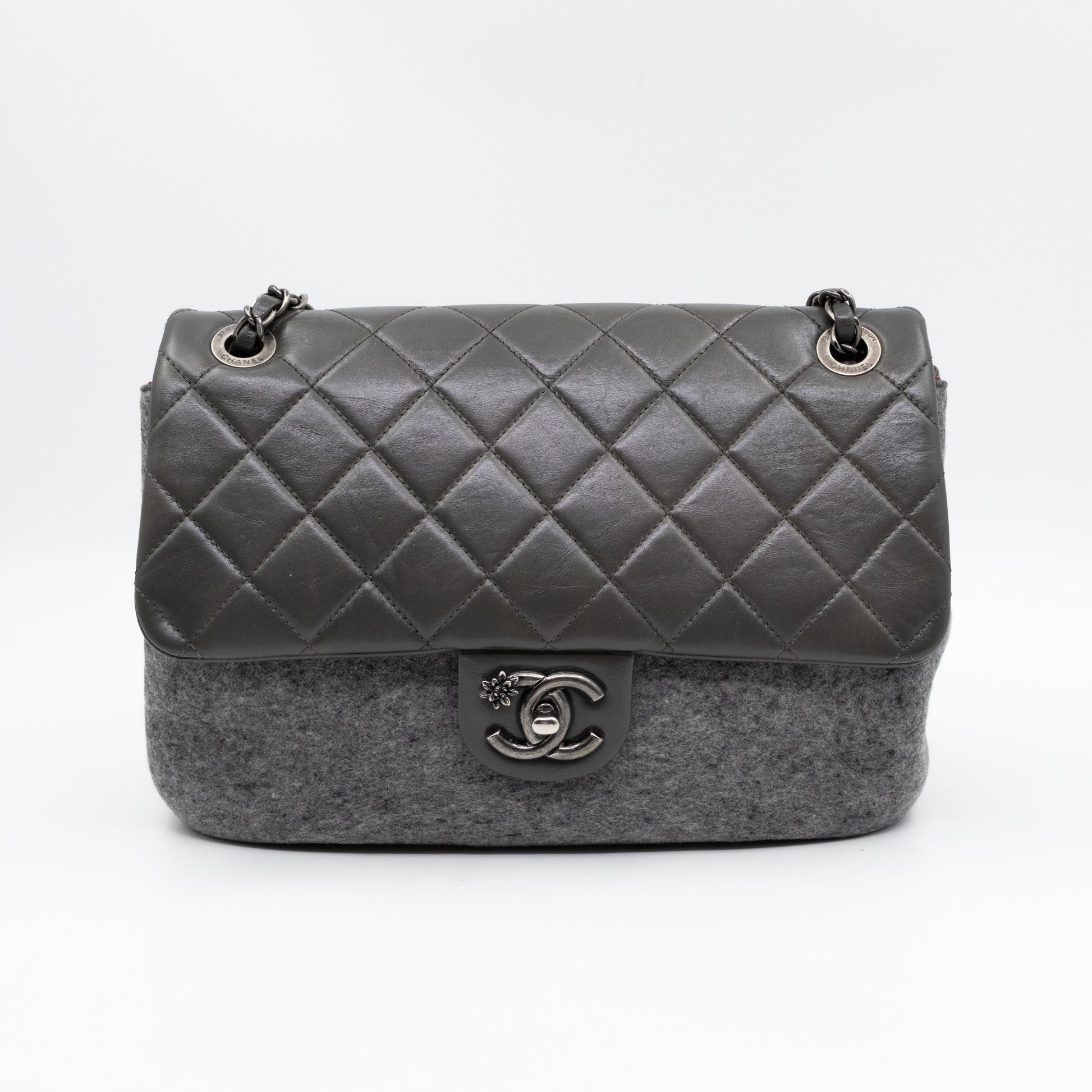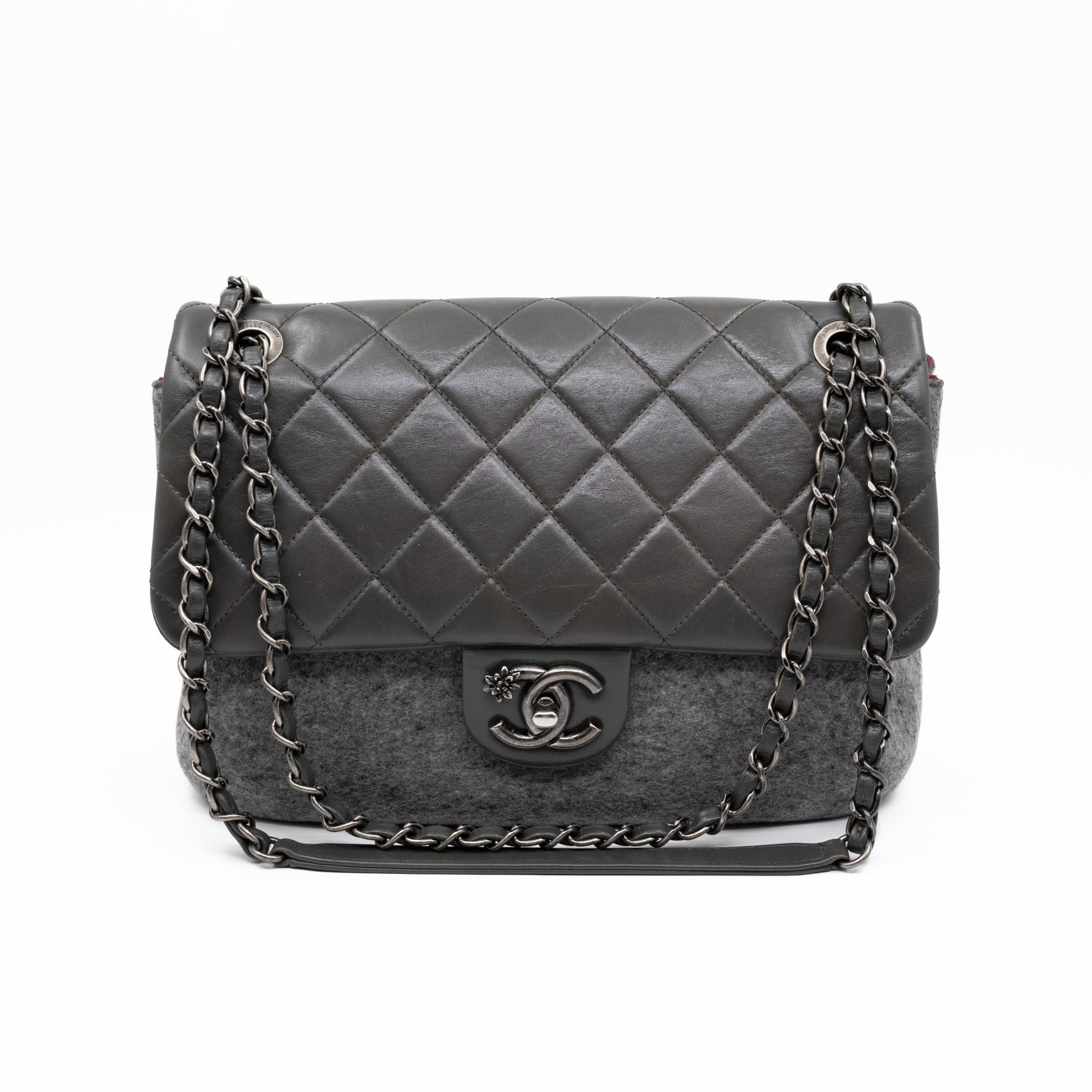 This is a Chanel Calf and Felt flap bag from Metiers d'Art Paris-Salzburg, Spring 2015. This stylish bag is beautifully crafted of grey glossy diamond quilted leather flap and grey felt body with ruthenium hardware. The bag features a long ruthenium chain leather threaded shoulder strap with a leather shoulder pad. The flap open with a ruthenium edelweiss flower Chanel CC turn lock to a spacious burgundy fabric interior with a zipper pocket. It can be used as a crossbody bag or a shoulder bag.