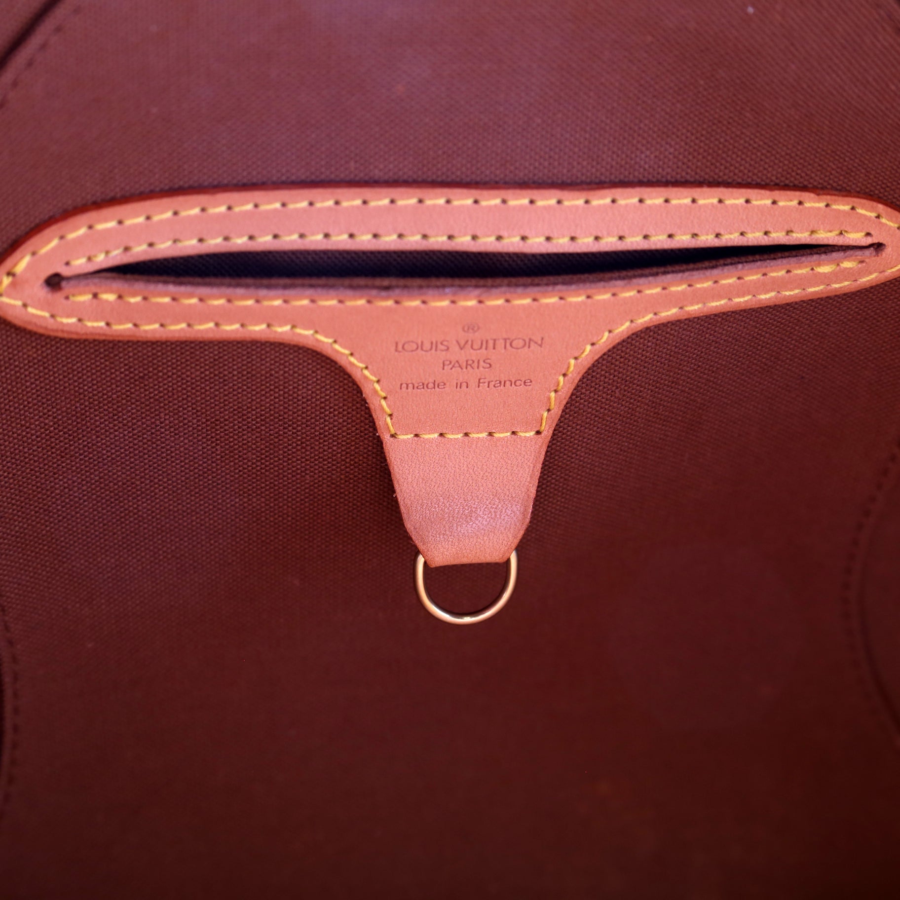 Exterior: The exterior coated canvas is free of any rips or cracks. The leather trim shows minor wear and discoloration throughout.