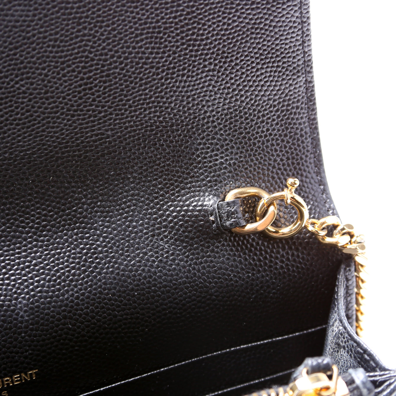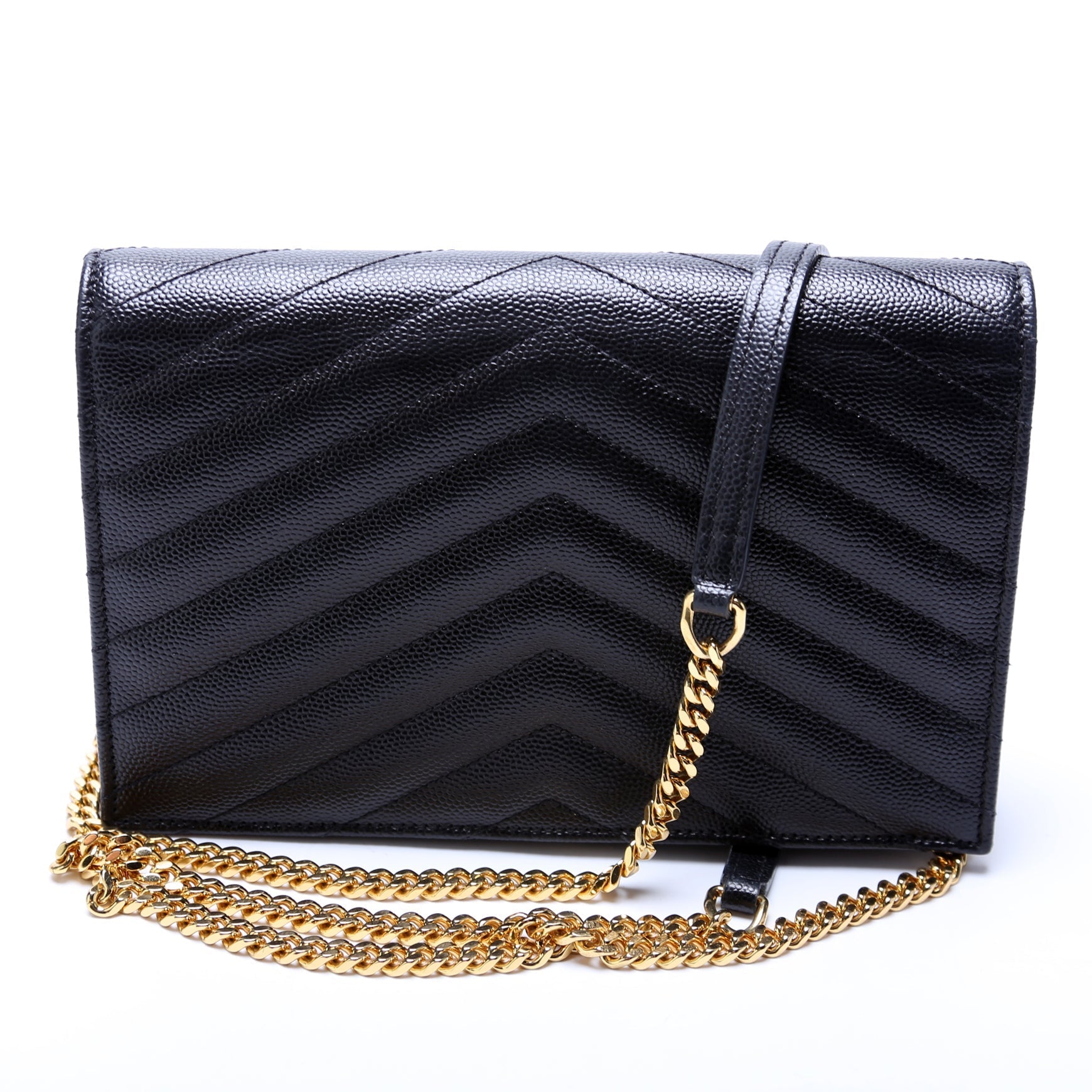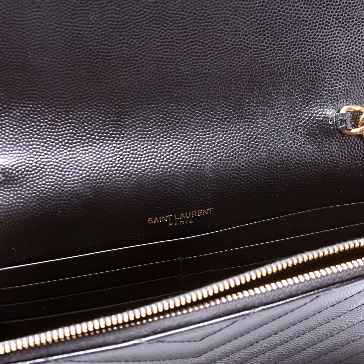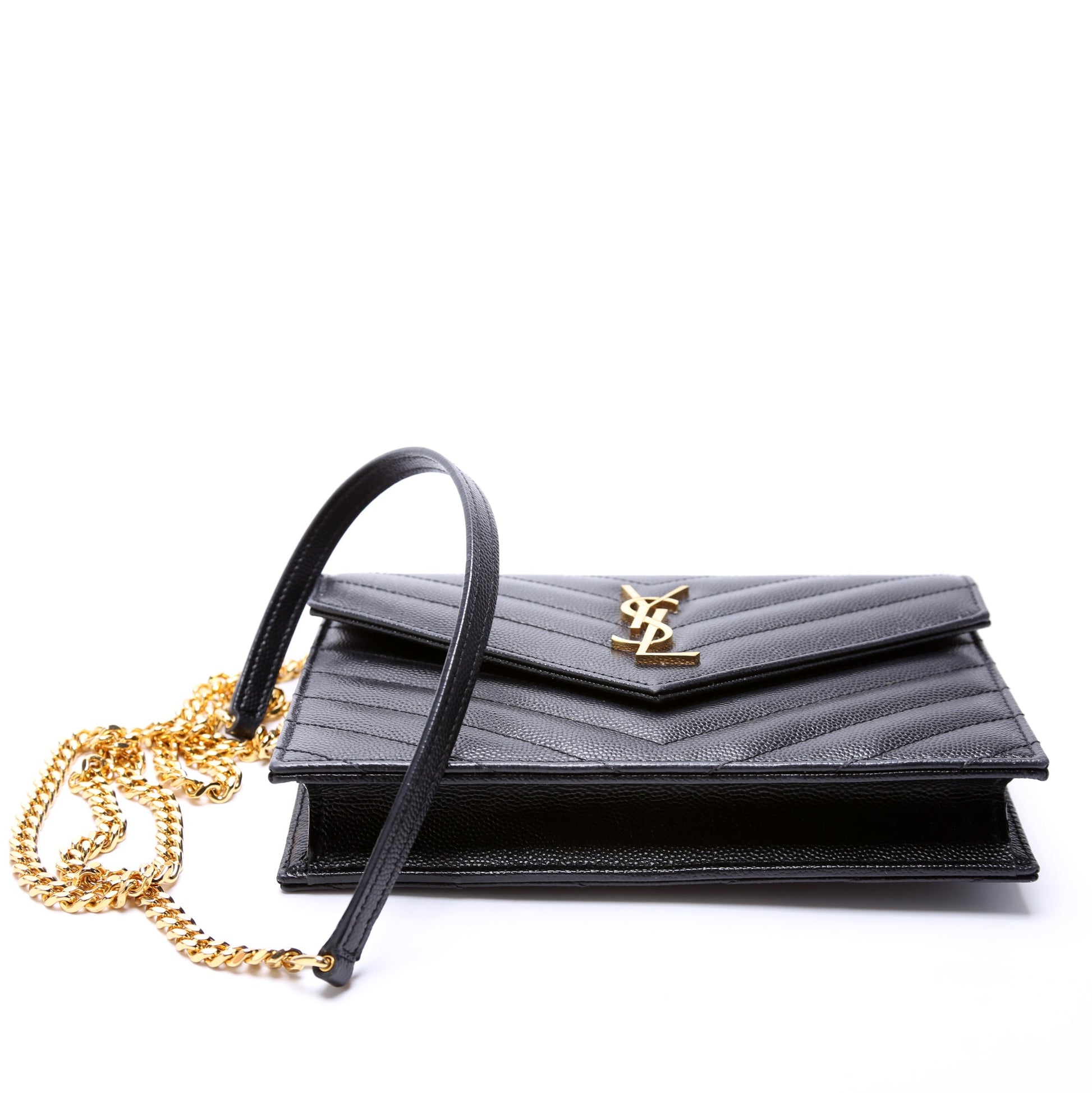 This Saint Laurent Envelope Chain Wallet is d 100% . The exterior is in the classic Saint Laurent Grain De Poudre leather.