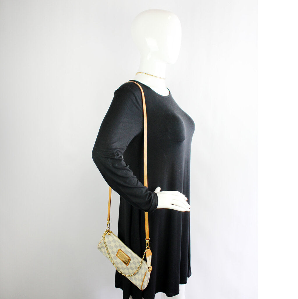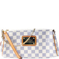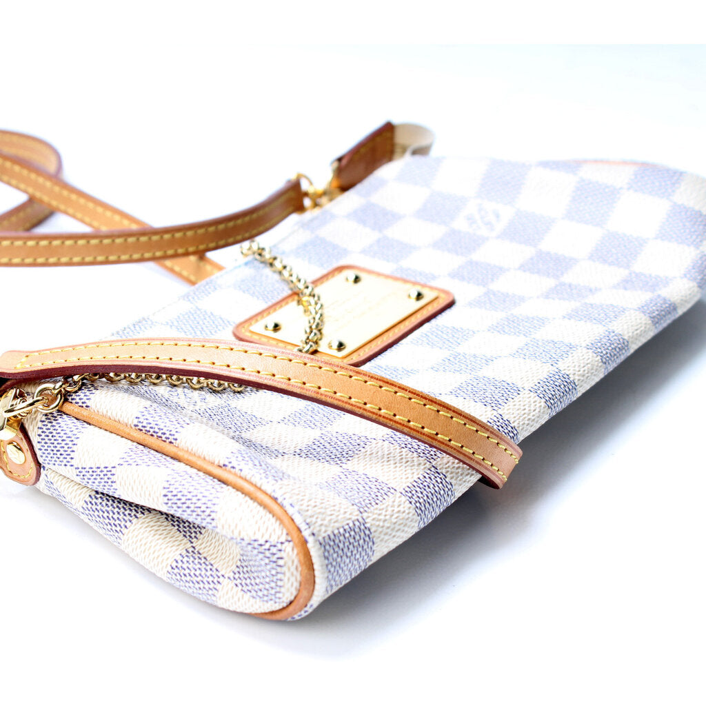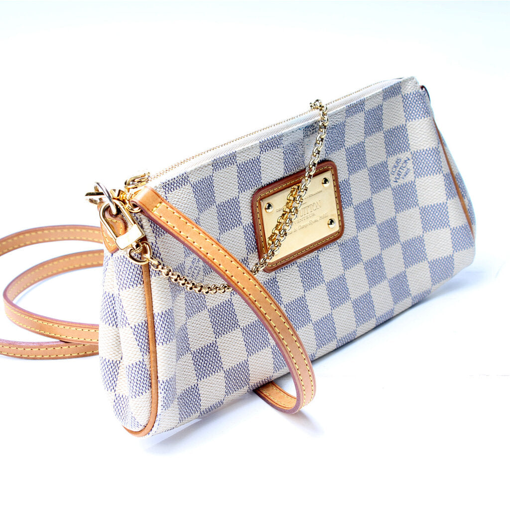 This Louis Vuitton Eva Clutchis eye catching bag. The exterior is in the classic damier azur coated canvas.