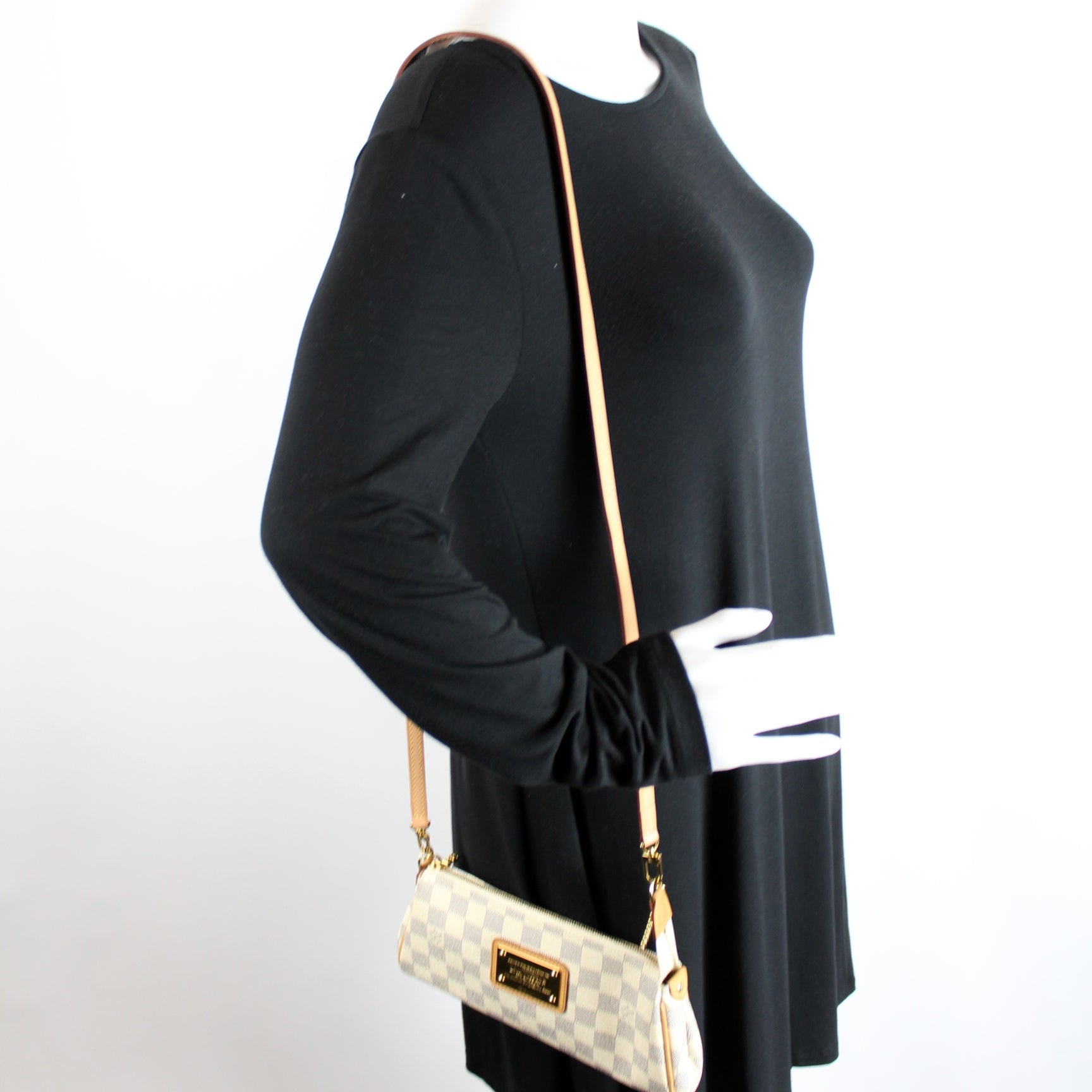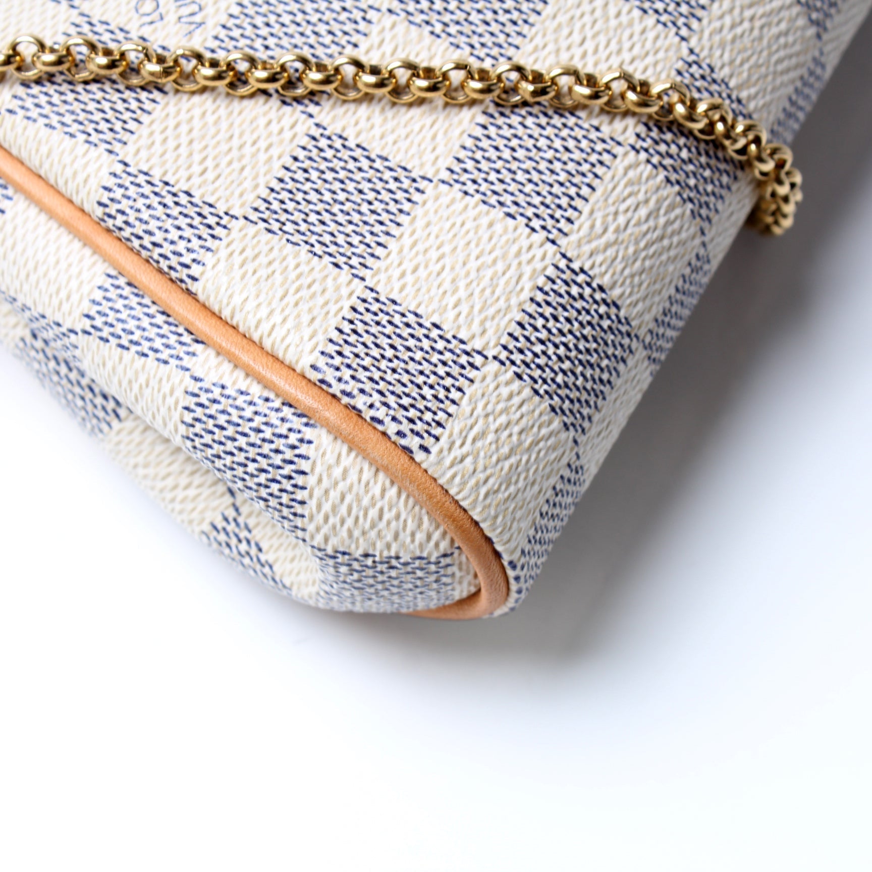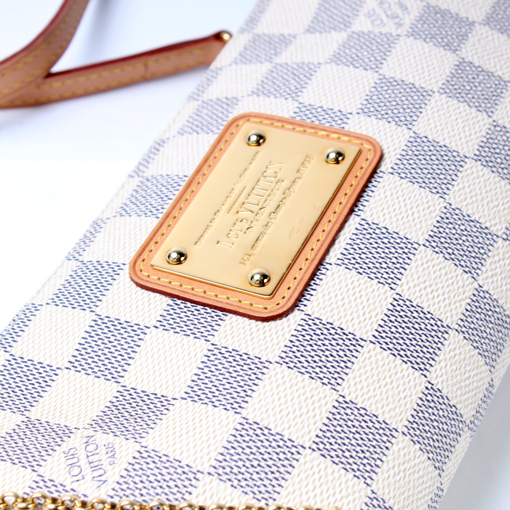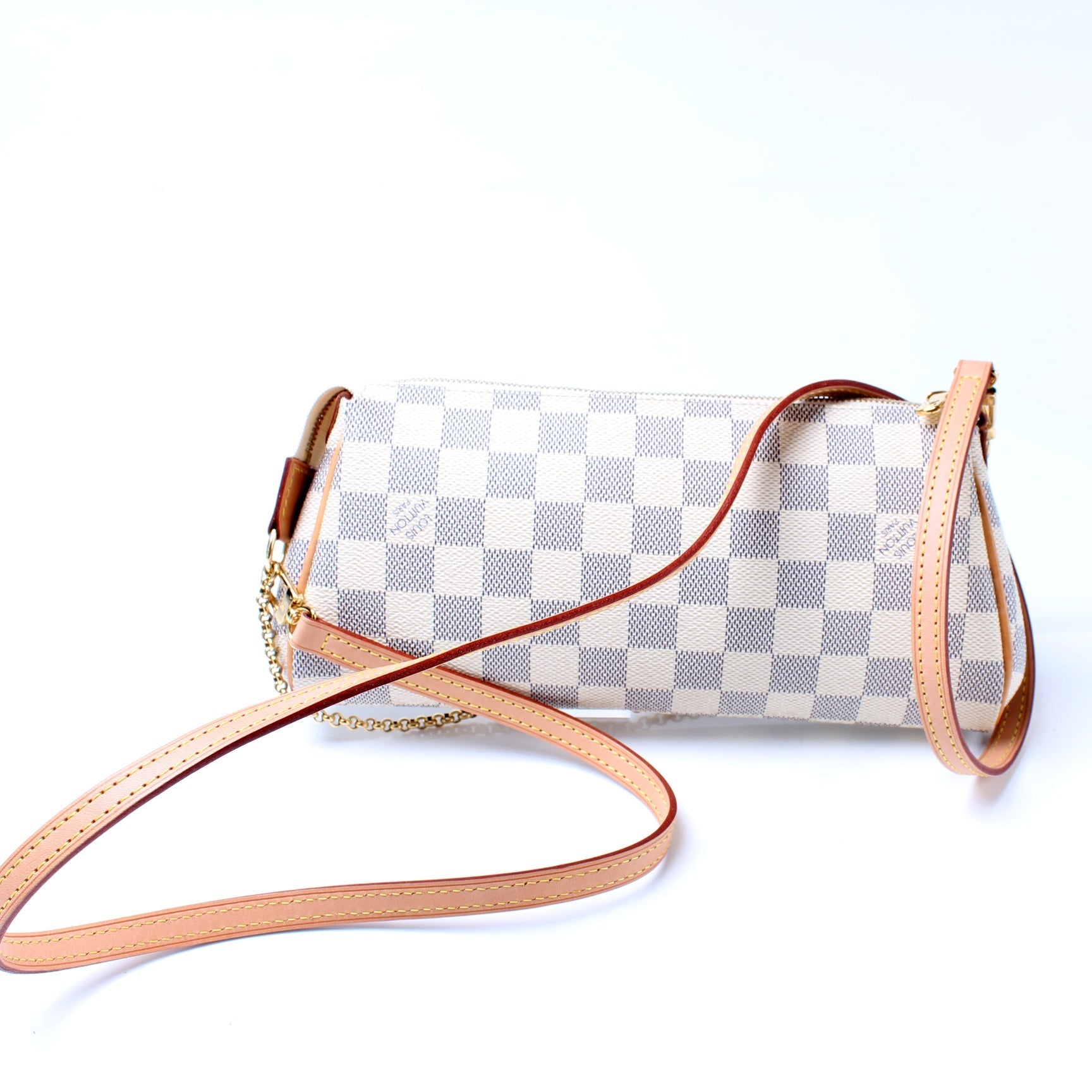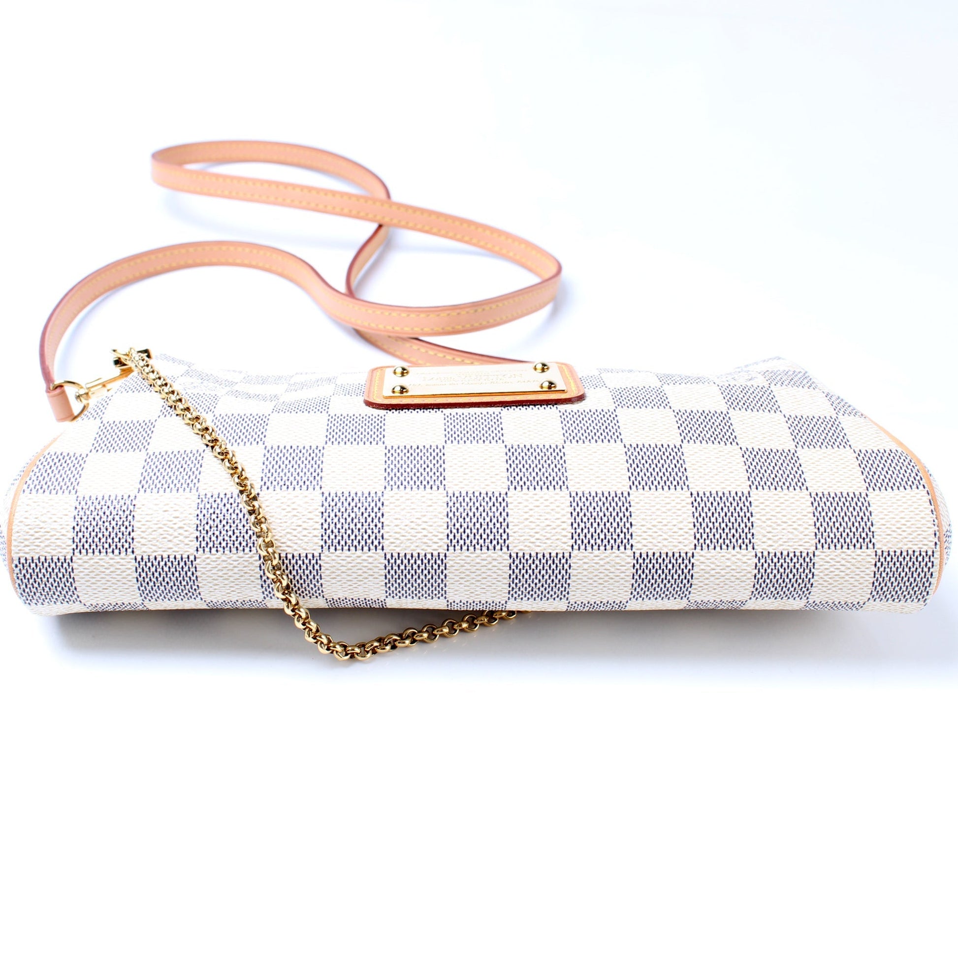 This Louis Vuitton Eva Clutchis eye catching bag. The exterior is in the classic Damier Azur coated canvas.