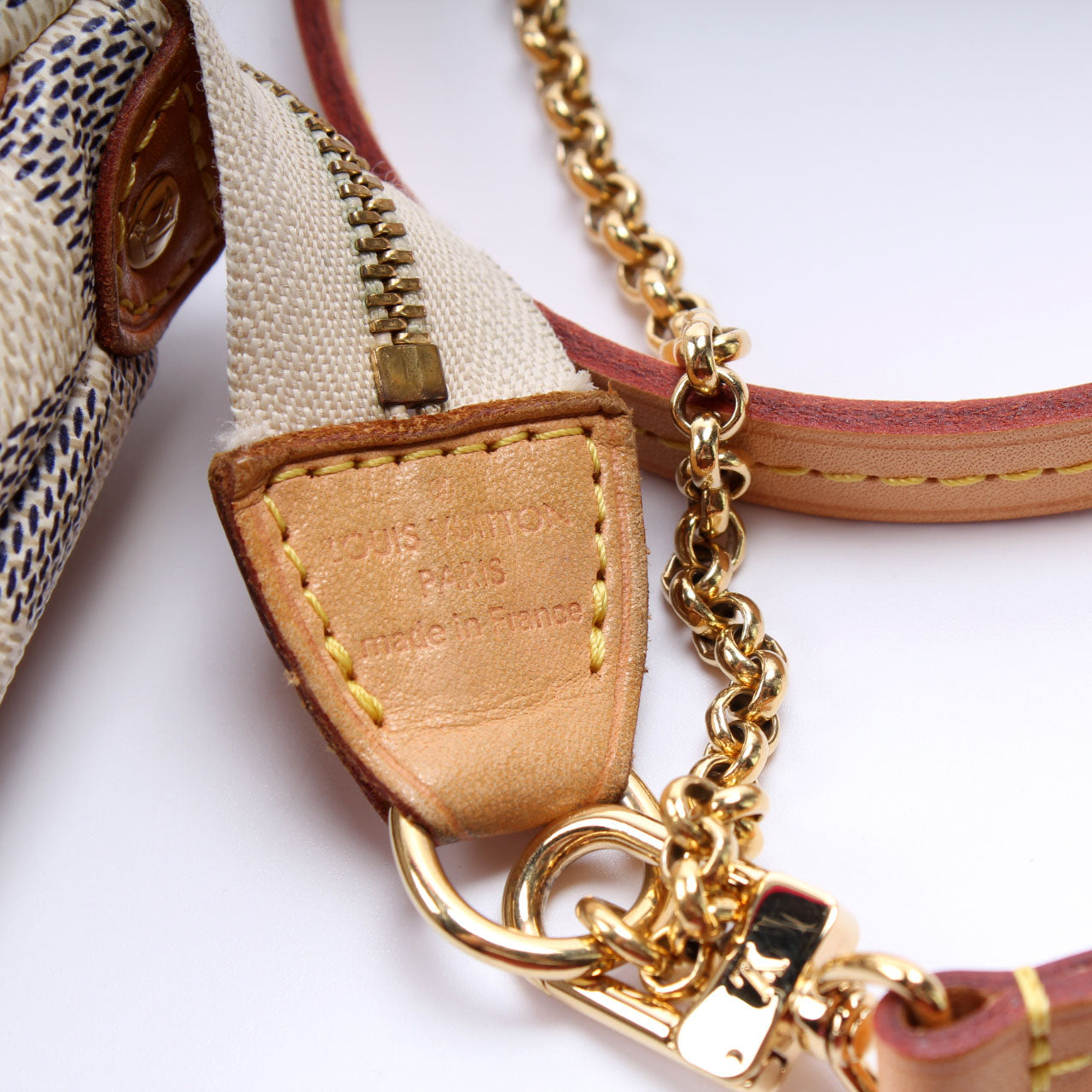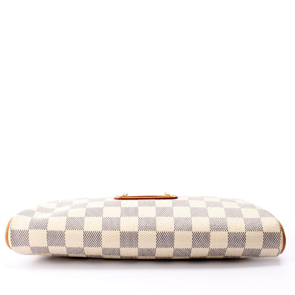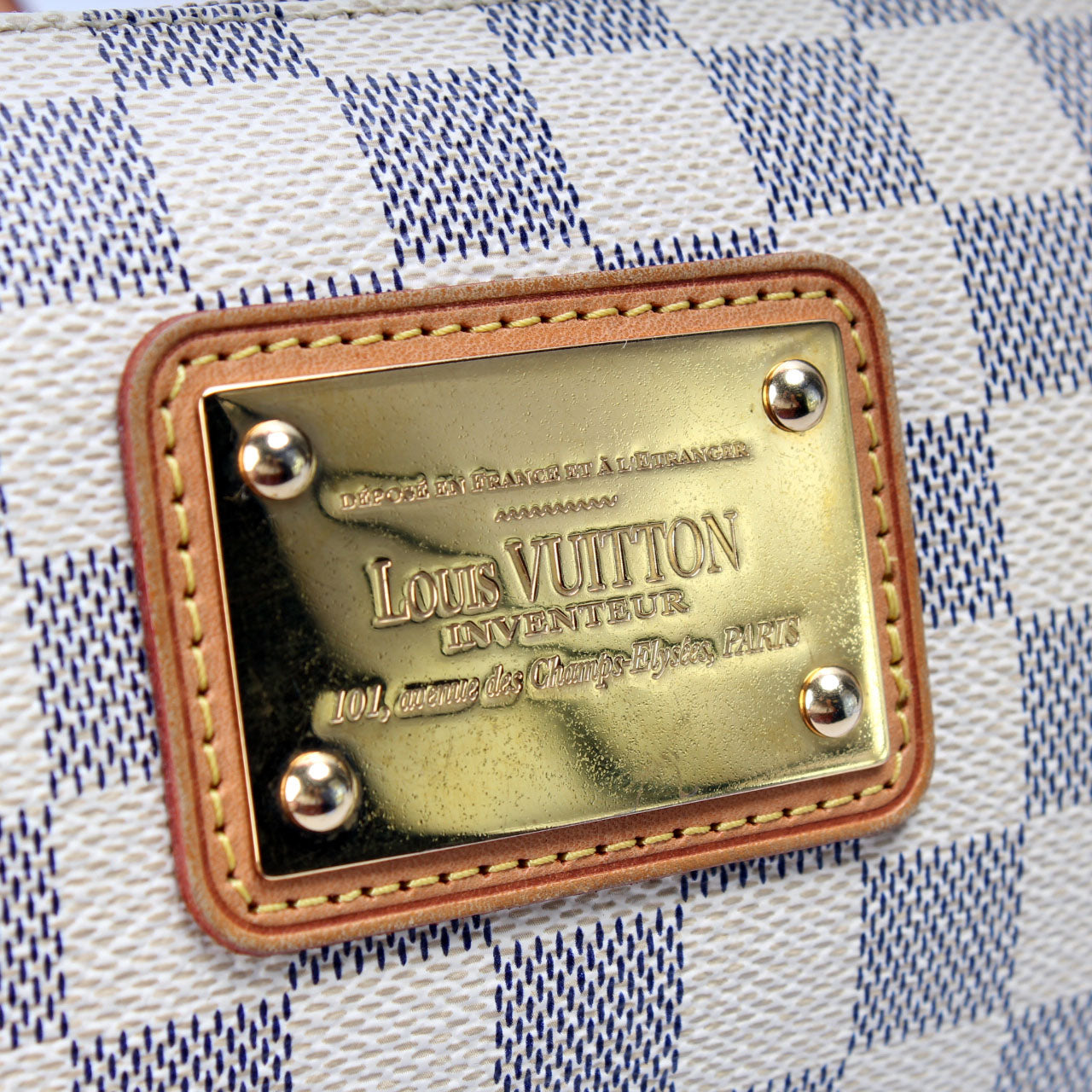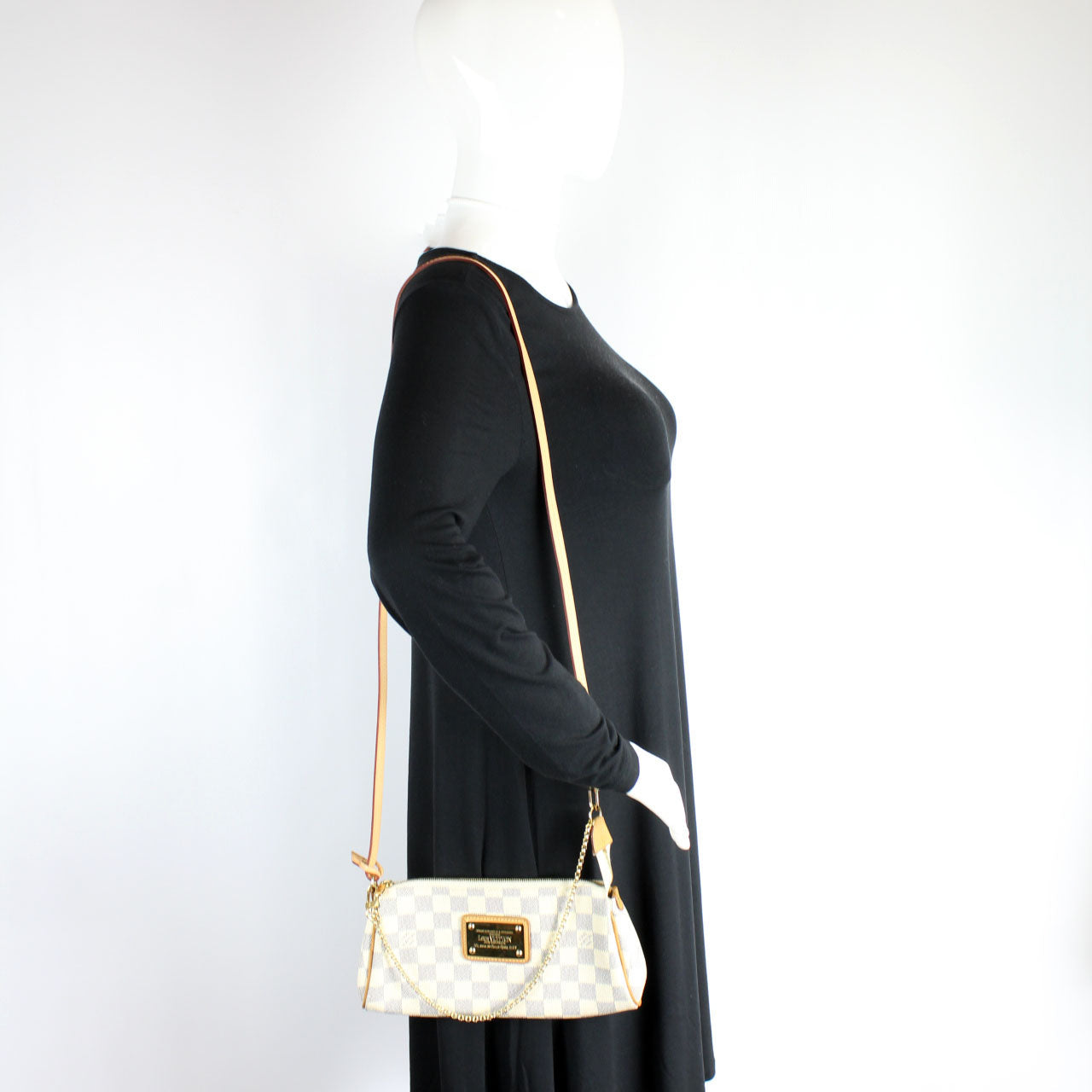 This Louis Vuitton Eva Clutchis eye catching bag. The exterior is in the classic Louis Vuitton Damier Azur coated canvas.