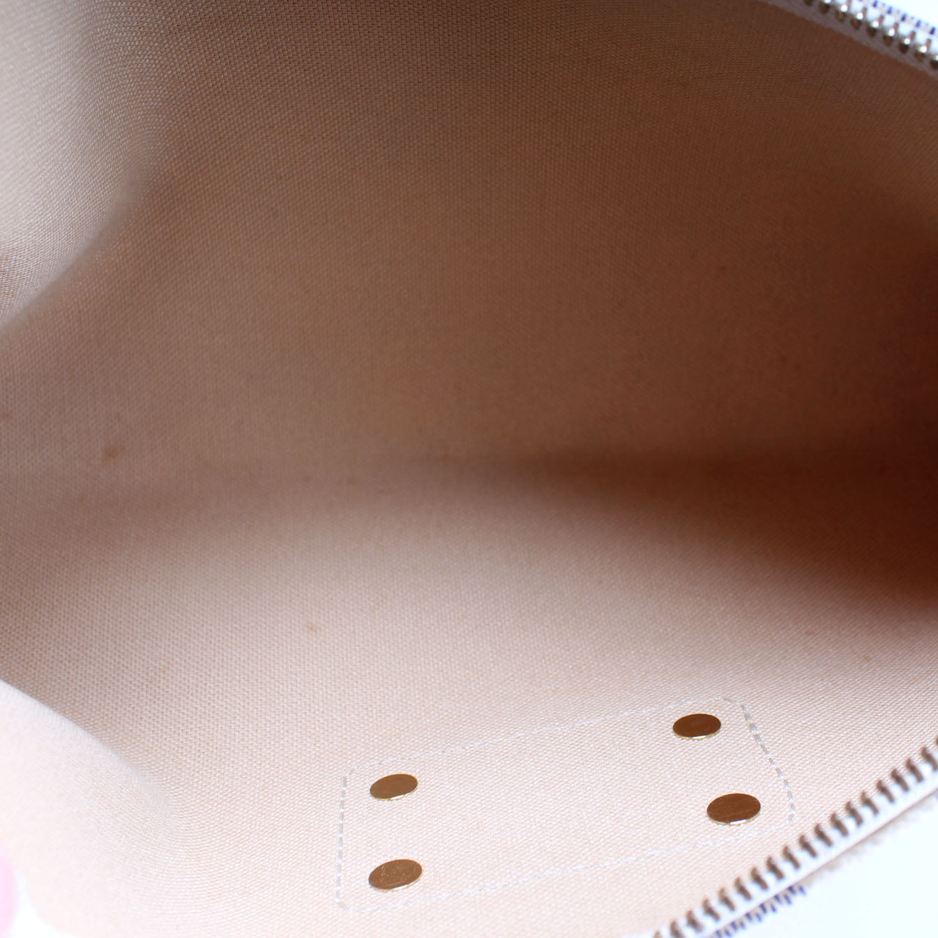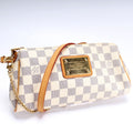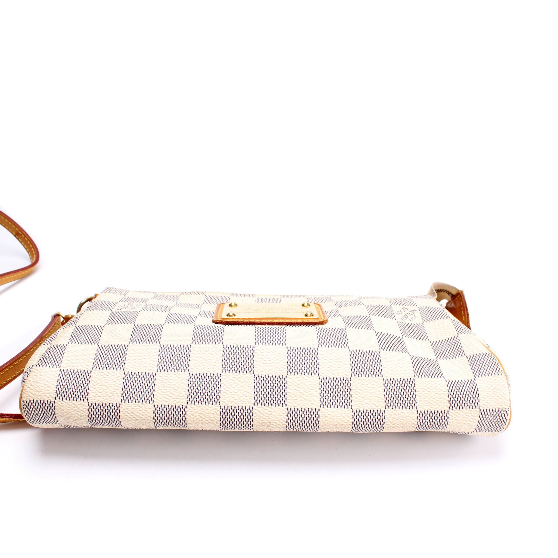 This Louis Vuitton Eva Clutchis eye catching bag. The exterior is in the classic Damier Azur coated canvas.
