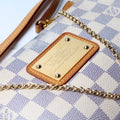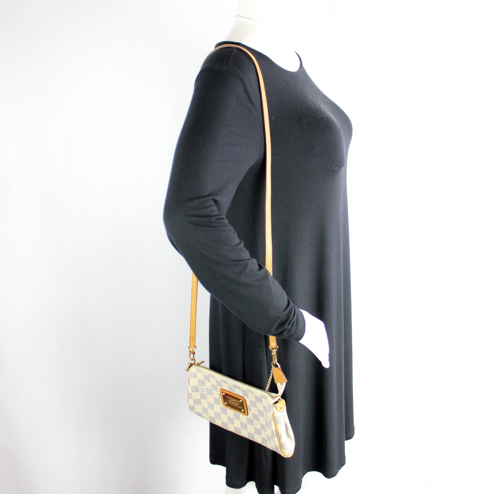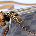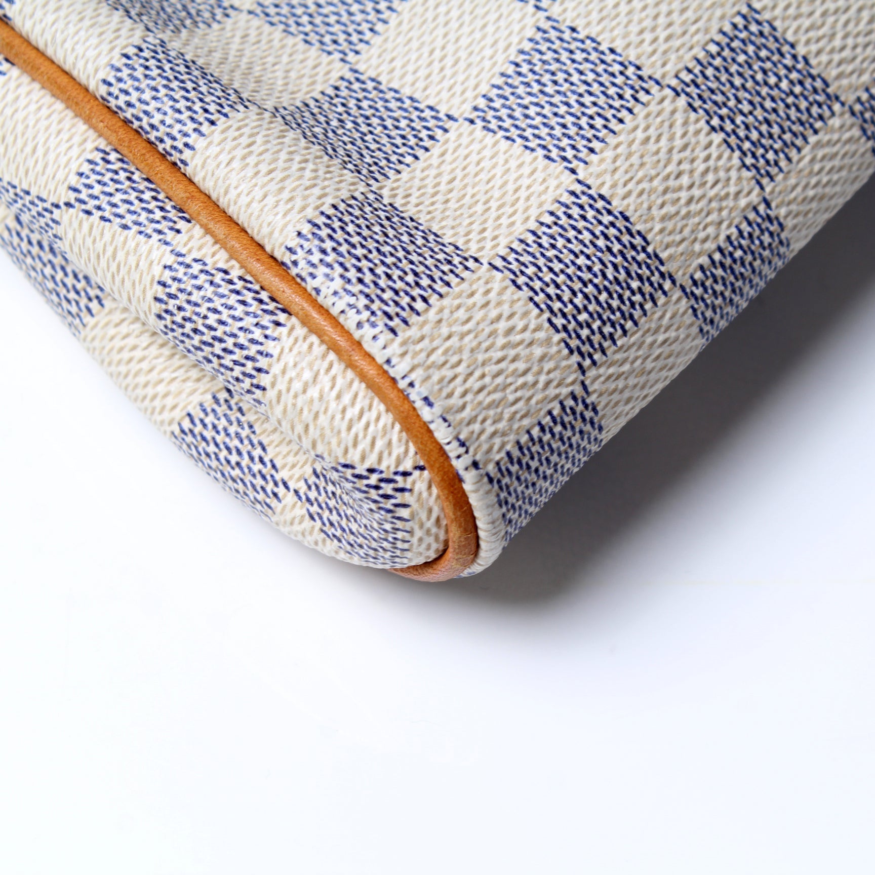 This Louis Vuitton Eva Clutchis eye catching bag. The exterior is in the classic Damier Azur coated canvas.