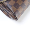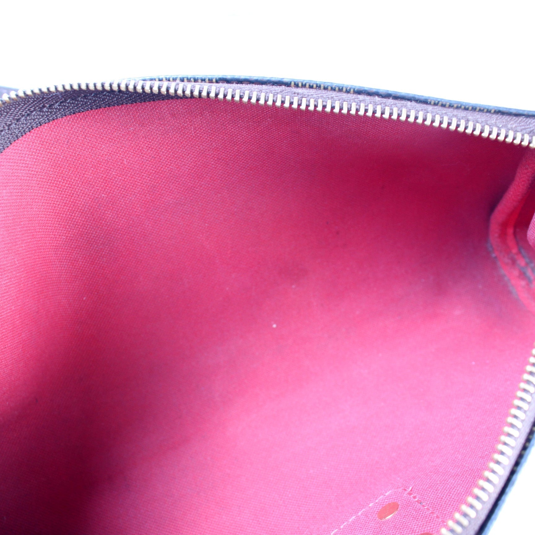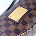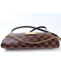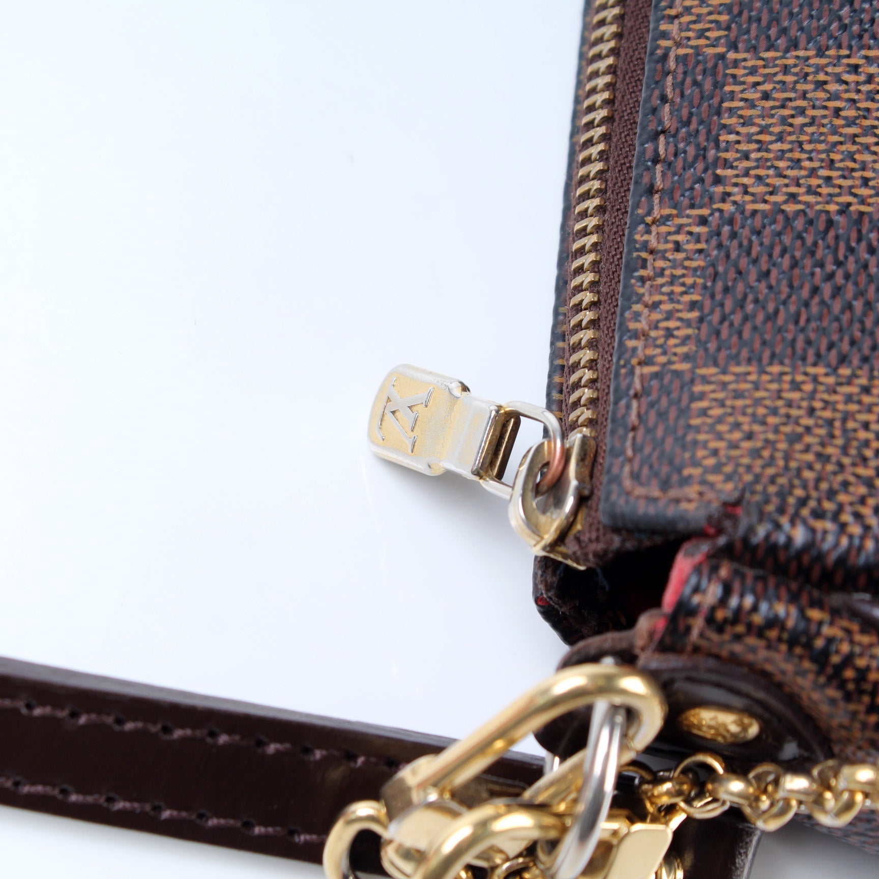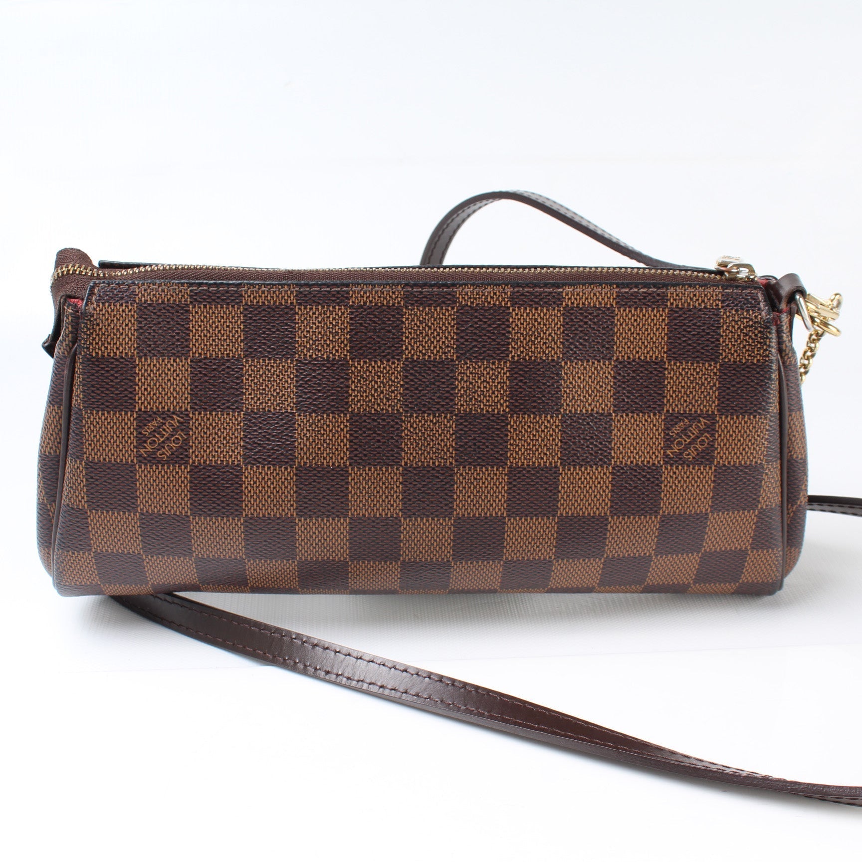 This Louis Vuitton Eva Clutchis eye catching bag. The exterior is in the classic Louis Vuitton Damier Ebene coated canvas.