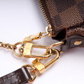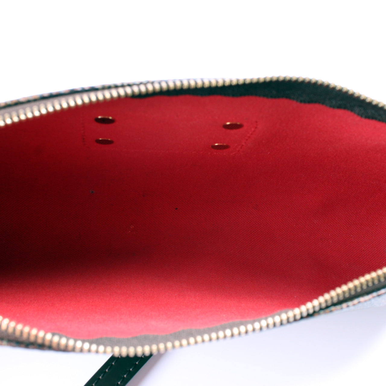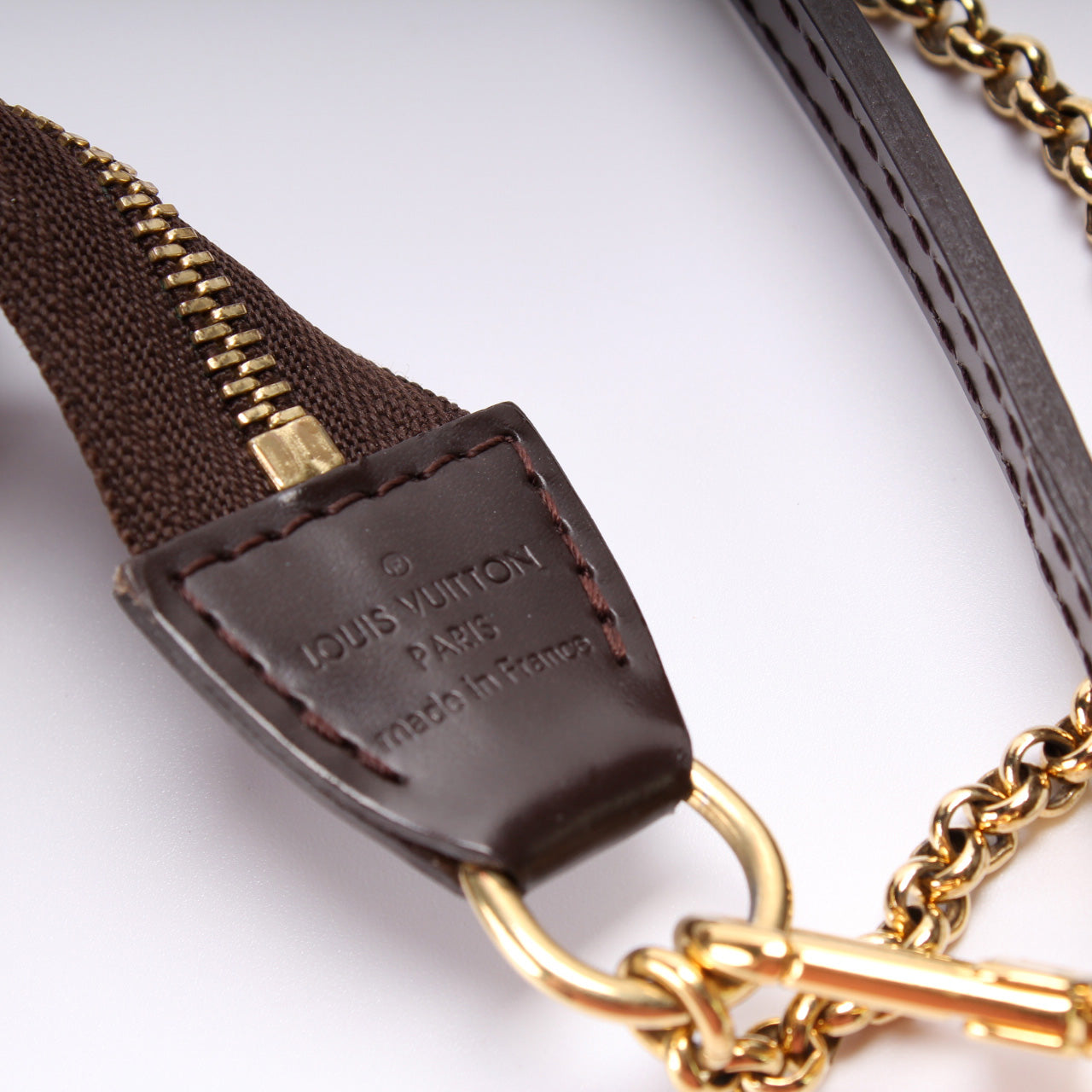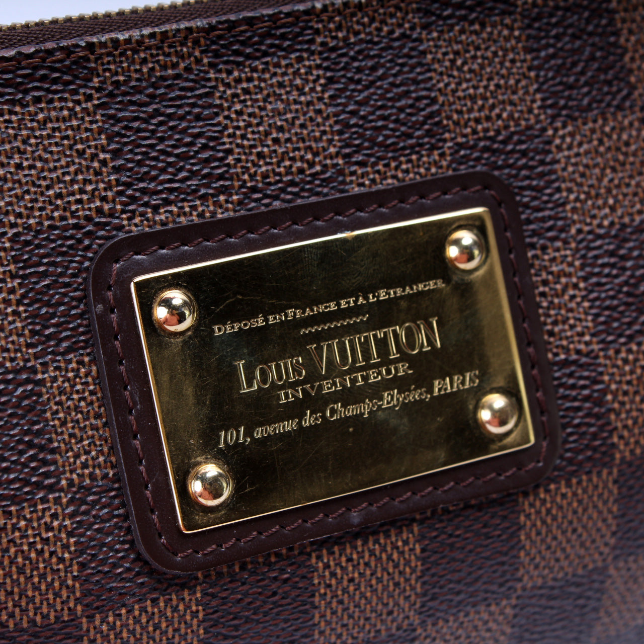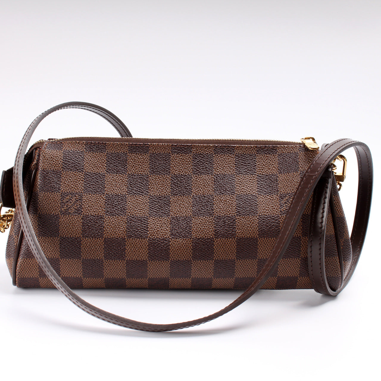 This Louis Vuitton Eva Clutchis eye catching bag. The exterior is in the classic Louis Vuitton Damier Ebene coated canvas.