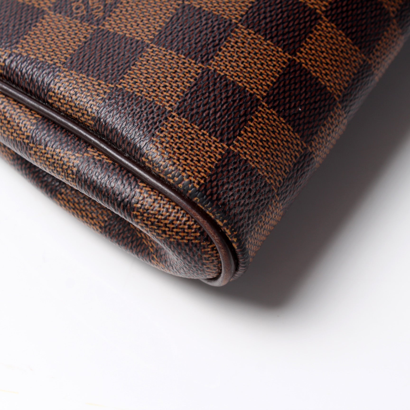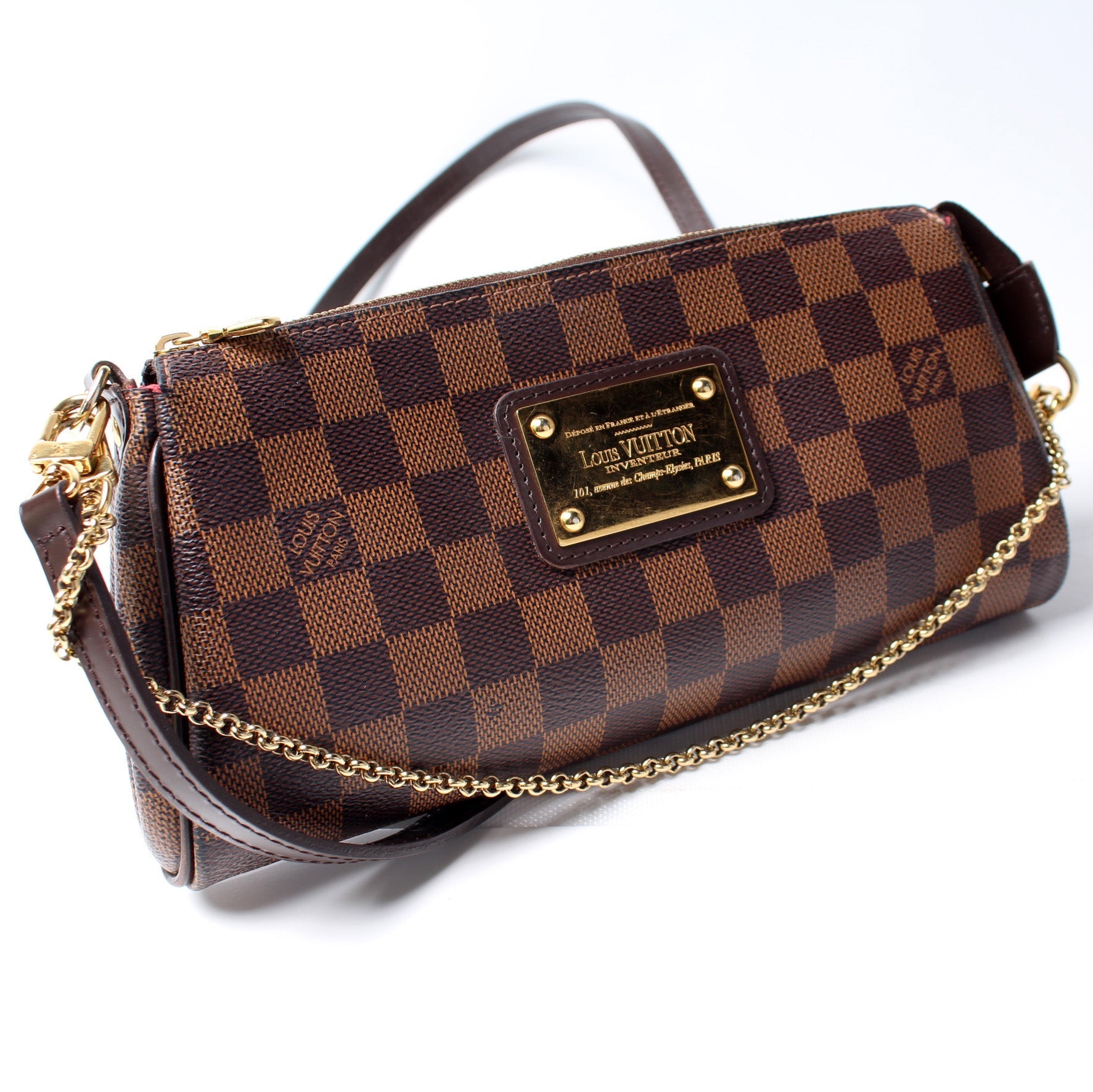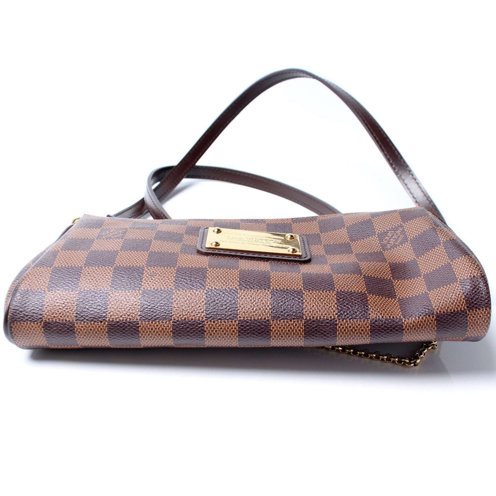 This Louis Vuitton Eva Clutchis eye catching bag. The exterior is in the classic Louis Vuitton Damier Ebene coated canvas.