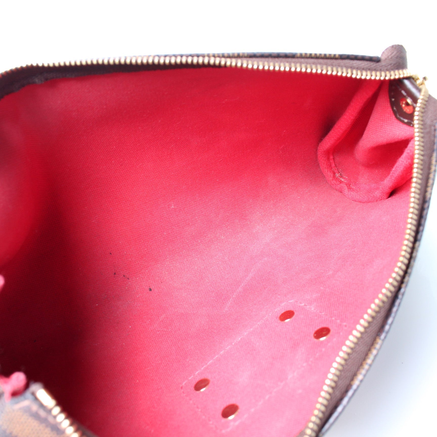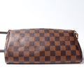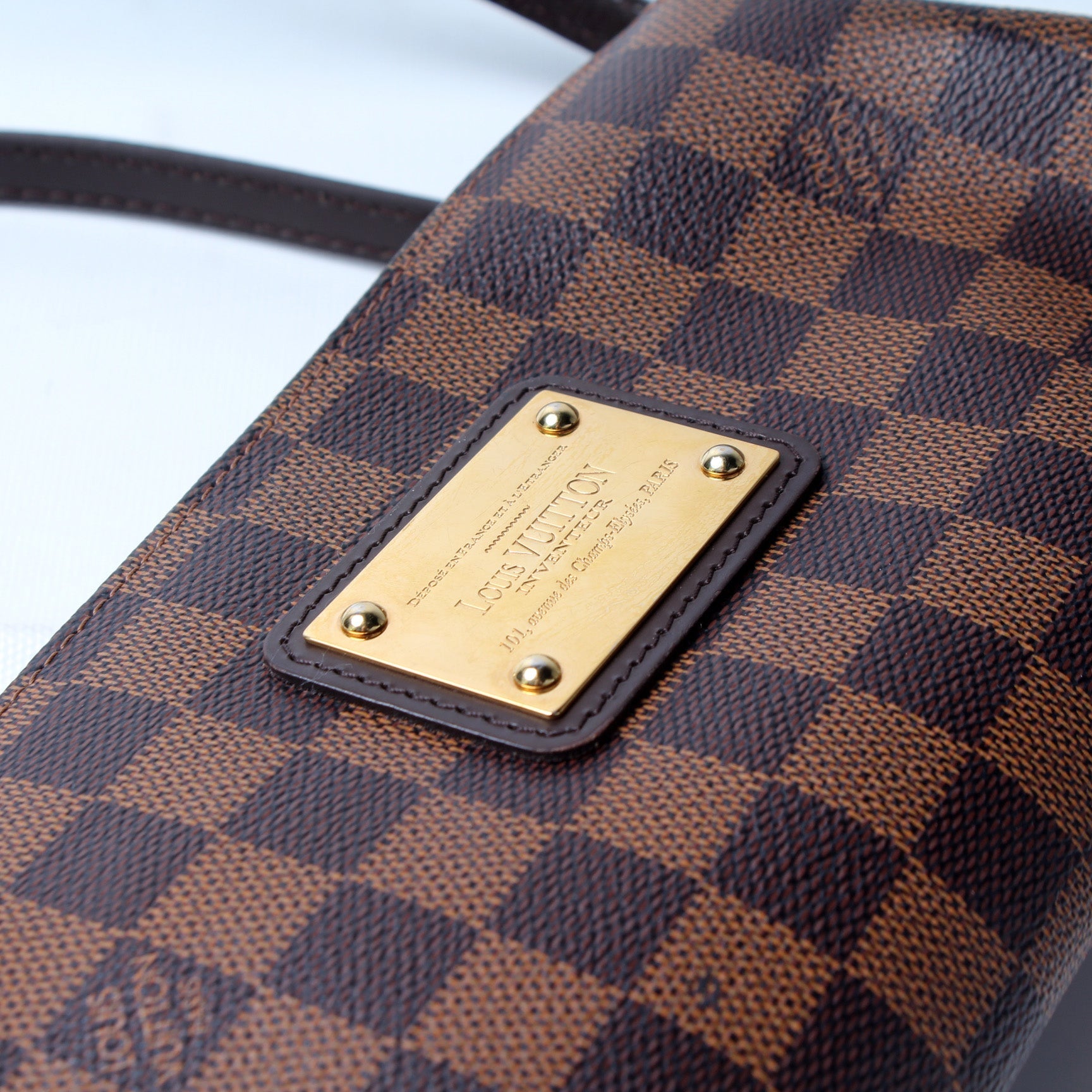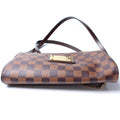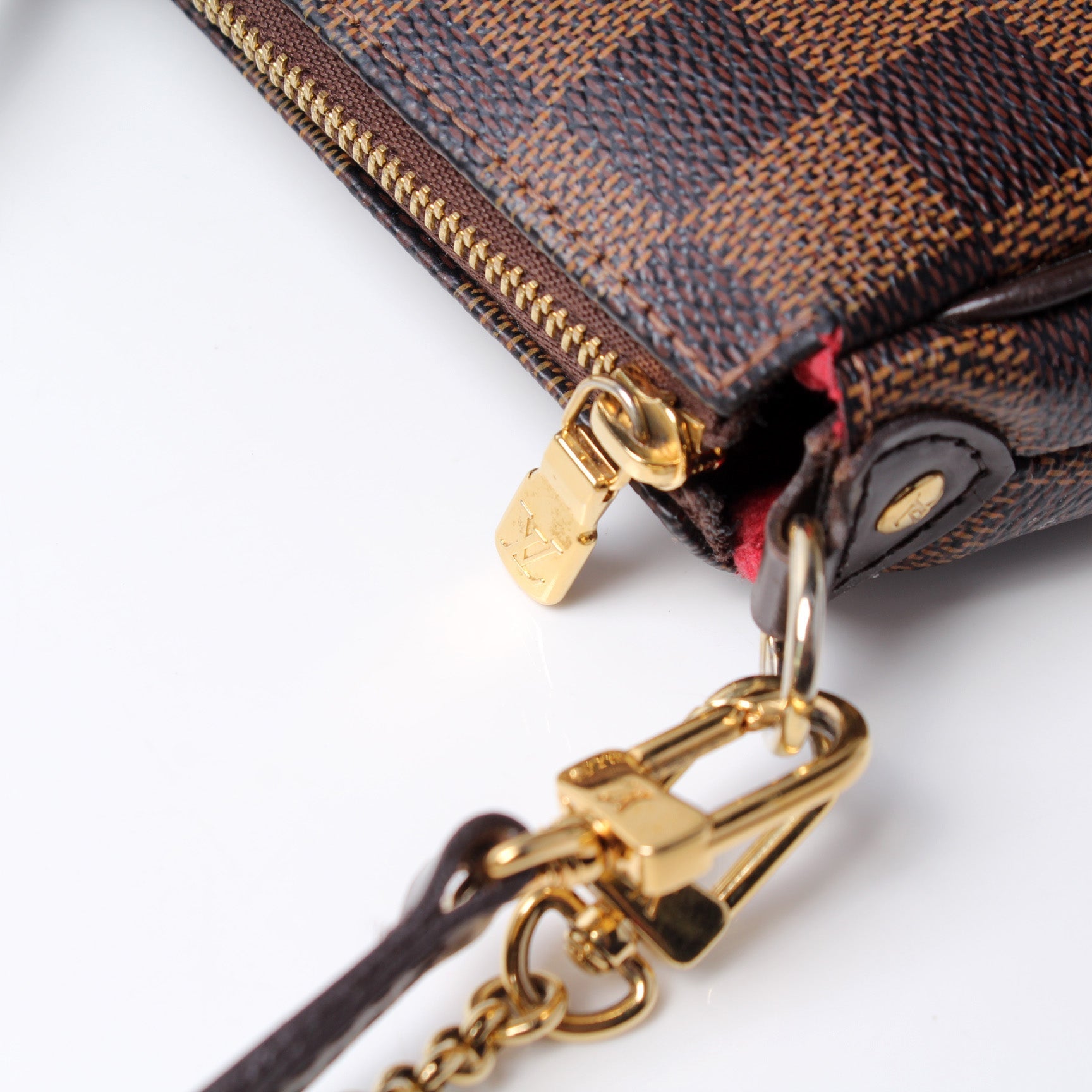 This Louis Vuitton Eva Clutchis eye catching bag. The exterior is in the classic Louis Vuitton Damier Ebene coated canvas.