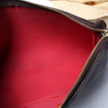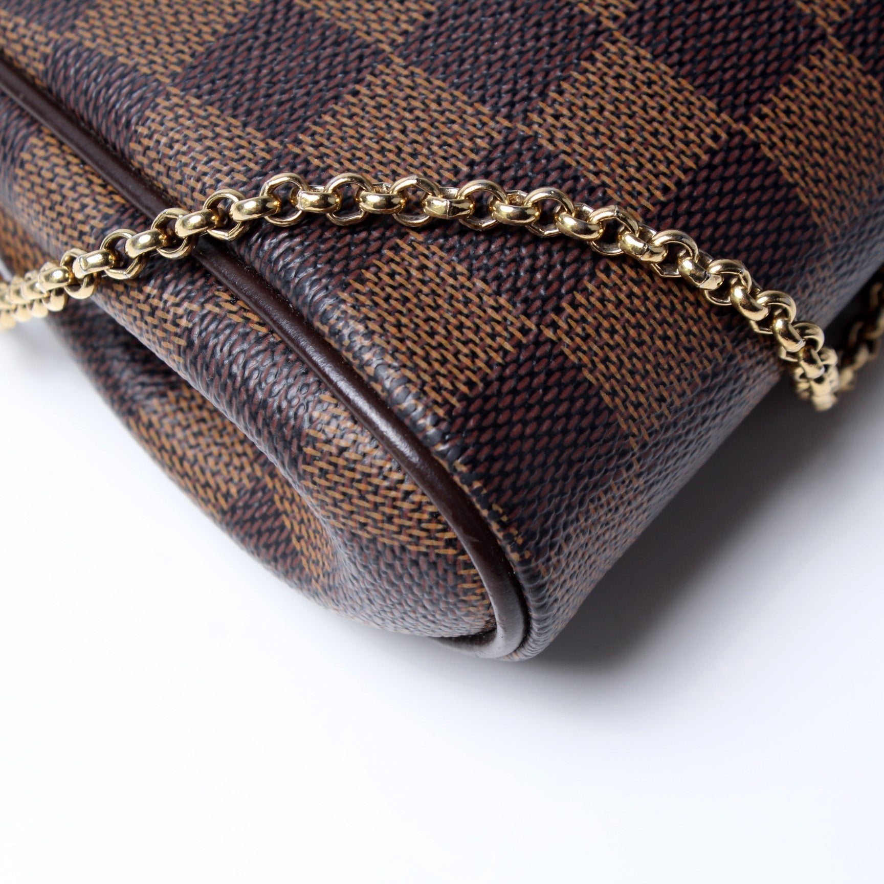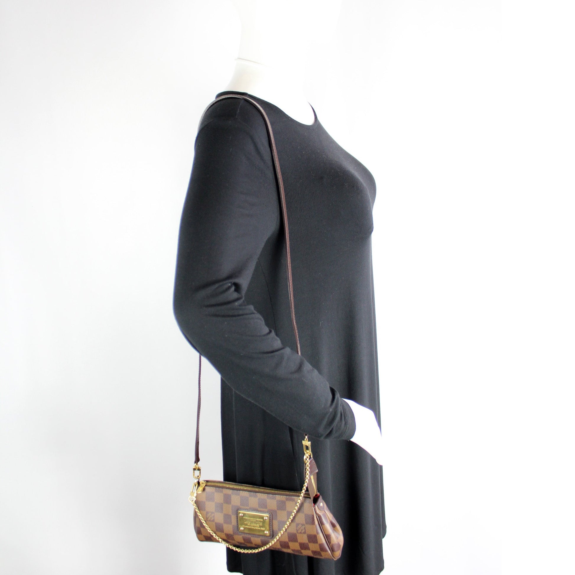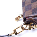This Louis Vuitton Eva Clutchis eye catching bag. The exterior is in the classic Louis Vuitton Damier Ebene coated canvas.