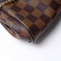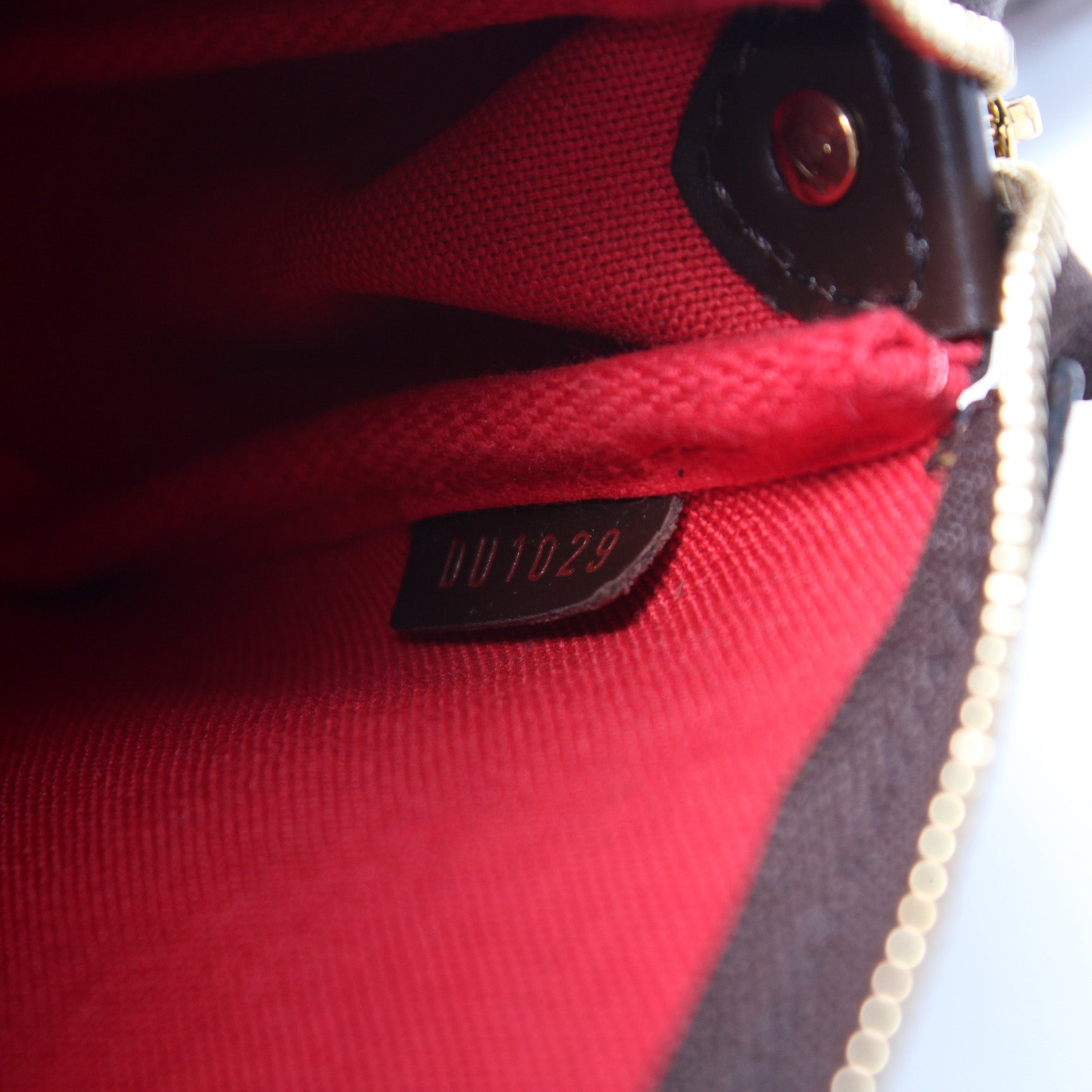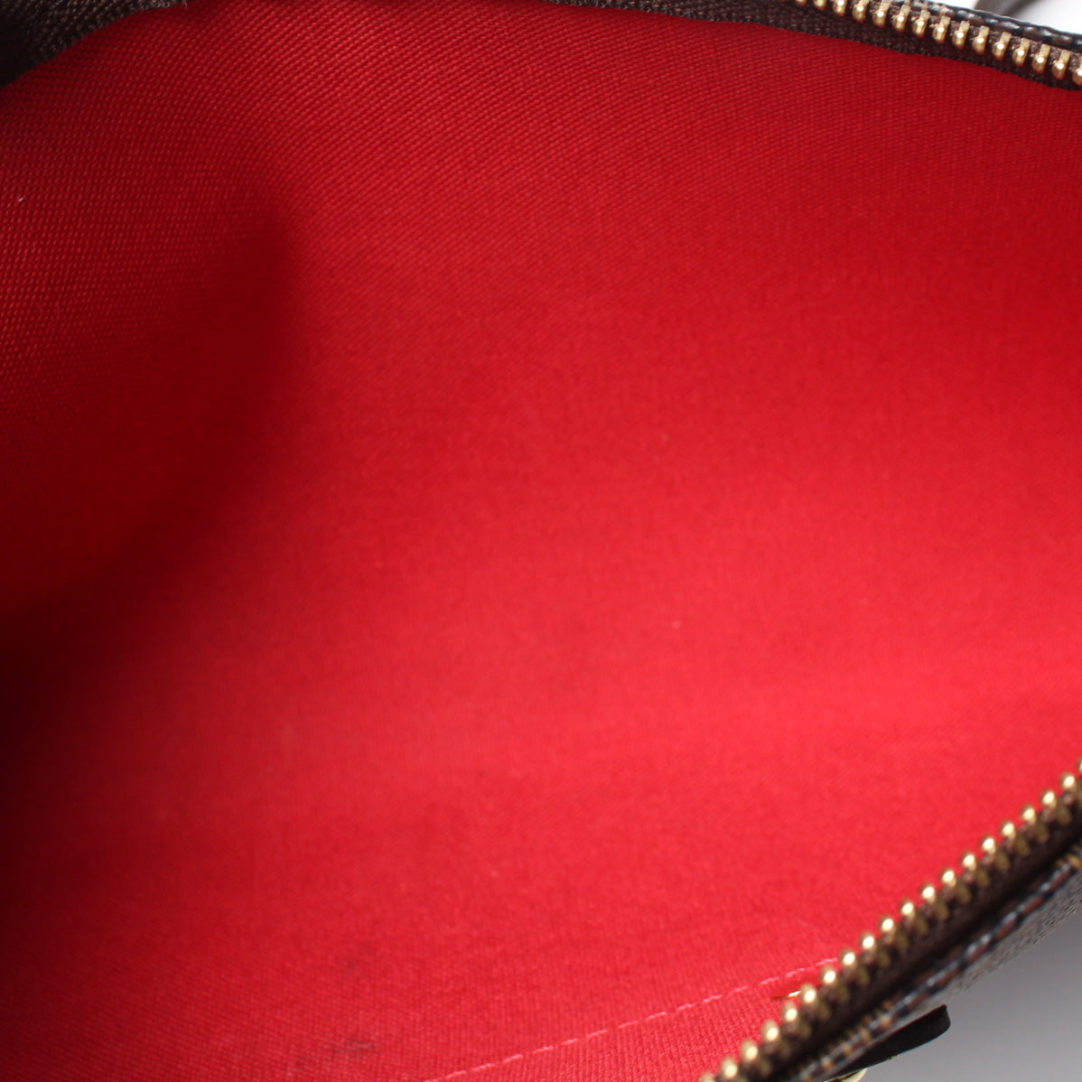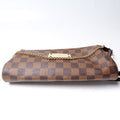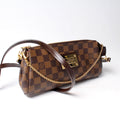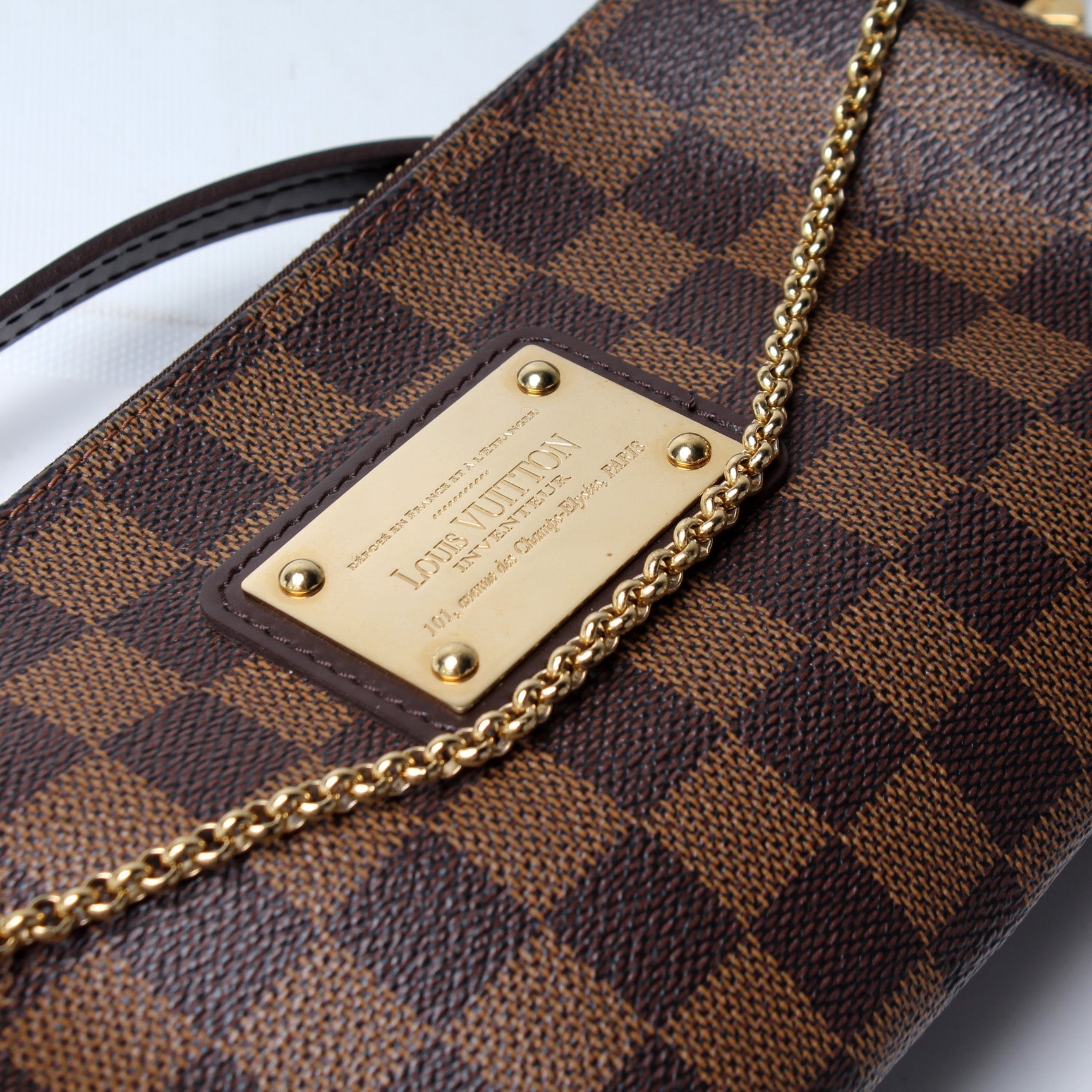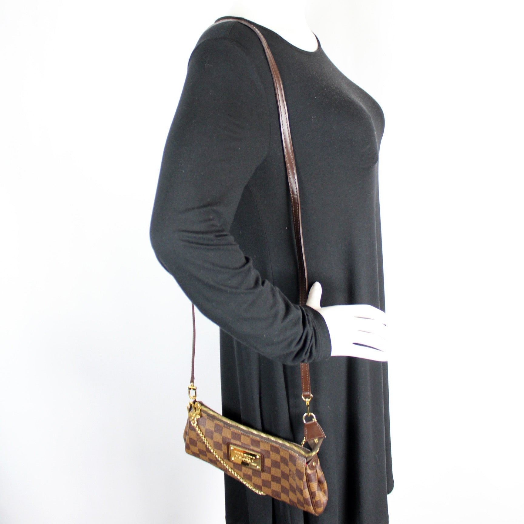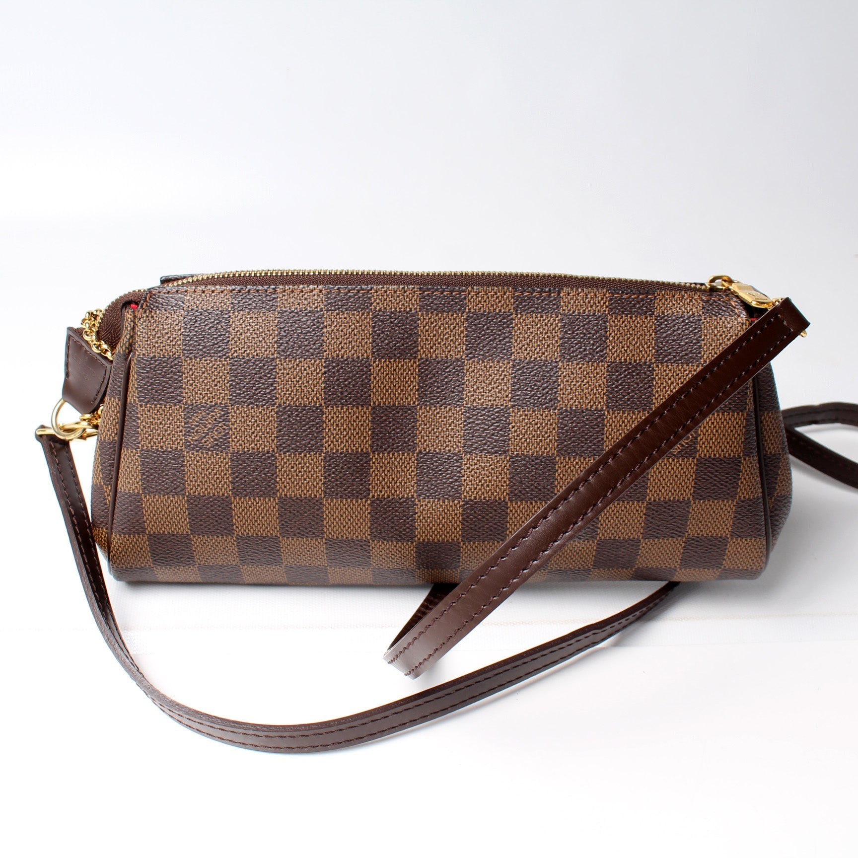 This Louis Vuitton Eva Clutchis eye catching bag. The exterior is in the classic Damier Ebene coated canvas.