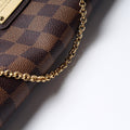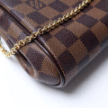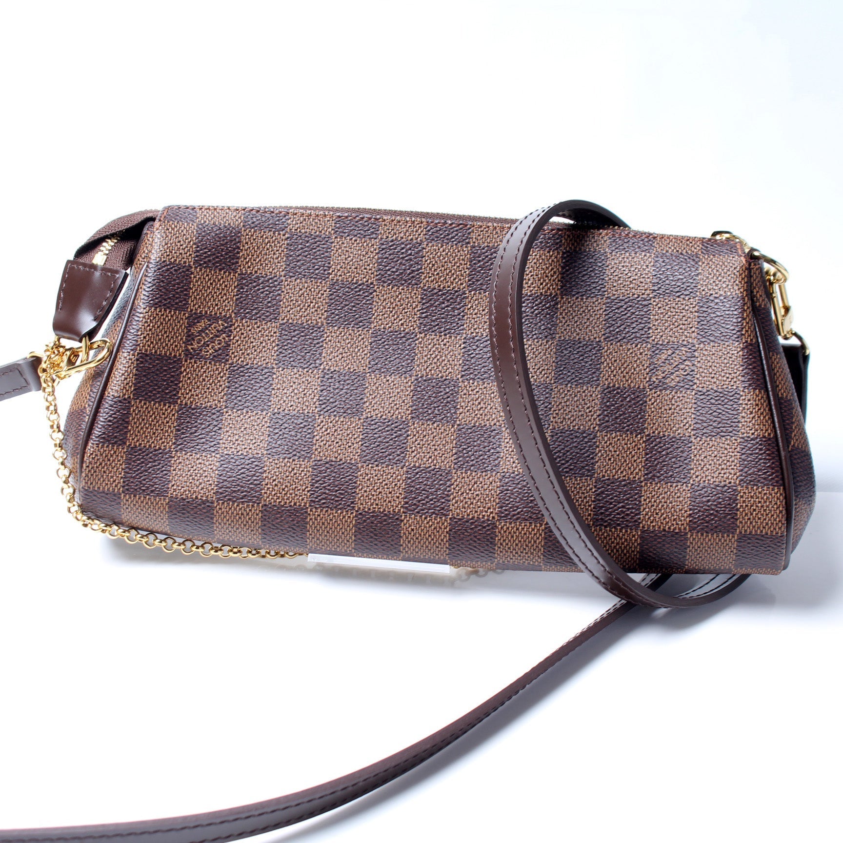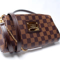 This Louis Vuitton Eva Clutchis eye catching bag. The exterior is in the classic Damier Ebene coated canvas.