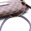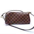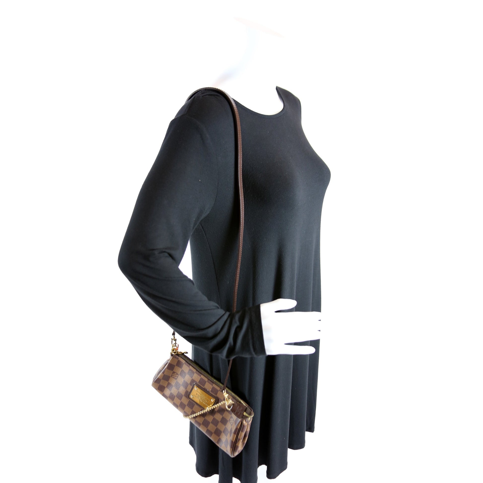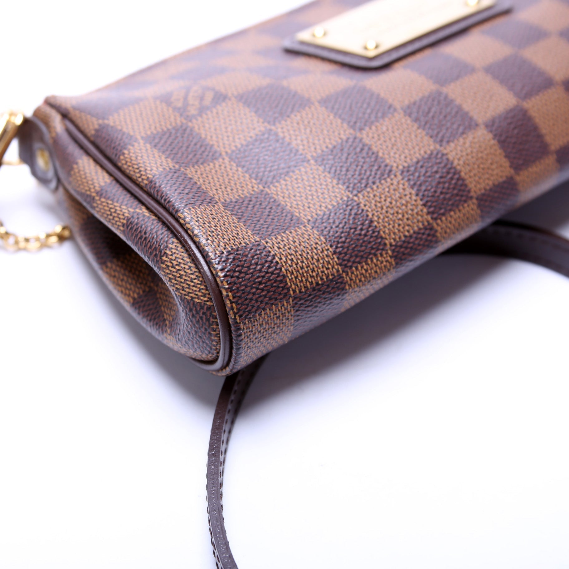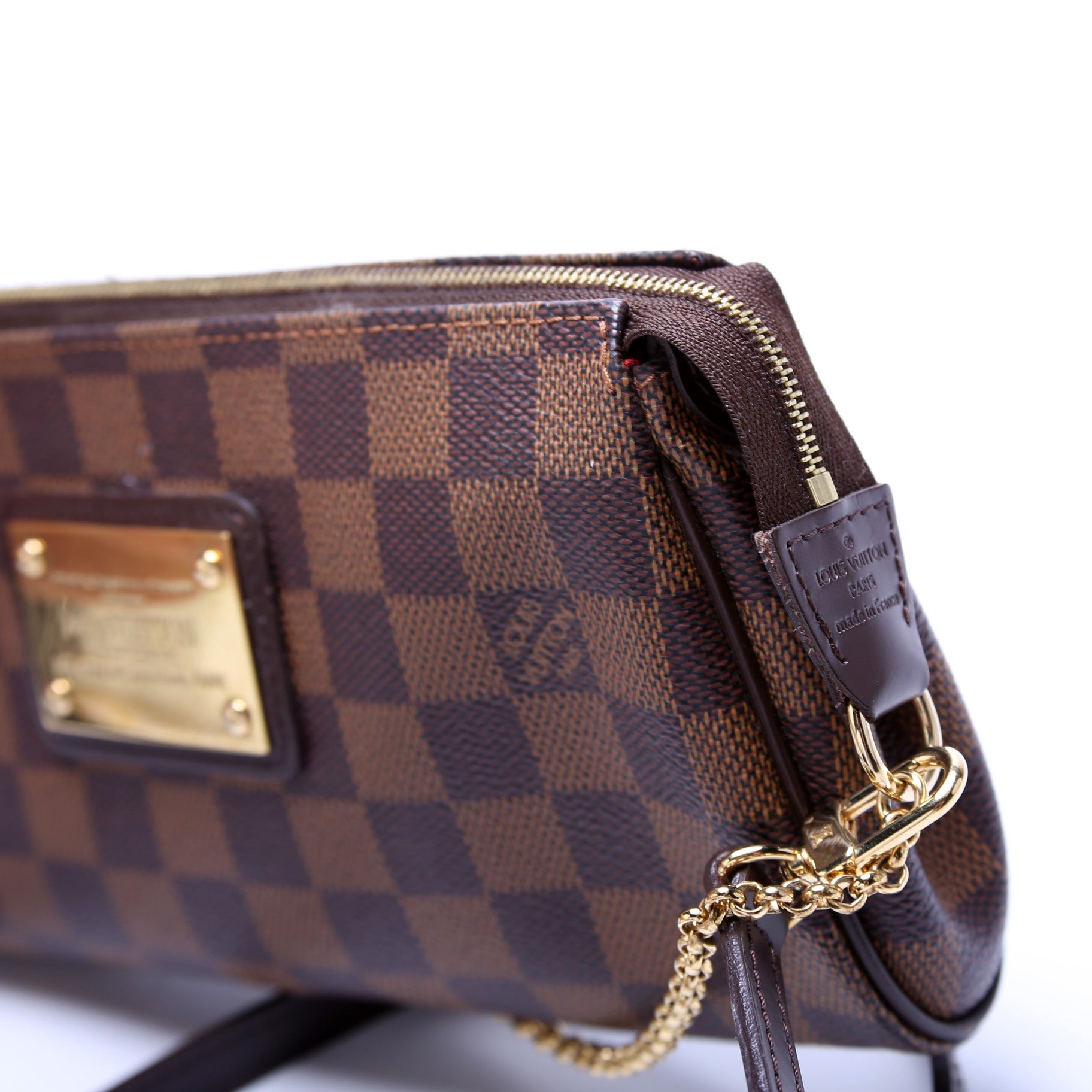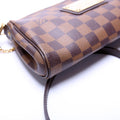 This Louis Vuitton Eva Clutchis eye catching bag. The exterior is in the classic Louis Vuitton Damier Ebene coated canvas.