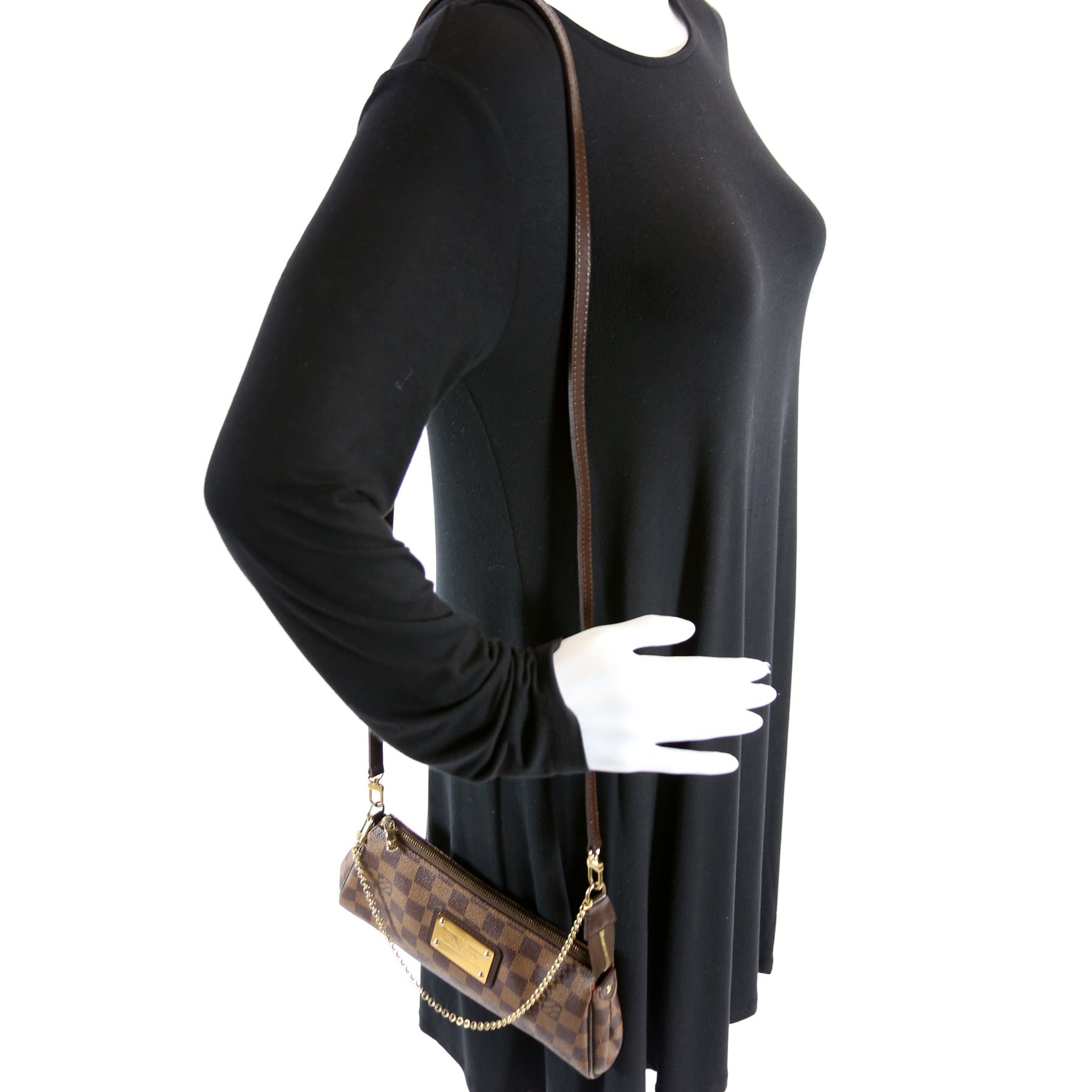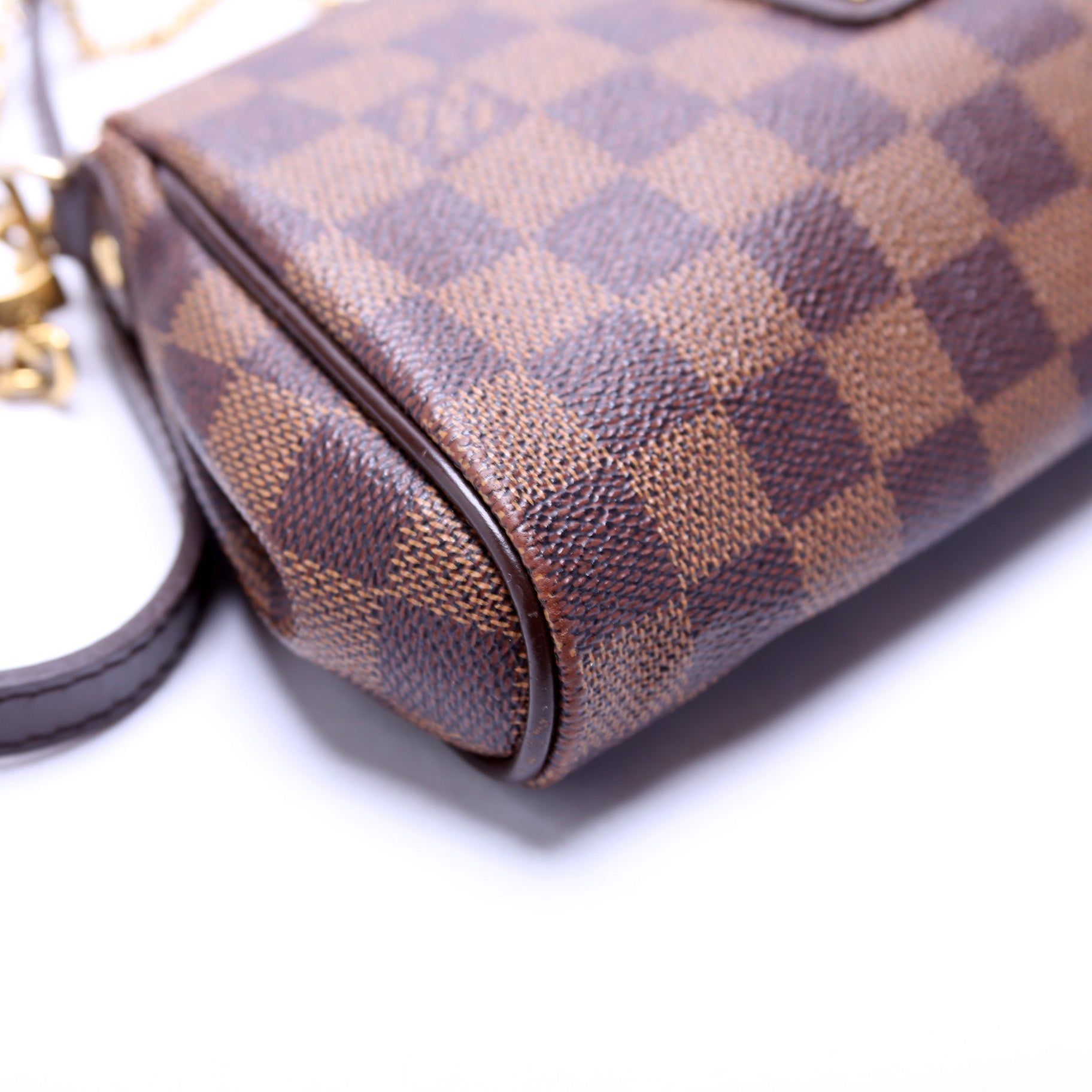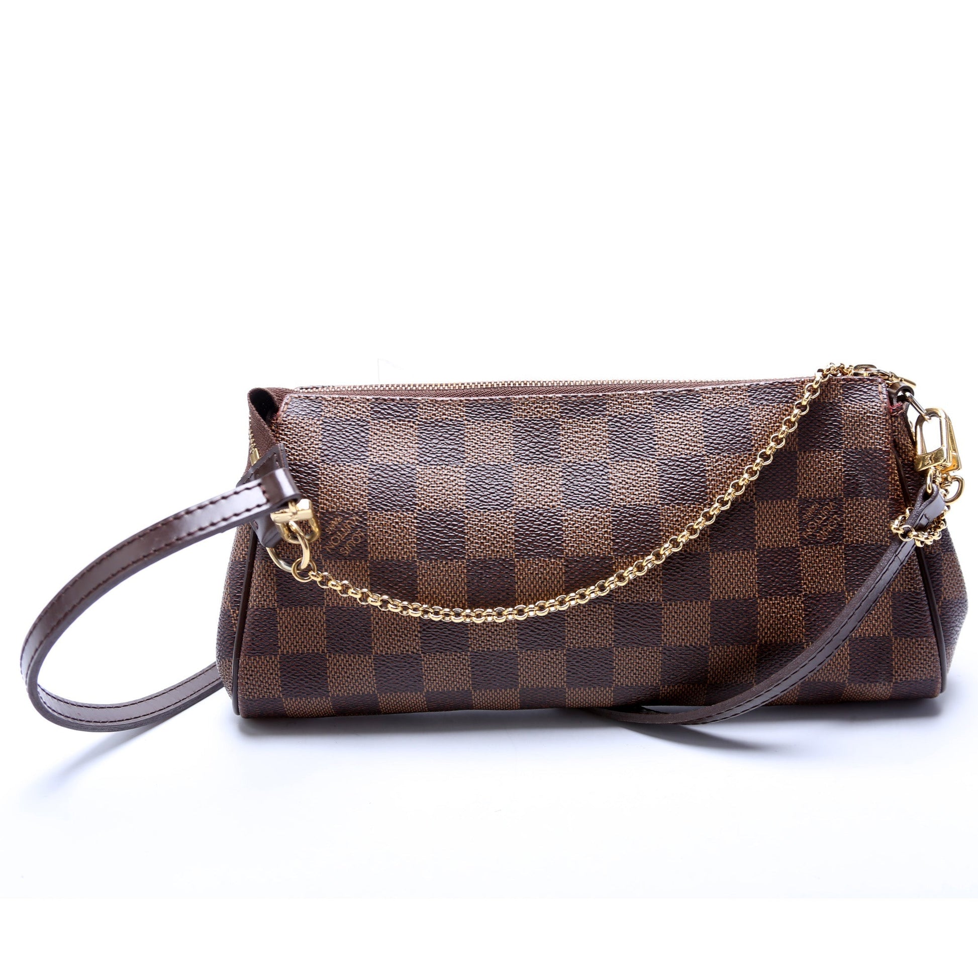 This Louis Vuitton Eva Clutchis eye catching bag. The exterior is in the classic Louis Vuitton Damier Ebene coated canvas.