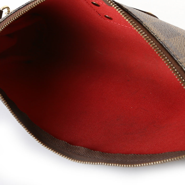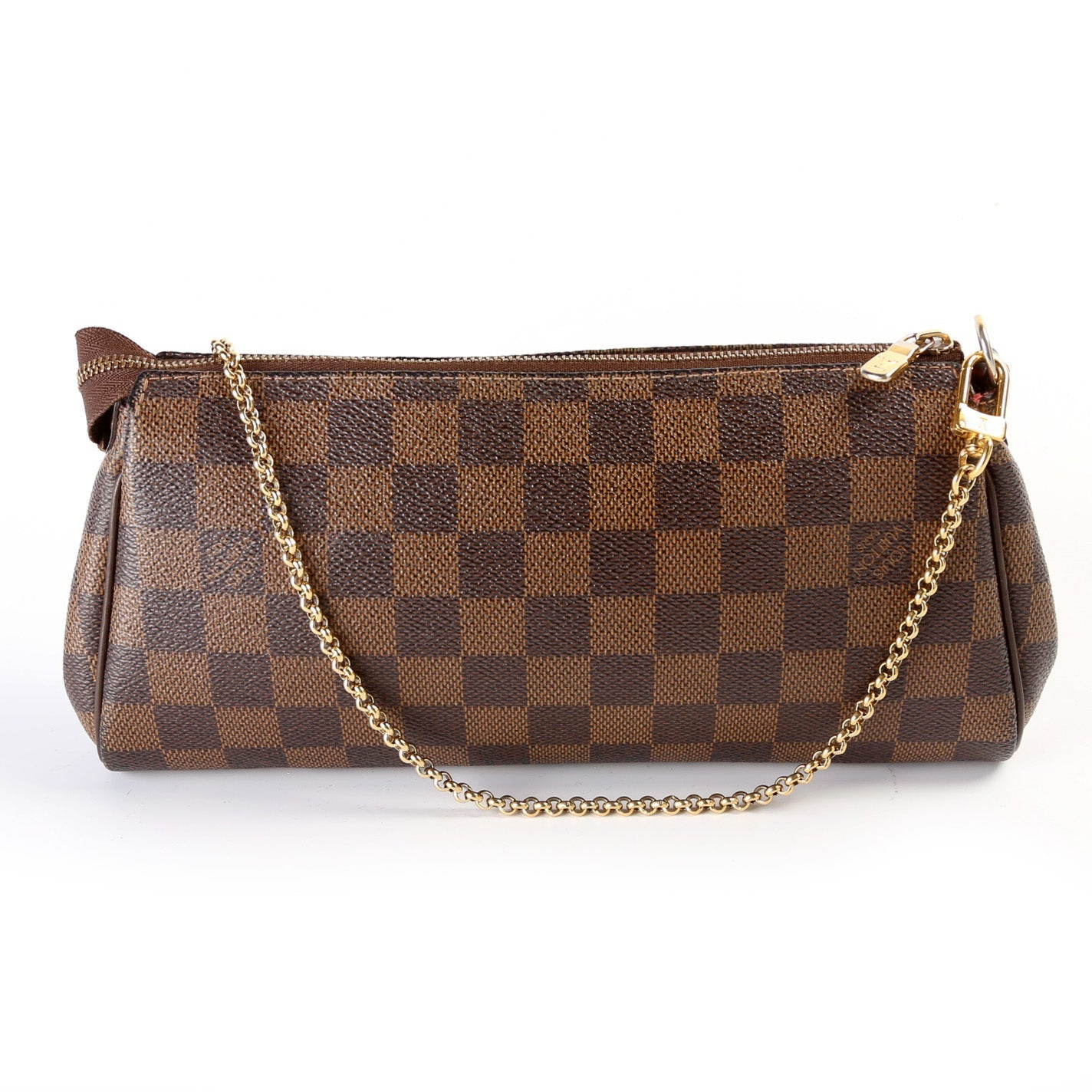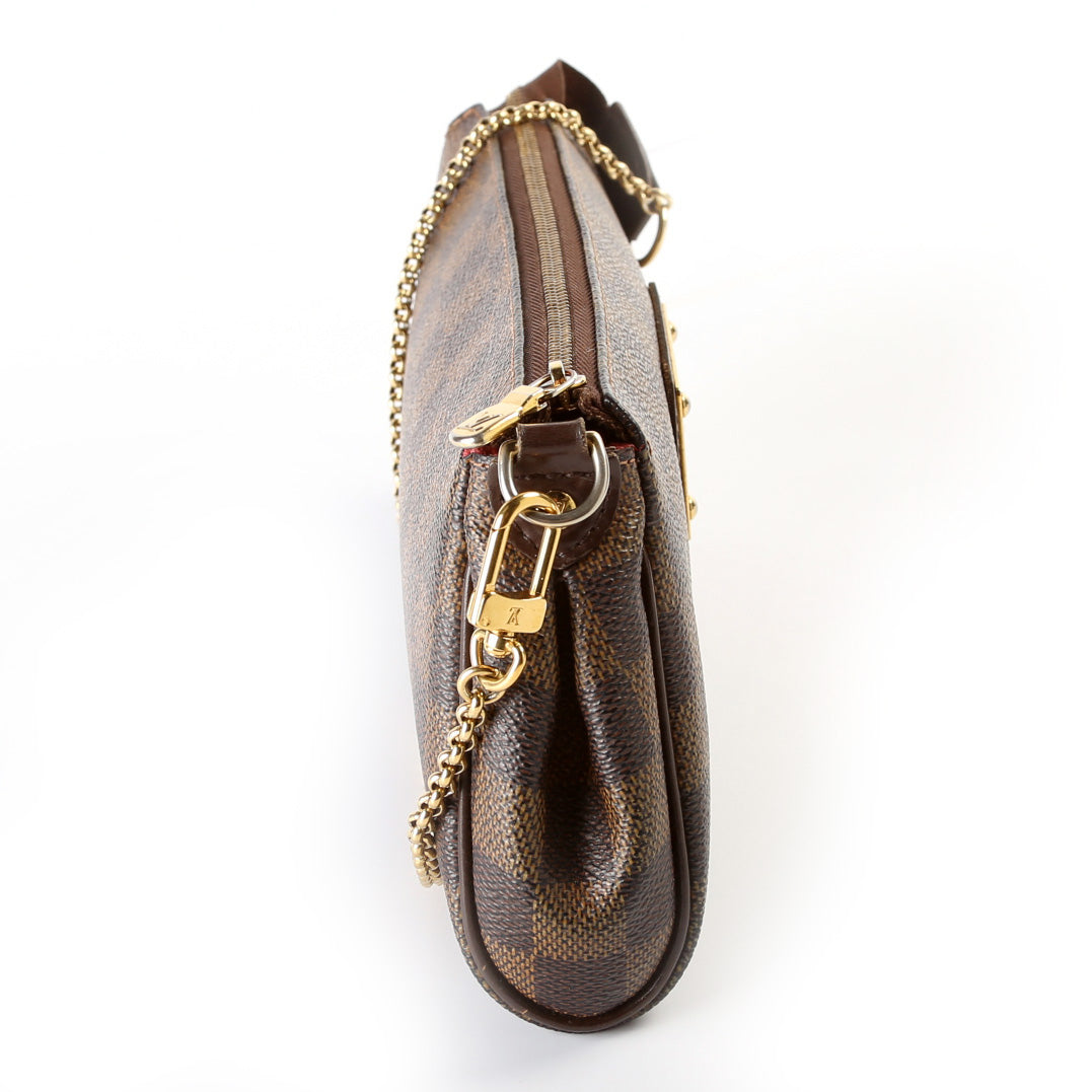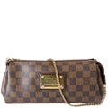 This Louis Vuitton Eva Clutchis eye catching bag. The exterior is in the classic Damier Ebene coated canvas.