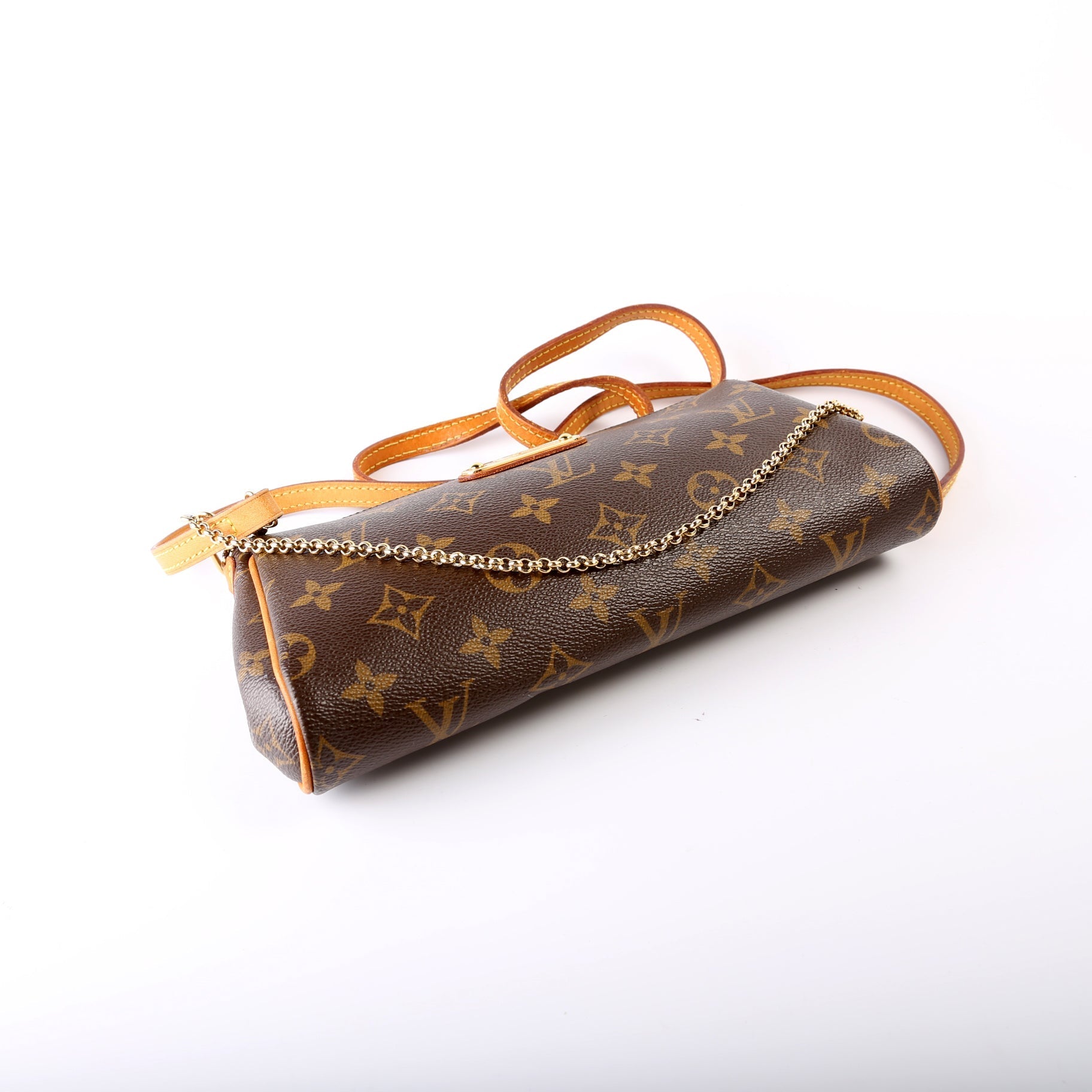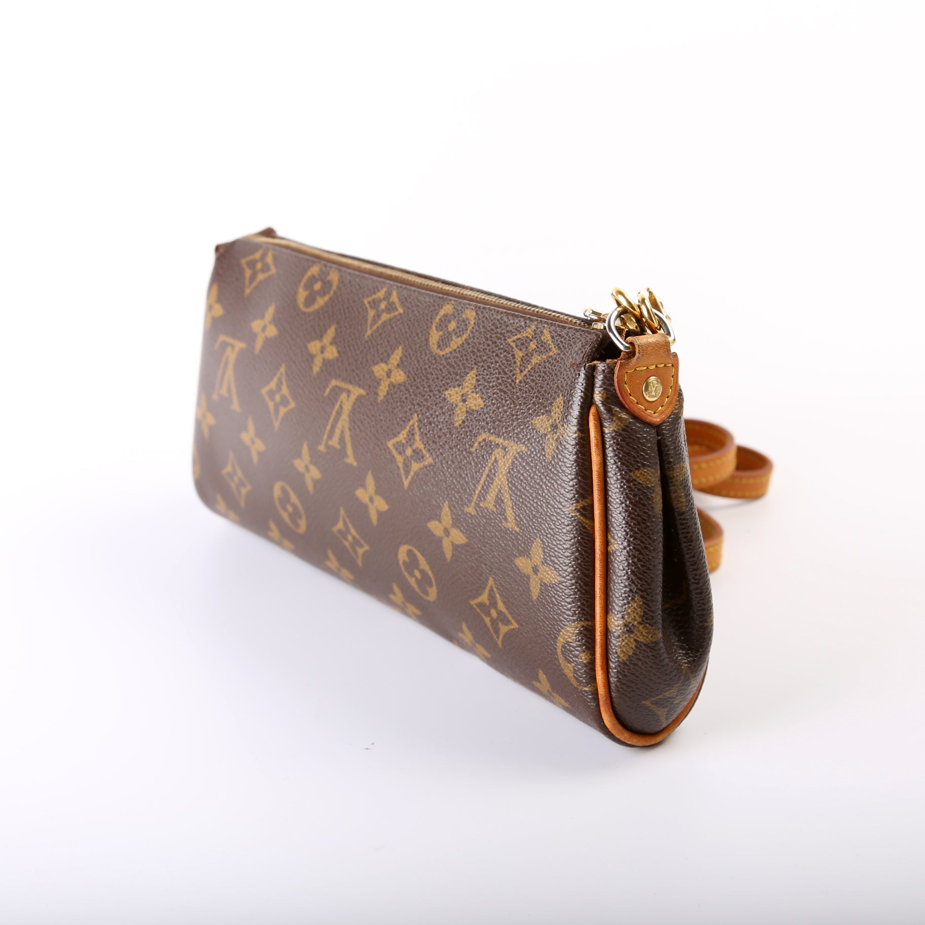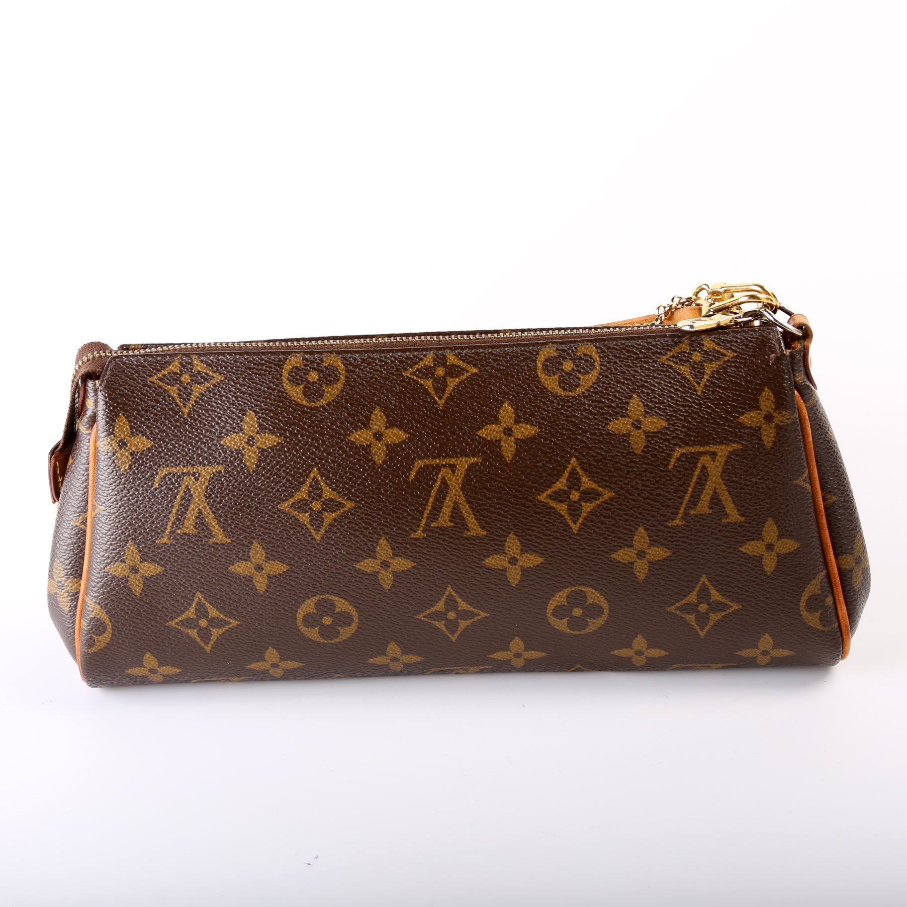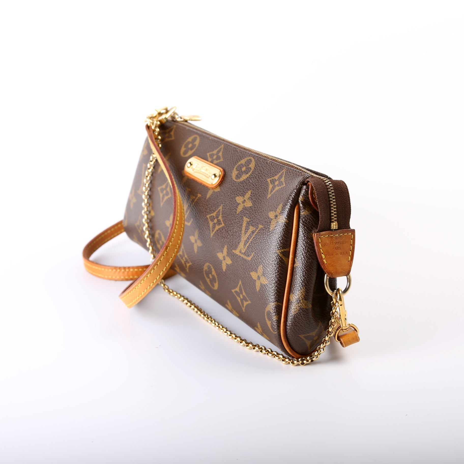 This Louis Vuitton Eva Clutchis eye catching bag. The exterior is in the classic Monogram coated canvas.
