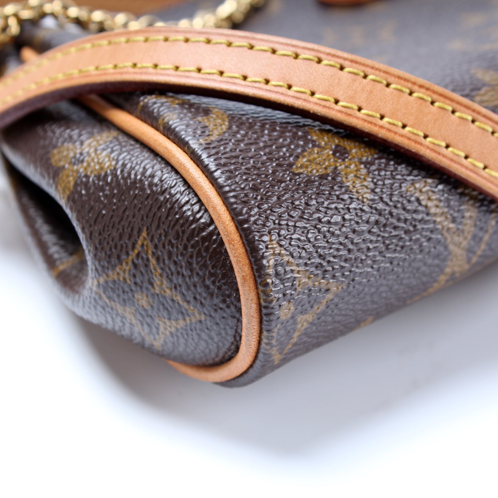 This Louis Vuitton Eva Clutchis eye catching bag. The exterior is in the classic monogram coated canvas.