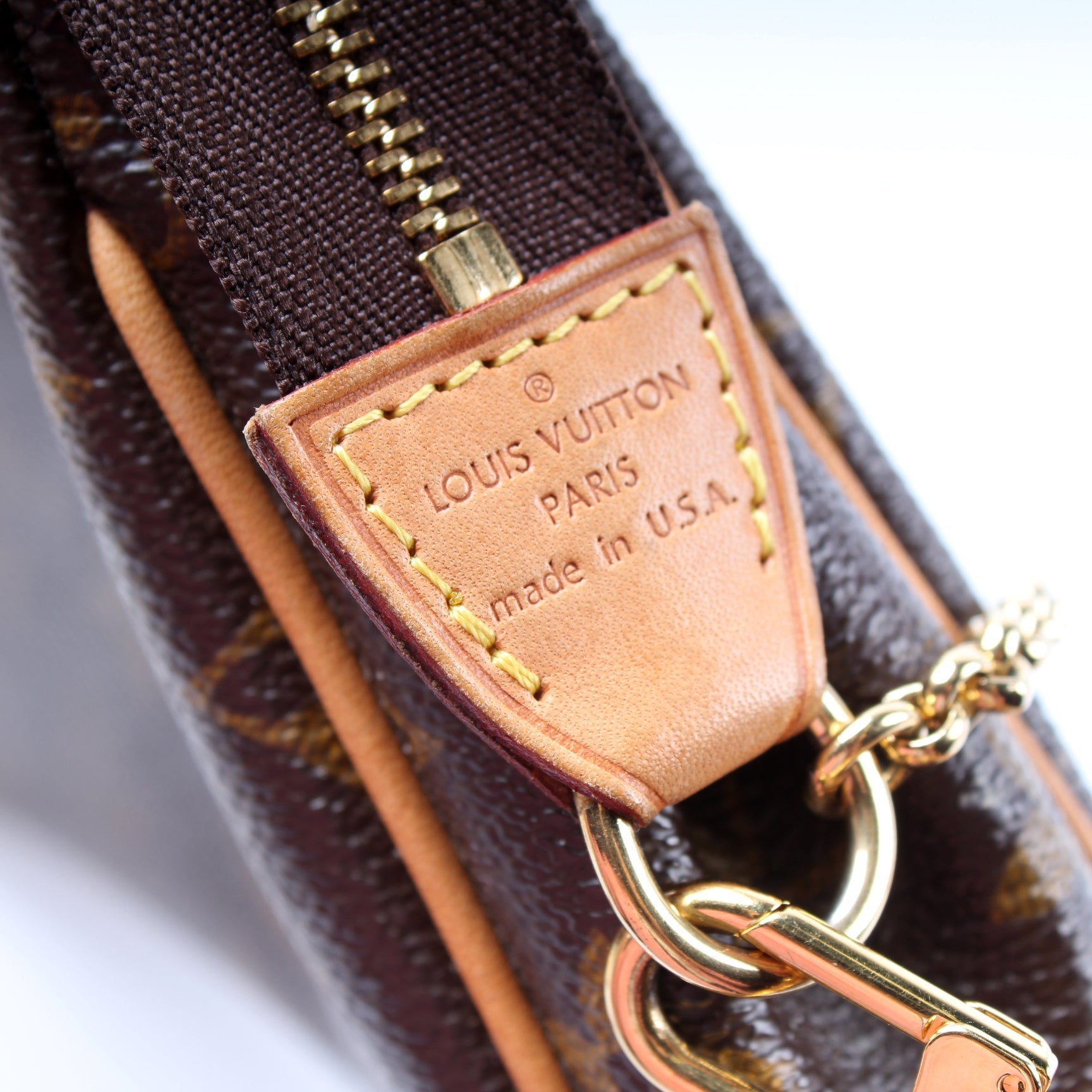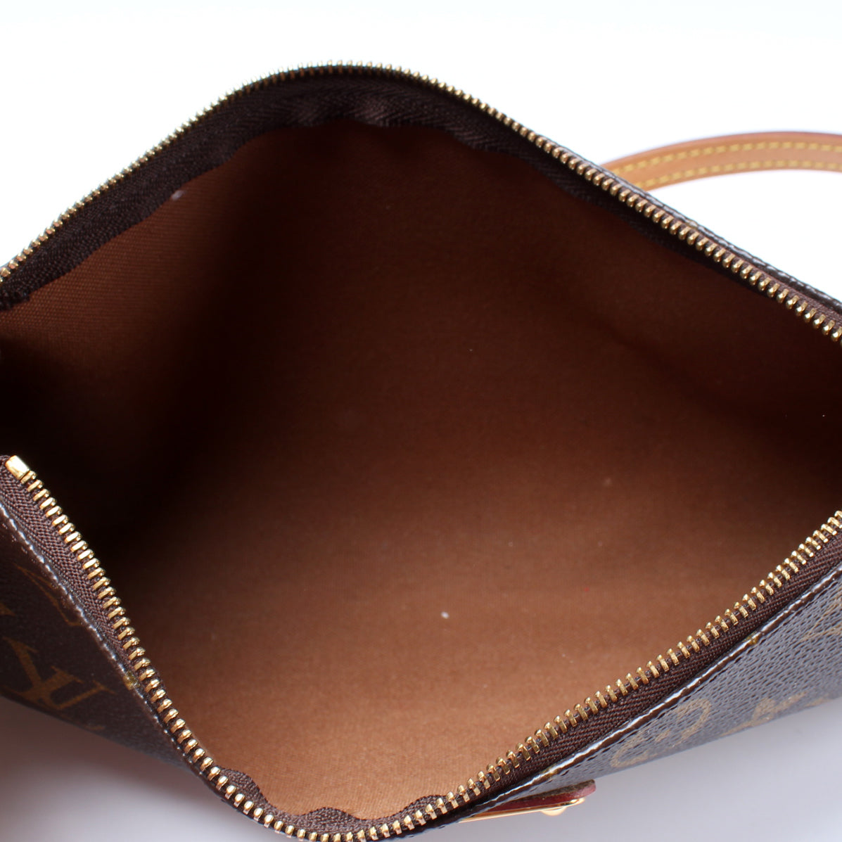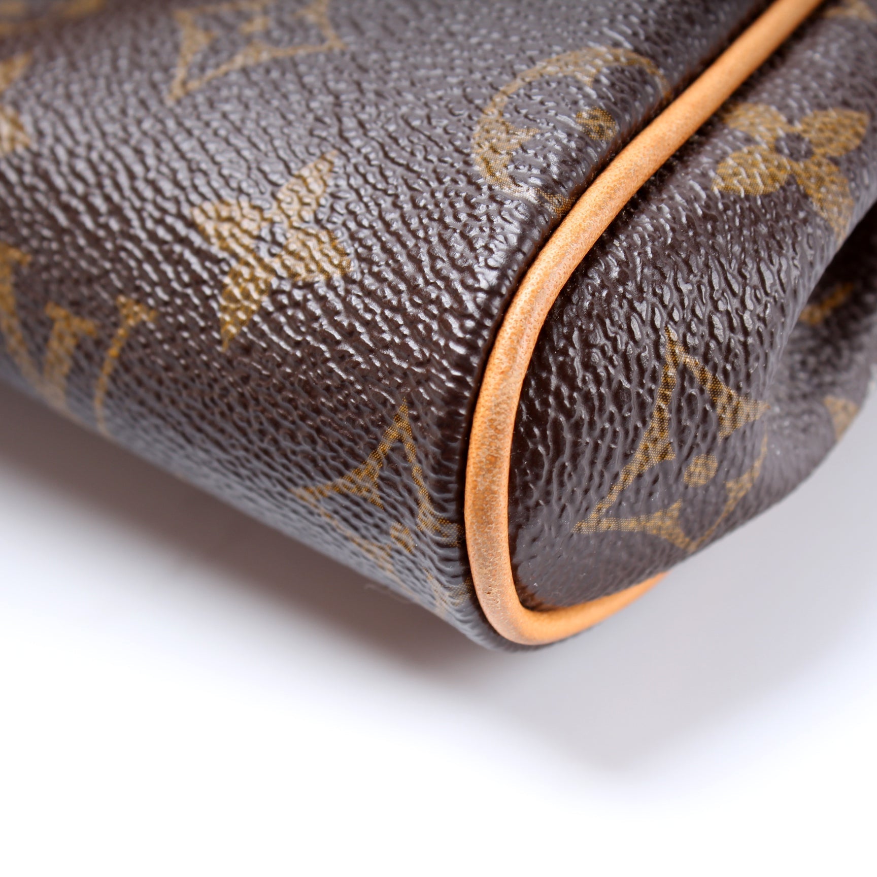Exterior: The exterior coated canvas is free of any rips or cracks. The leather trim shows minor wear and discoloration.