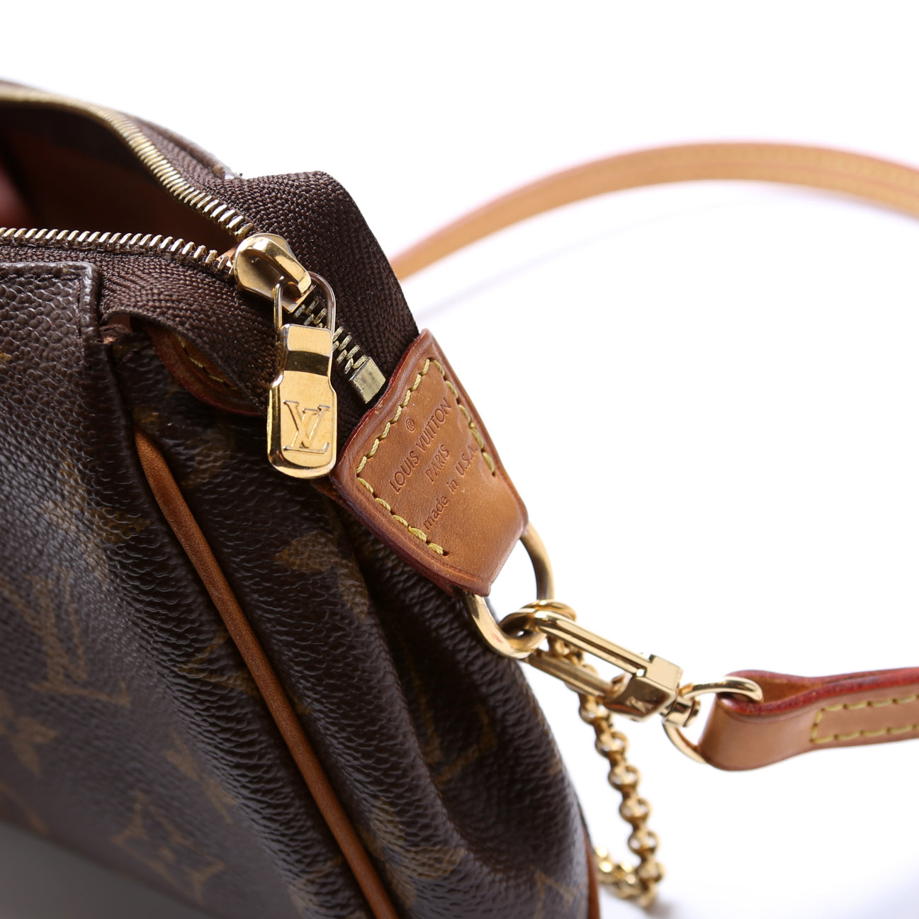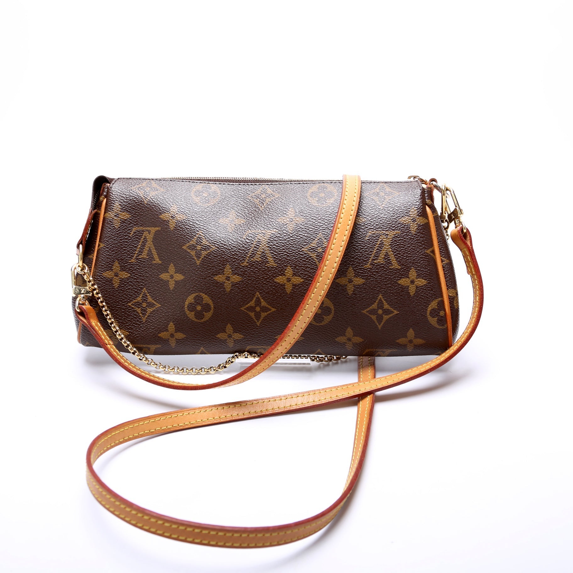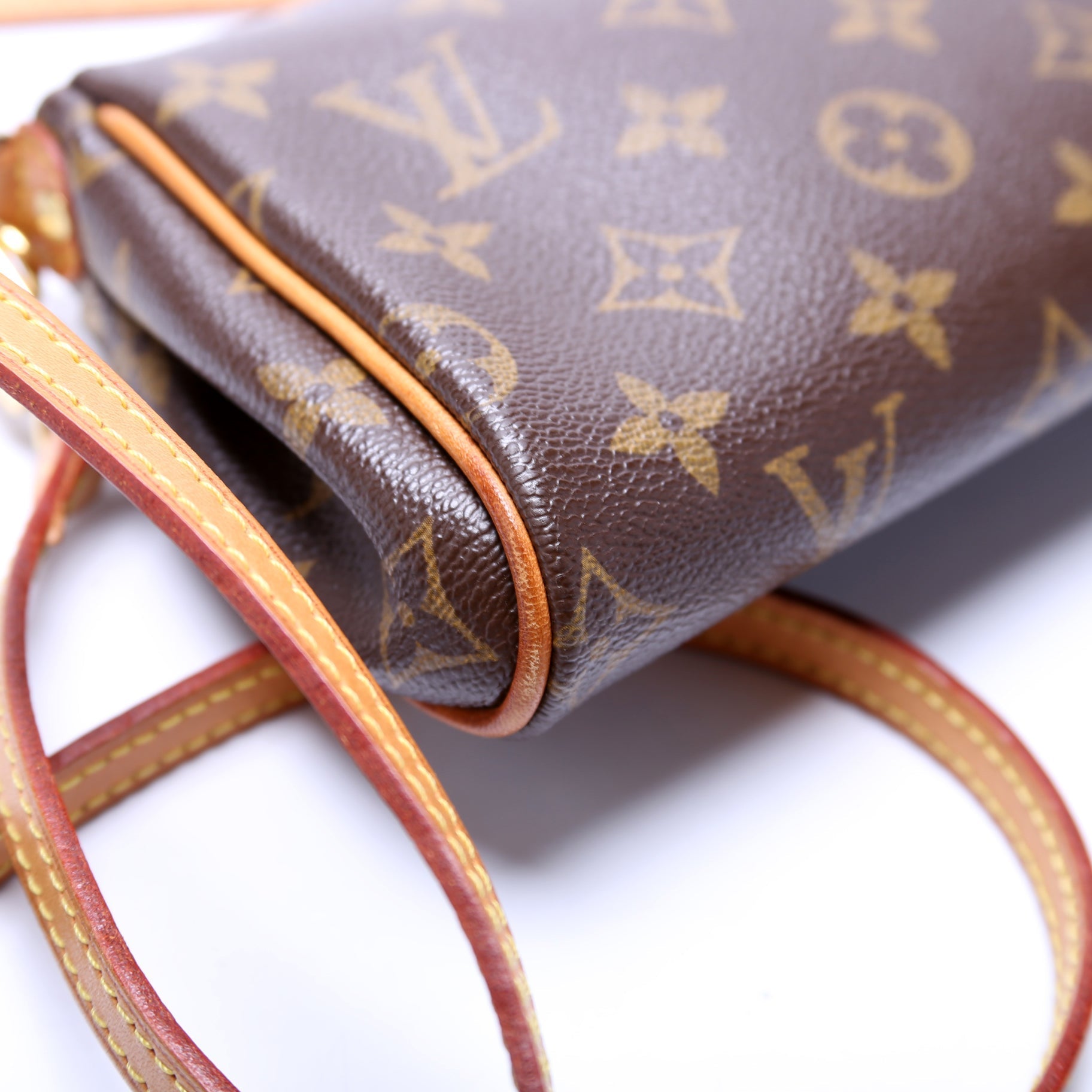 This Louis Vuitton Eva Clutchis eye catching bag. The exterior is in the classic monogram coated canvas.