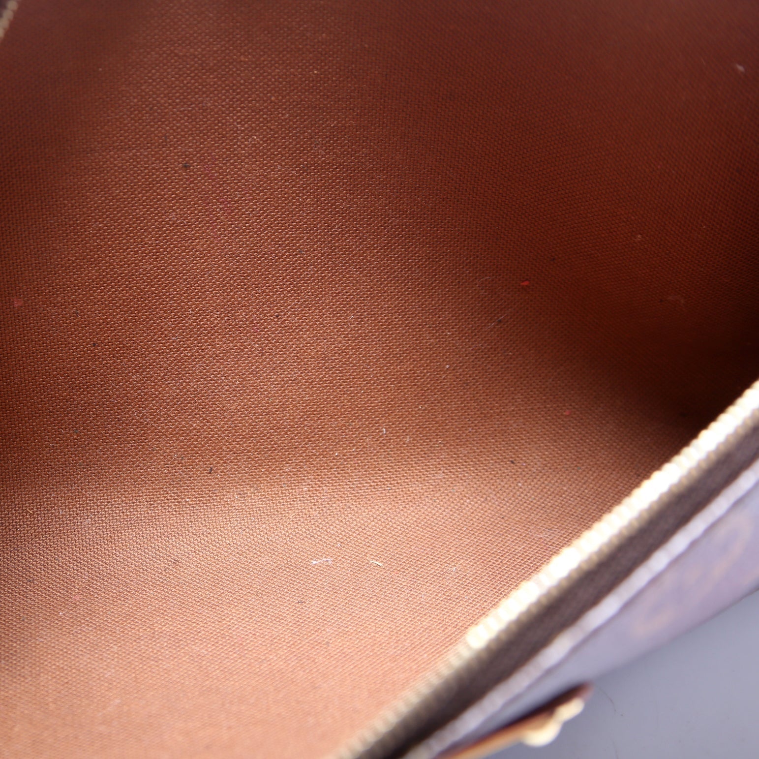 Exterior: The exterior coated canvas is free of any rips or cracks. The leather trim shows minor wear and rubbing.