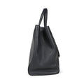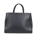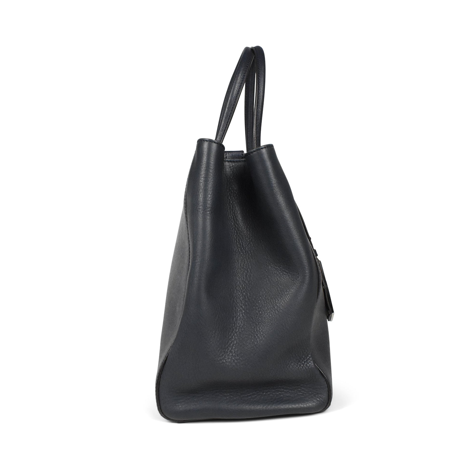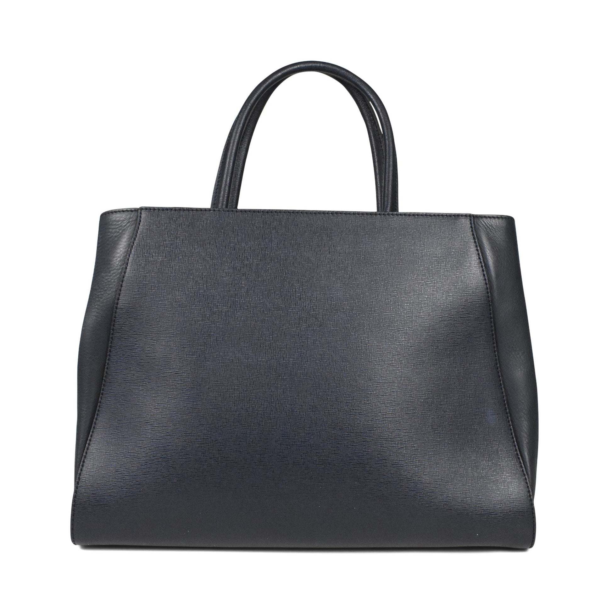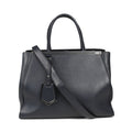Fendi '2Jours' handbag in navy grained leather with dual rolled top handles, a removable crossbody strap, and a top snap closure in silver hardware. The front of the bag features a silver metal trim with a blue enamel inlay and a removable keychain attachment. The interior is lined with blue suede and has dual storage compartments with a large centre zip pocket.
