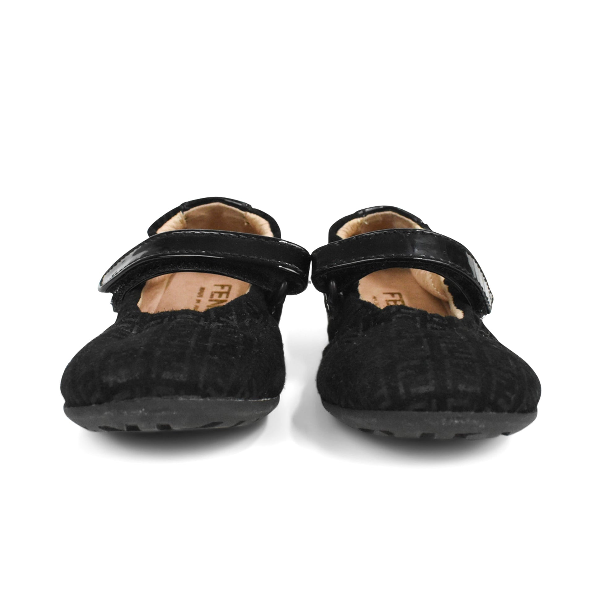 Fendi ballet flats in black monogram suede with a black patent velcro strap and beige leather lining.
