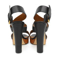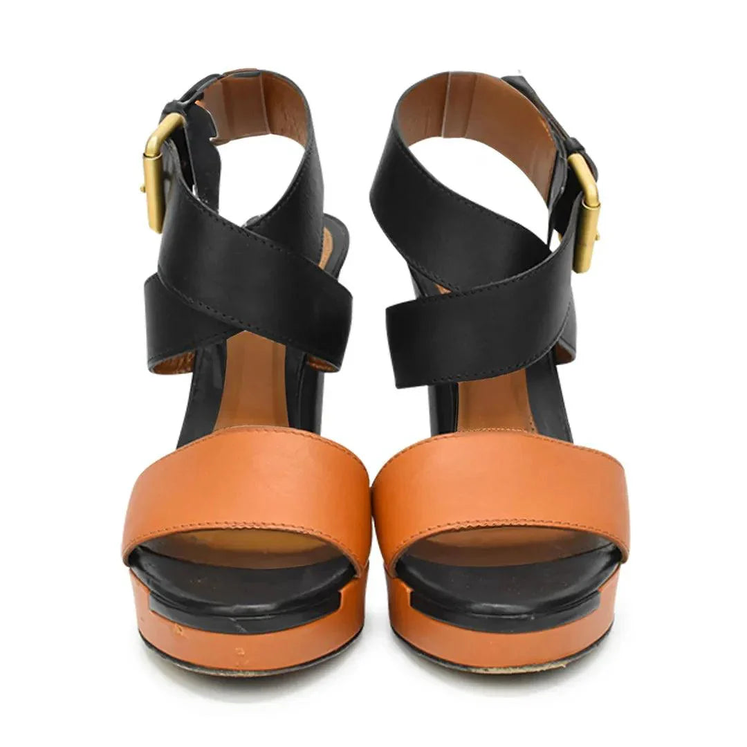 Fendi sandal heels in two-toned black and brown leather with an ankle strap buckle closure in gold hardware.